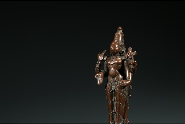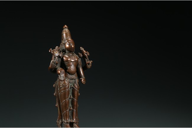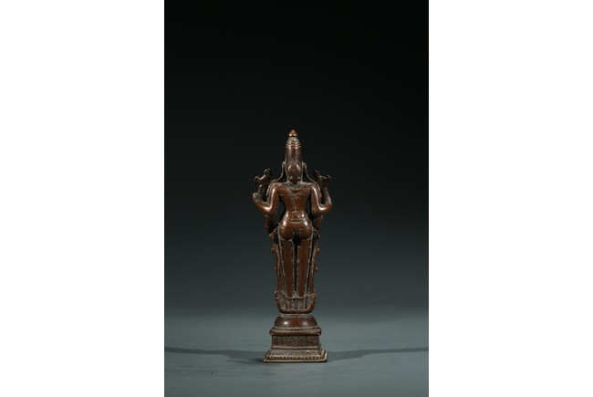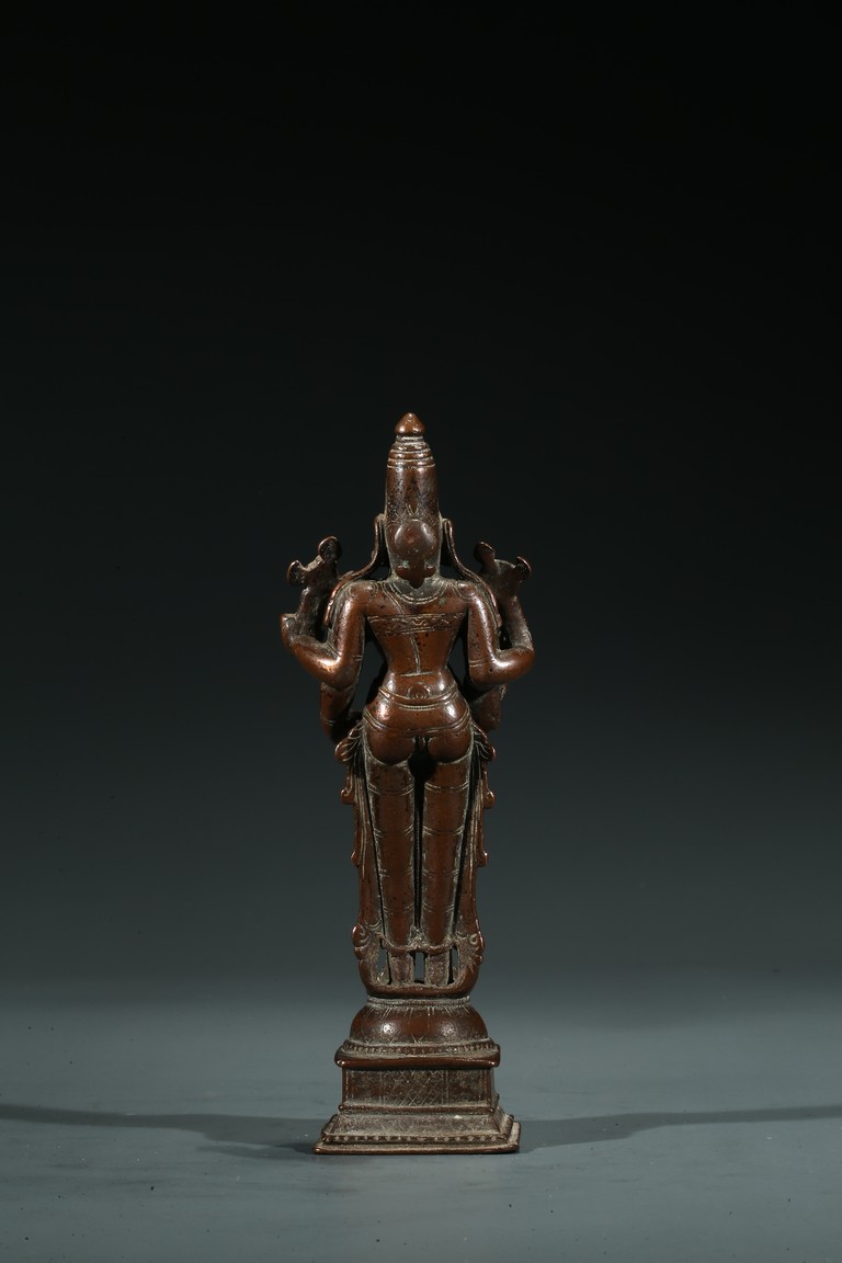 濕婆神是印度教三大主神中的毀滅之神,在此處的破壞並非負面之意,而是創造-保護-毀滅,事物由生至滅的自然迴圈。濕婆也是舞蹈之神,當他跳毀滅之舞時,也同時是創造之舞,世界為之毀滅然後再生。此像頭戴髮冠,濕婆左右手執三叉戟,下面的右手略垂,作與願印,左手緊握,向其供奉者賜予平安。雙腳呈立式,腳踏束腰蓮座。