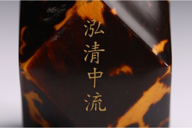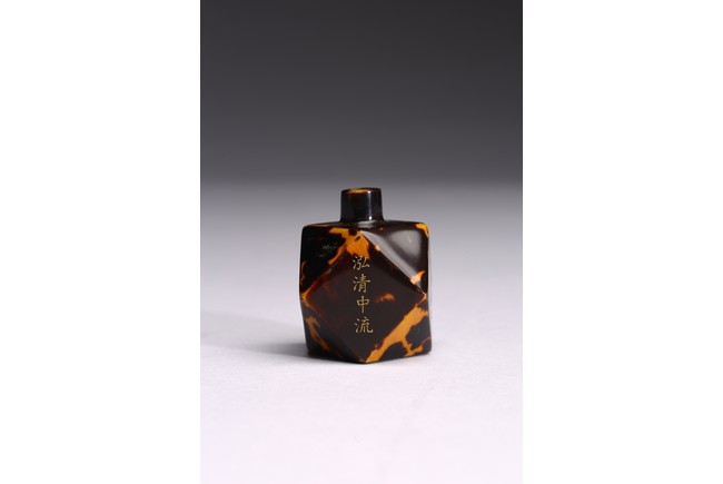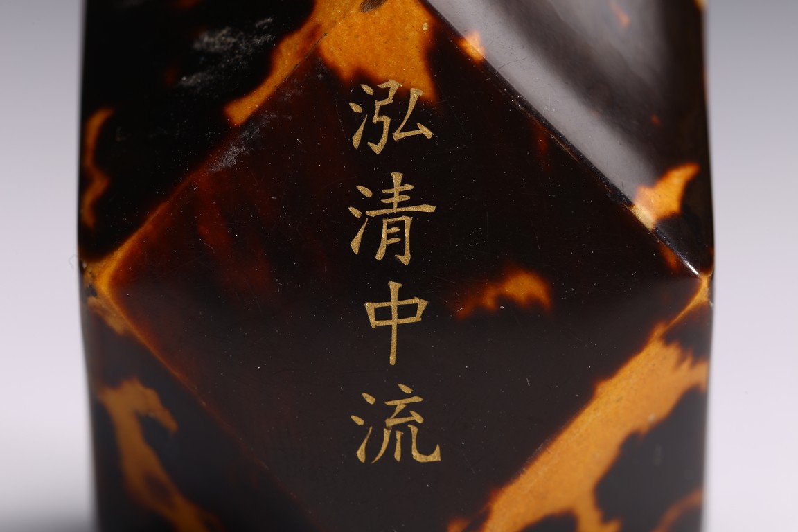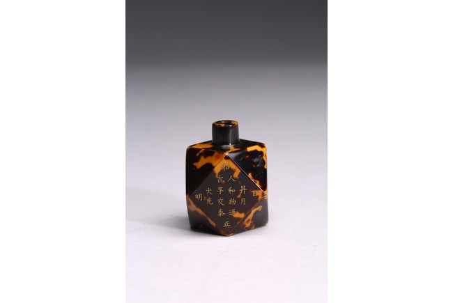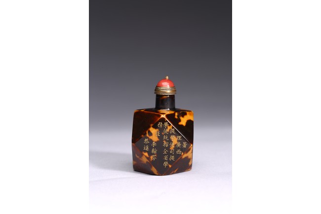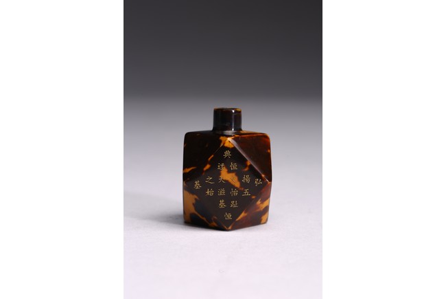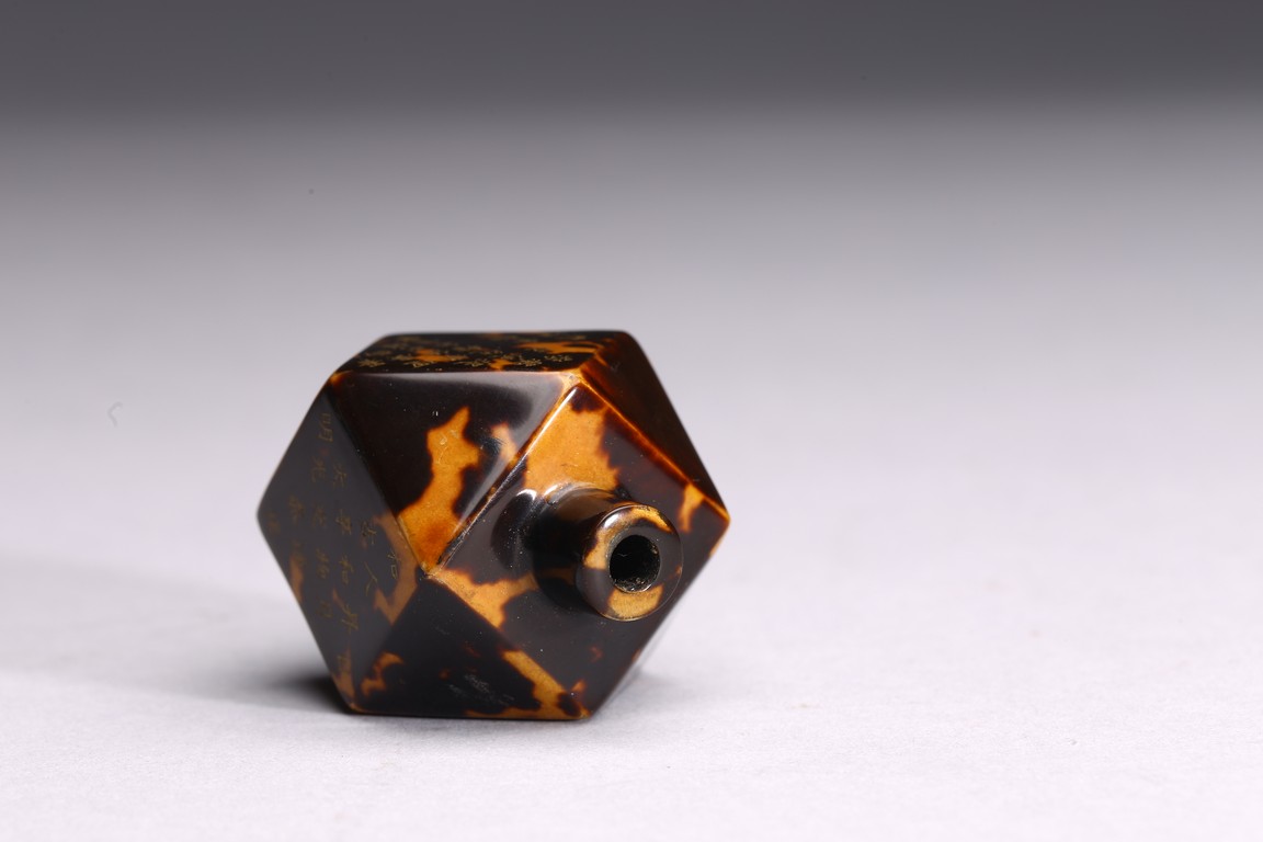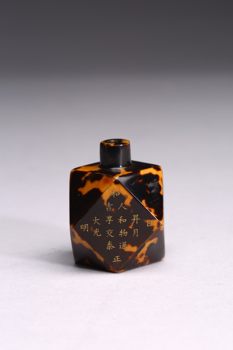 The multi-faceted bottle carved out of a tortoiseshell, each facet inscribed in gilt with inscription and poems, the base inscribed with four character ' Guang Xu' mark. Qing Dynasty Guangxu period.