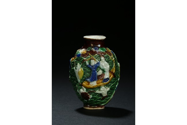 A green glazed moulded figures snuff bottle. Qing Dynasty period.
