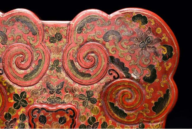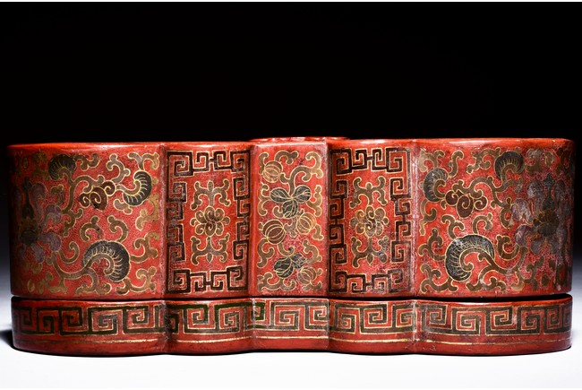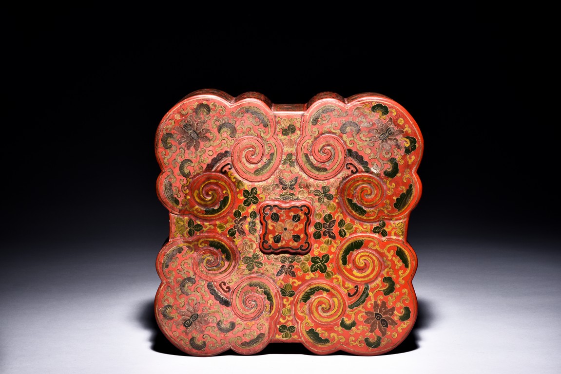 Qing Dynasty period. Of barbed form, the cover overall painted with scrolling floral lotus pattern and leaves in gilt and green against red lacquer ground, the box further decorated with a band of key-fret pattern.