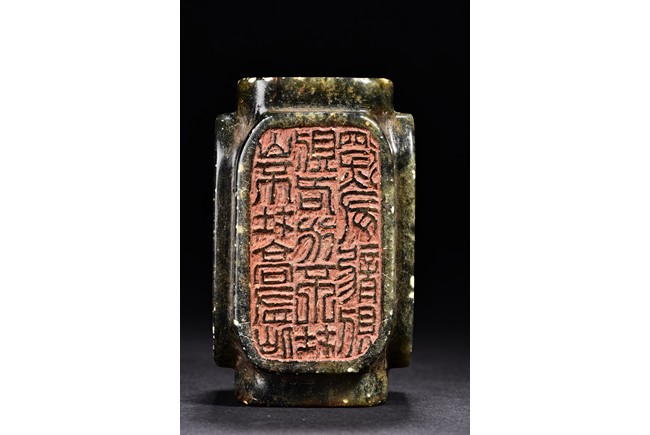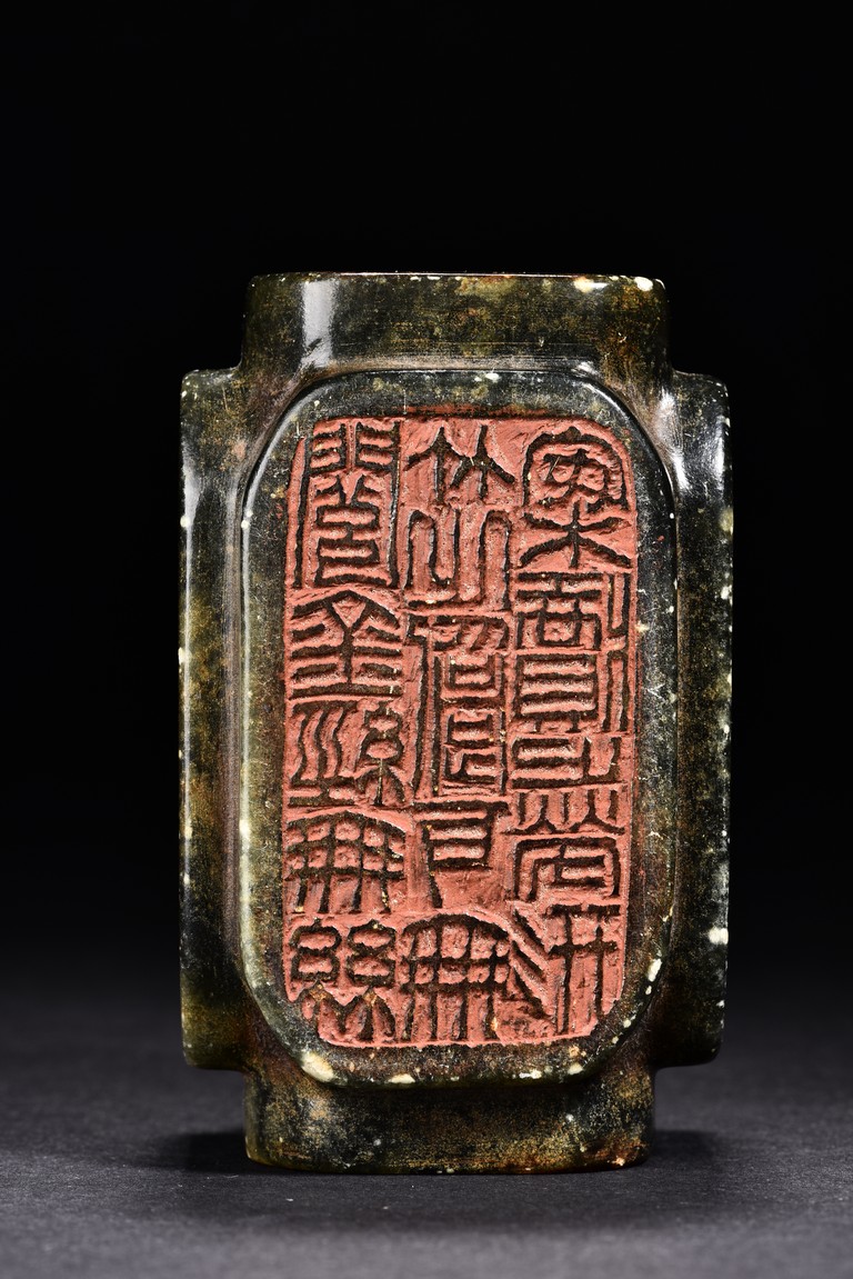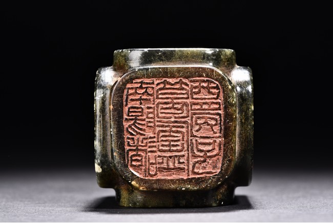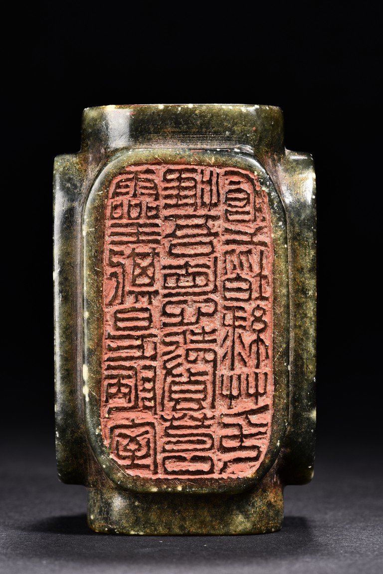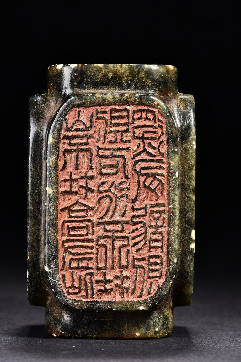 Qing Dynasty period. Of rectangular form, the seal is carved on with characters mark in seal script on each side, the stone is of semi-translucent mottled dark spinach tone.