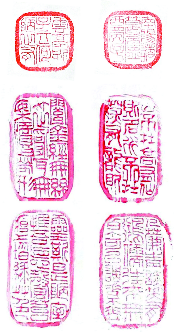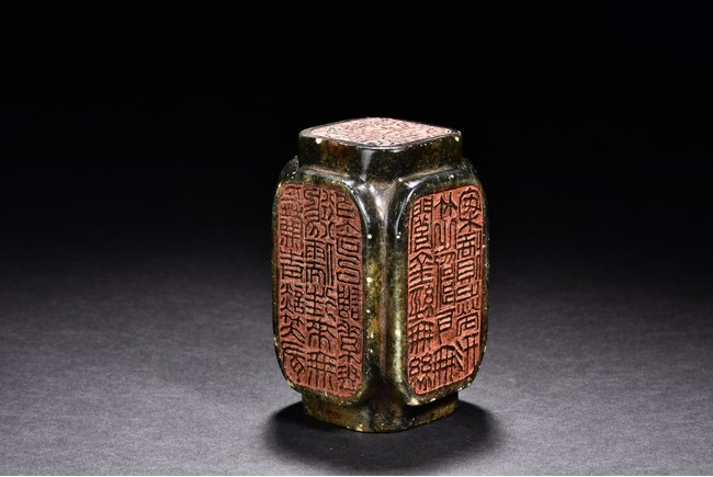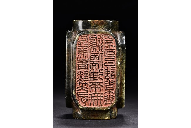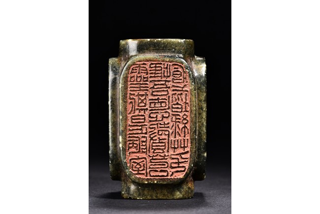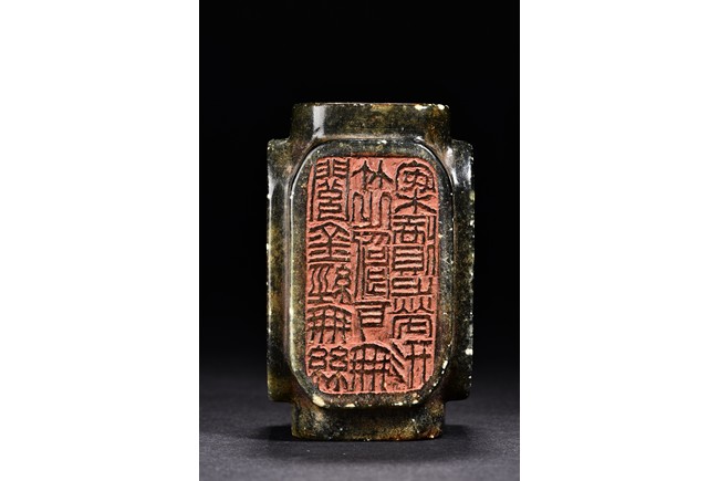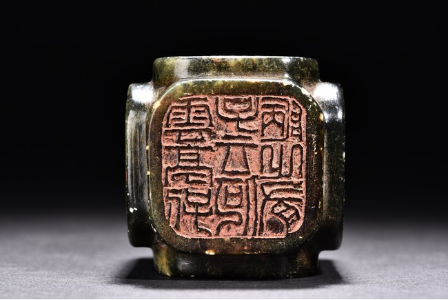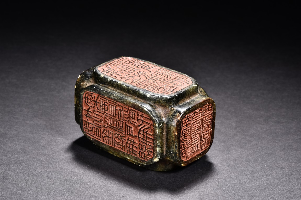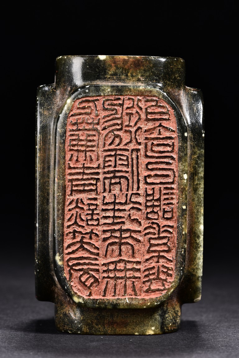 Qing Dynasty period. Of rectangular form, the seal is carved on with characters mark in seal script on each side, the stone is of semi-translucent mottled dark spinach tone.