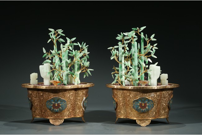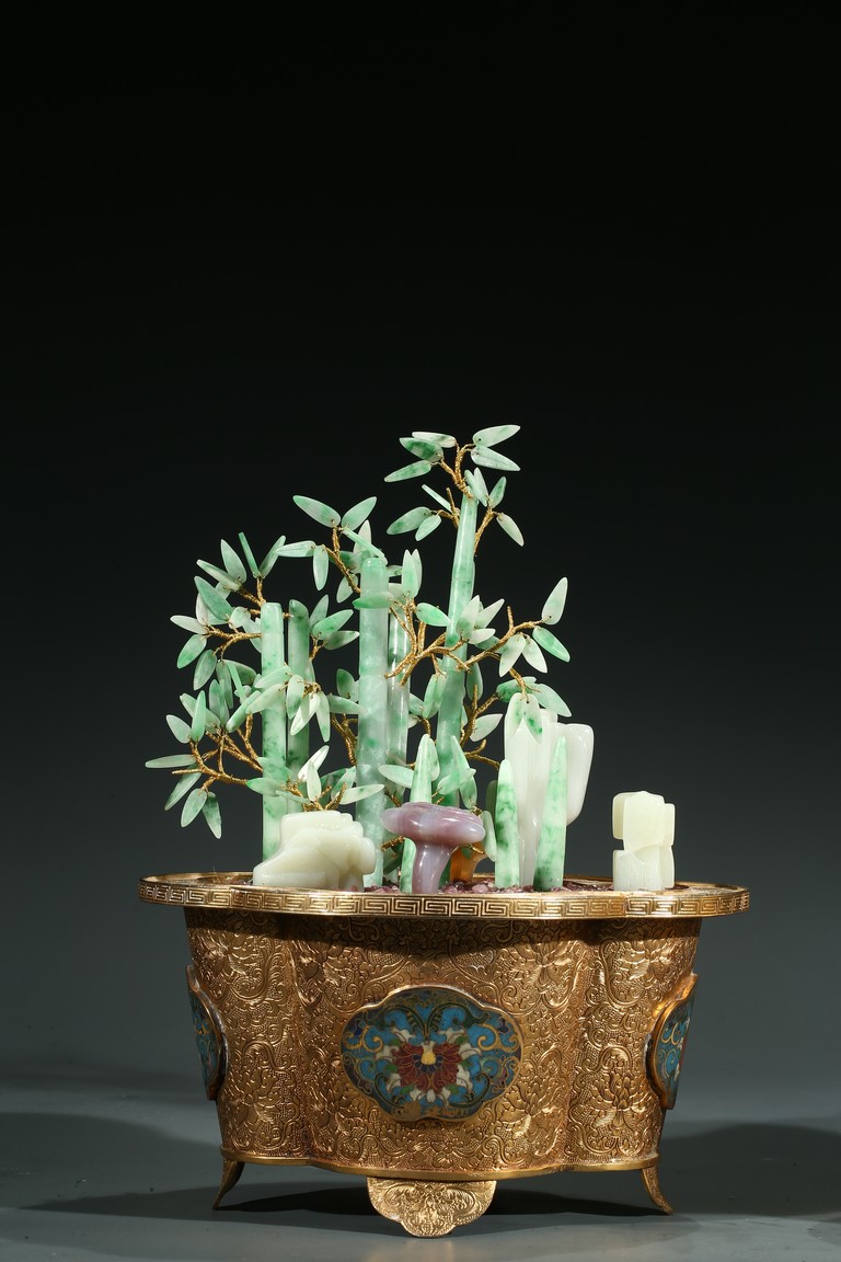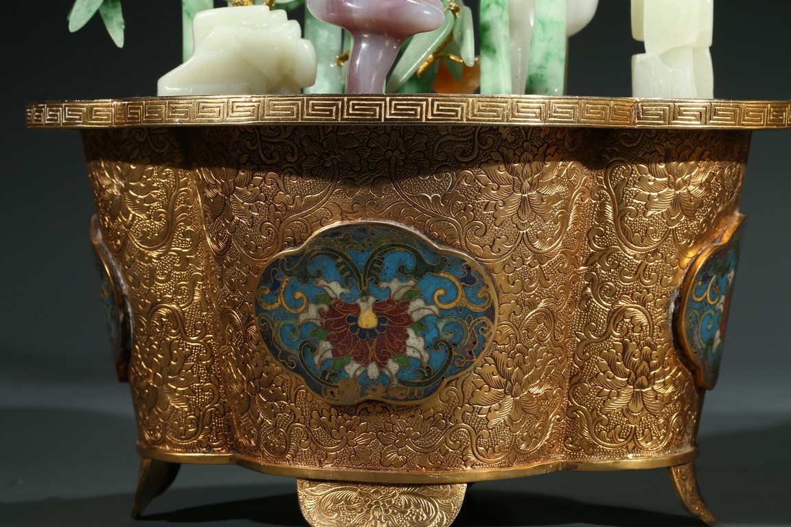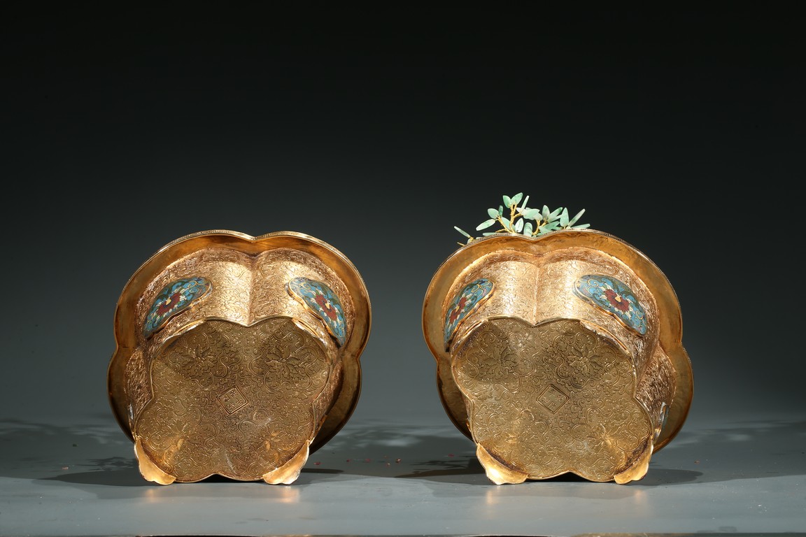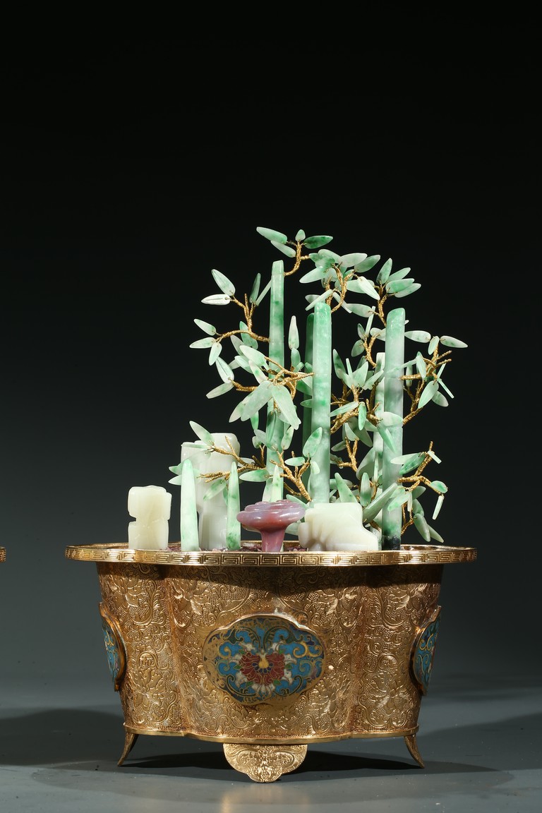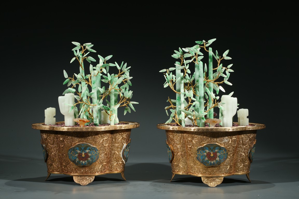 Each jardiniere is of lobed form, the body inlaid with ruyi shaped cloisonne enamel panels, reserved on ground of engraved foliate scroll pattern, planted with jadeite carved bamboos, white jade carved rockworks, and agate lingzhi, the base with four character Qianlong mark.