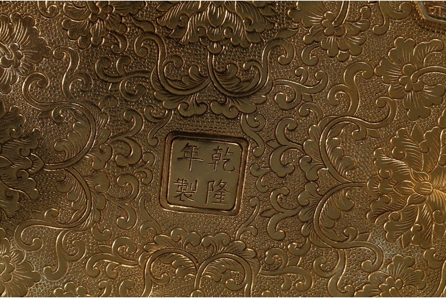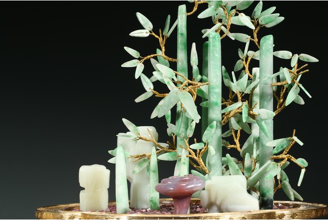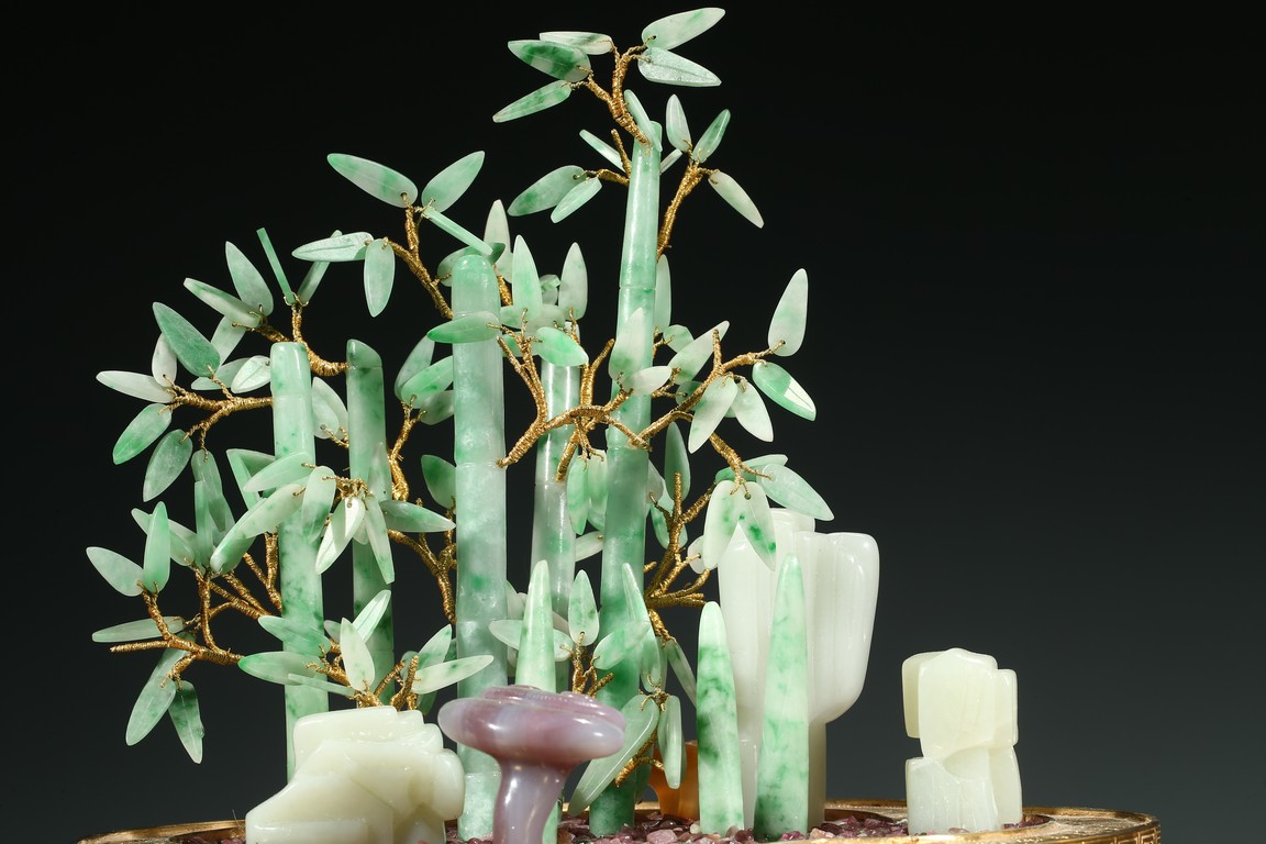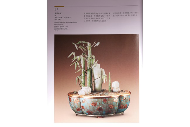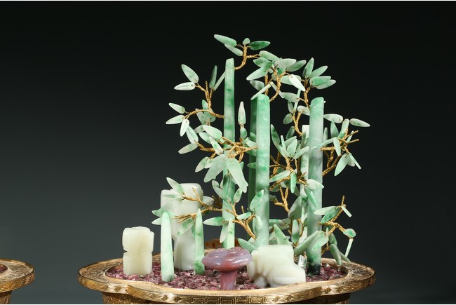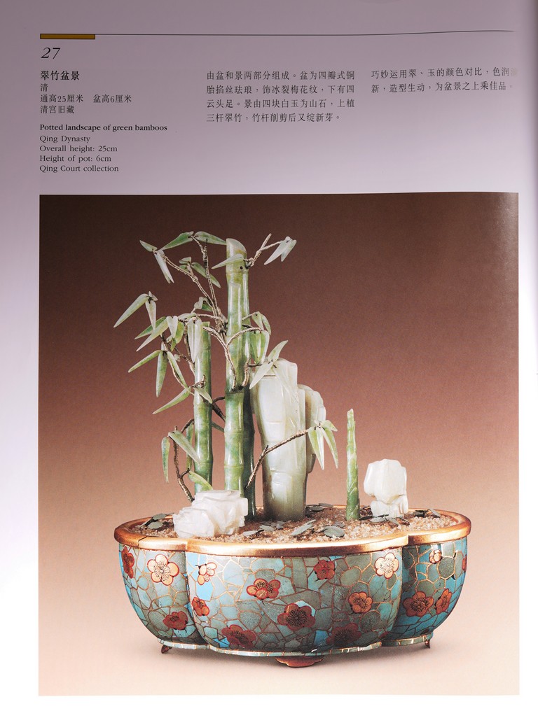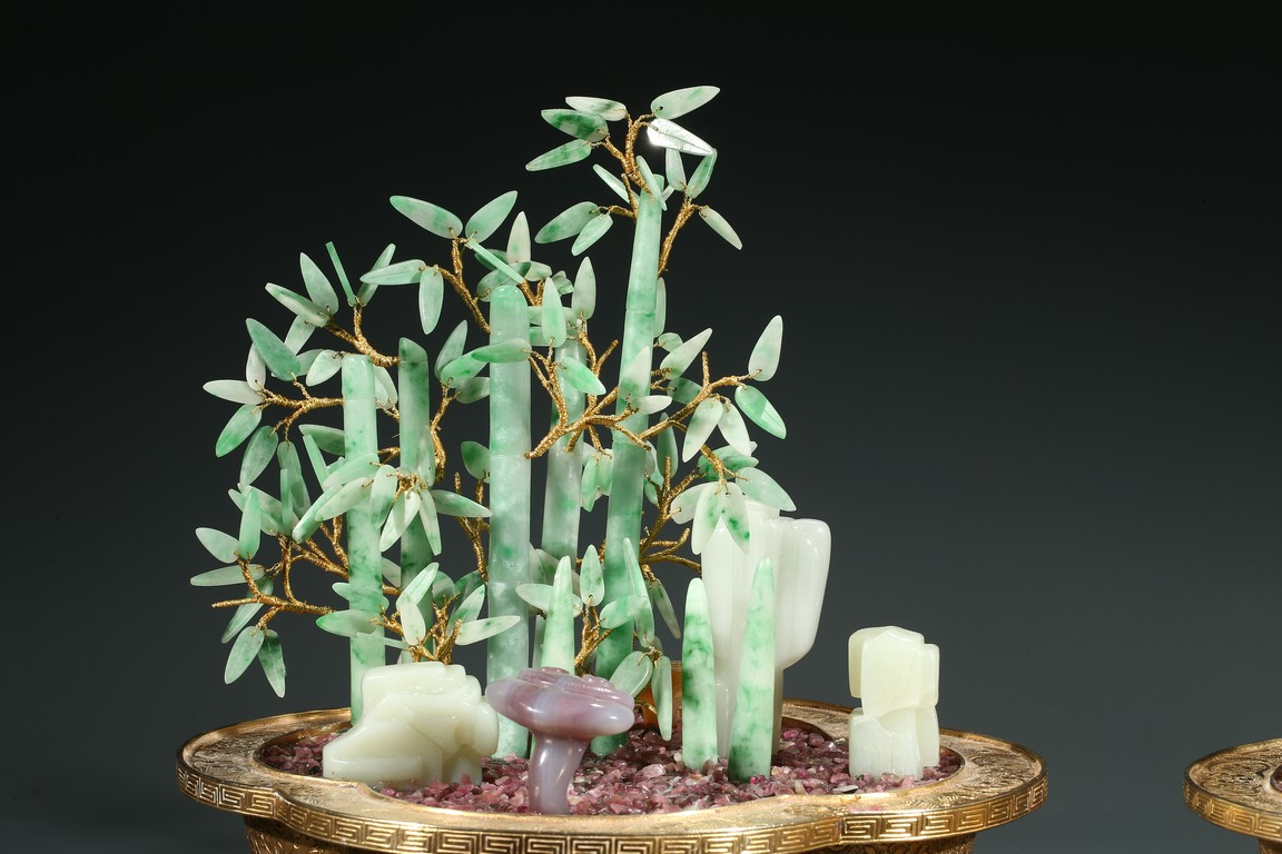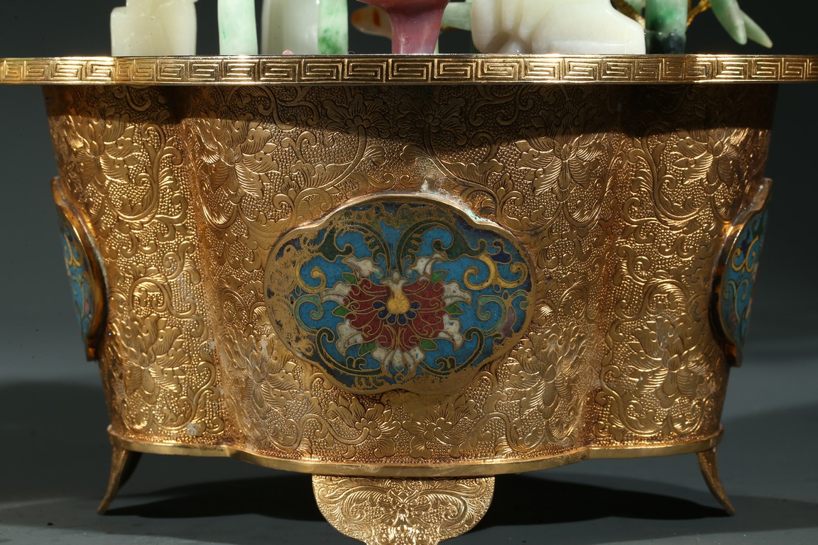 Each jardiniere is of lobed form, the body inlaid with ruyi shaped cloisonne enamel panels, reserved on ground of engraved foliate scroll pattern, planted with jadeite carved bamboos, white jade carved rockworks, and agate lingzhi, the base with four character Qianlong mark.