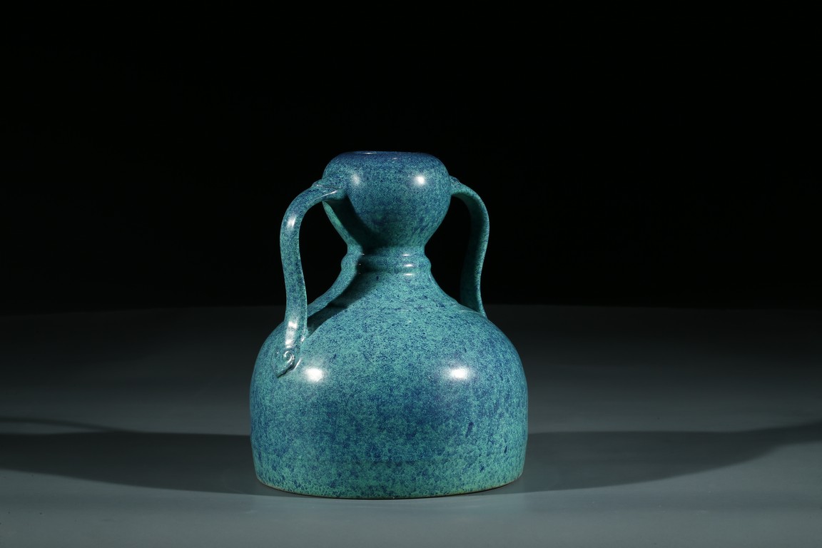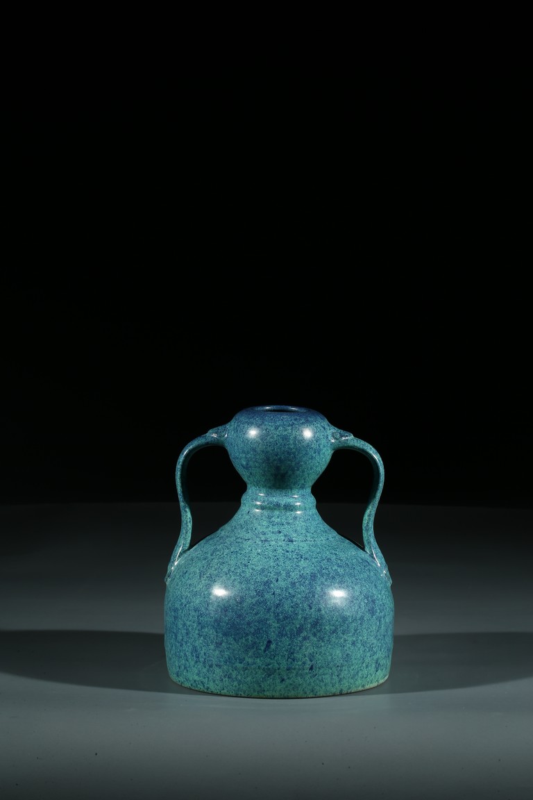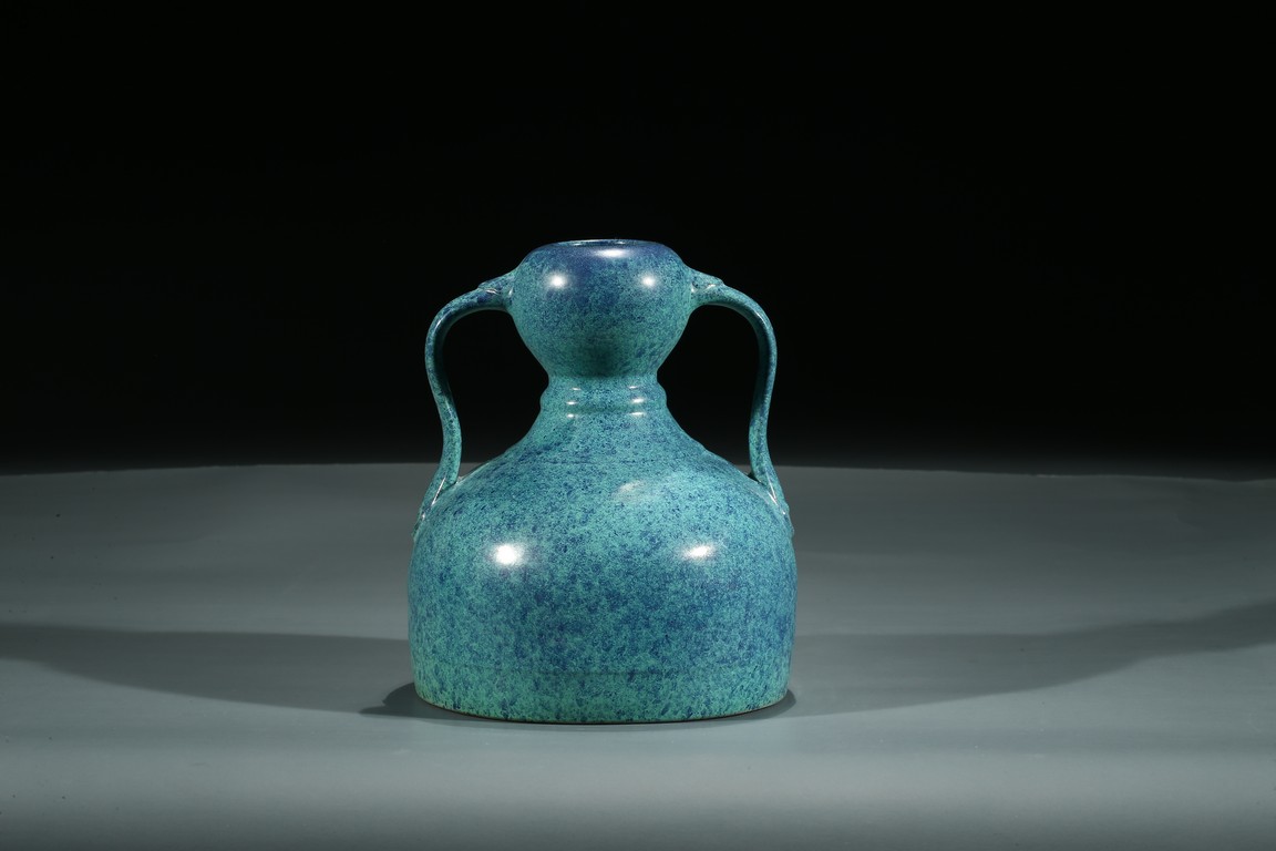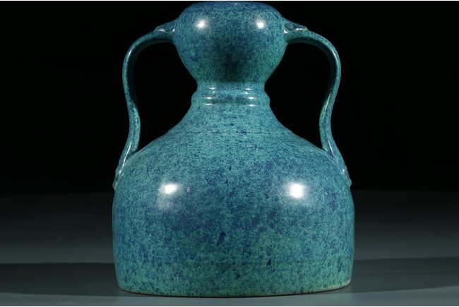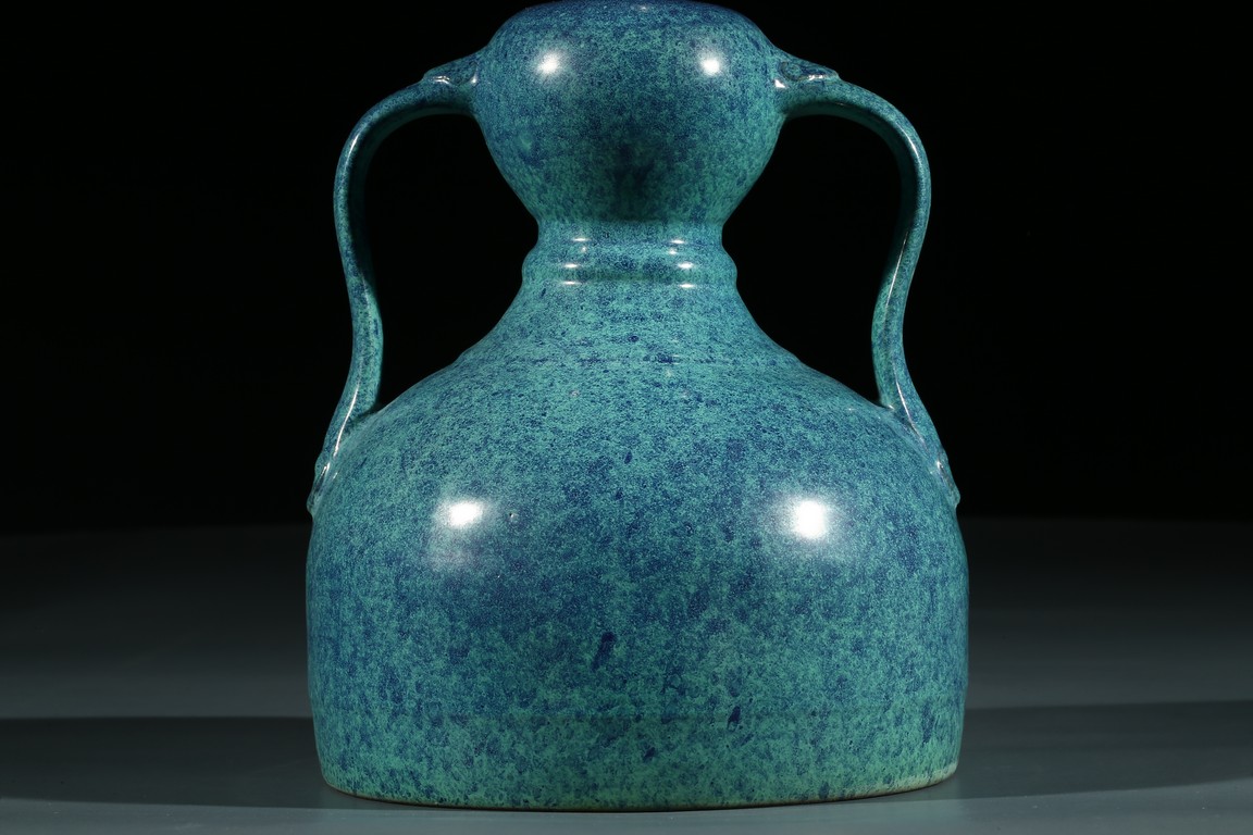 Qing Dynasty Qianlong period. Elegantly potted of double-gourd form with a semi globular lower bulb rising to a waisted neck and a smaller upper bulb with an incurved rim, the mouth flanked by a pair of arched ruyi-shaped handles attached to the shoulders on the lower bulb, overall covered in attractive mottled dark blue and turquoise glaze, the base with six character Qianlong mark.
