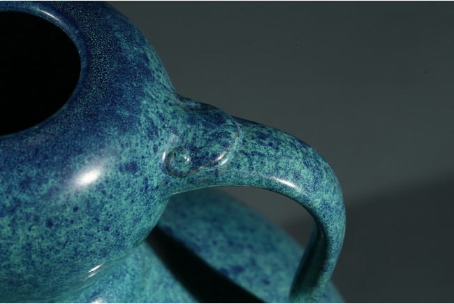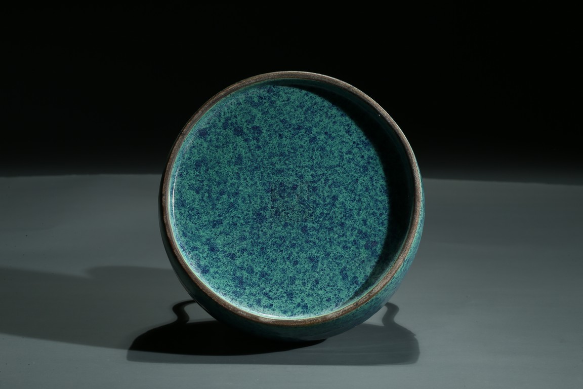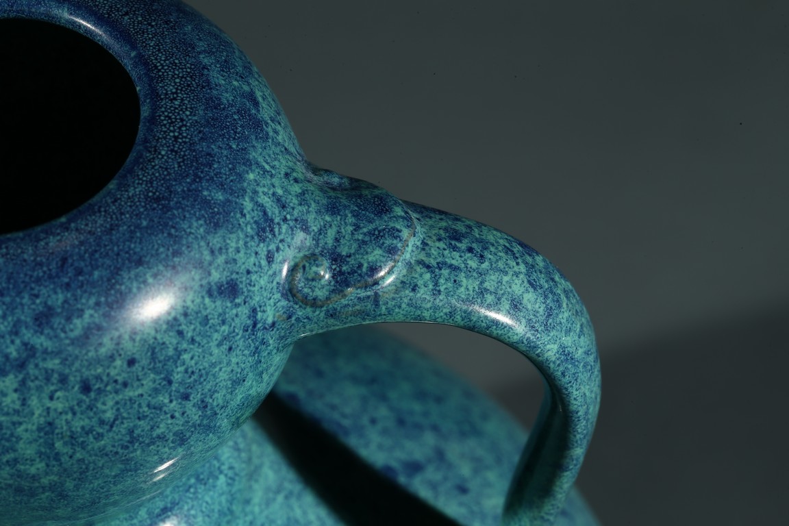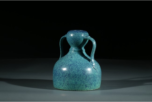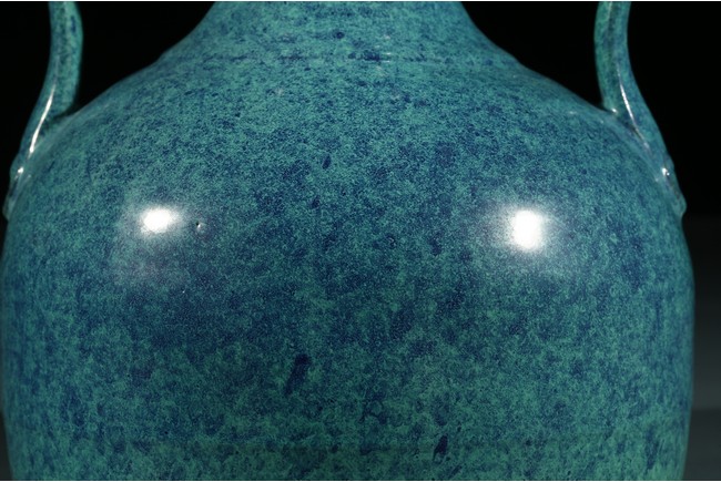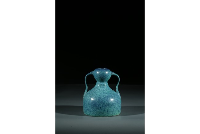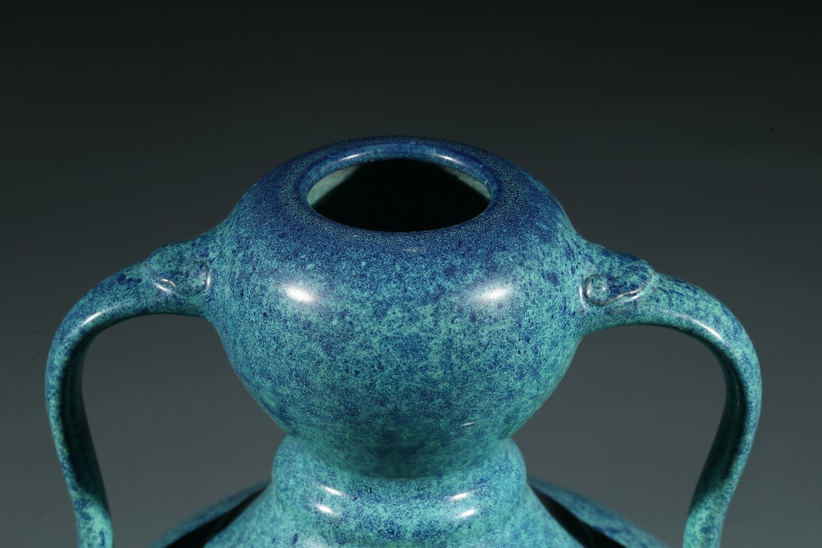 Qing Dynasty Qianlong period. Elegantly potted of double-gourd form with a semi globular lower bulb rising to a waisted neck and a smaller upper bulb with an incurved rim, the mouth flanked by a pair of arched ruyi-shaped handles attached to the shoulders on the lower bulb, overall covered in attractive mottled dark blue and turquoise glaze, the base with six character Qianlong mark.