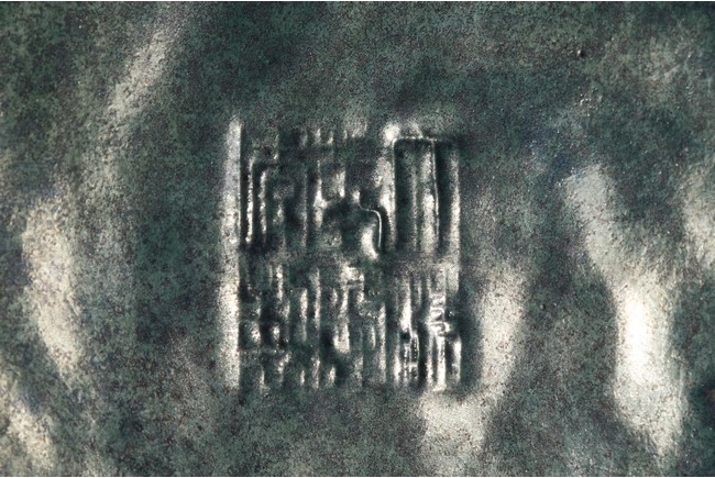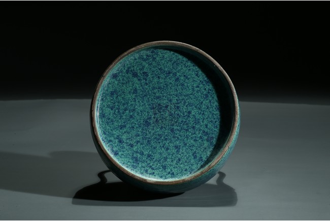 本品斂口,形似蒜頭,口沿及上部呈圓形,束頸,溜肩,中間束腰類似葫蘆,兩側對稱置彎曲的如意形耳以連接上下部,下腹部渾圓,精美大氣,廣底,淺圈足。通體施爐鈞釉,釉面失透滋潤,釉色深沉,流淌的綠釉交混點點紅斑,似山嵐雲氣,斑駁陸離,於烈焰中幻化出別樣瑰麗,可令賞者如癡如醉。“大清乾隆年制”款識。