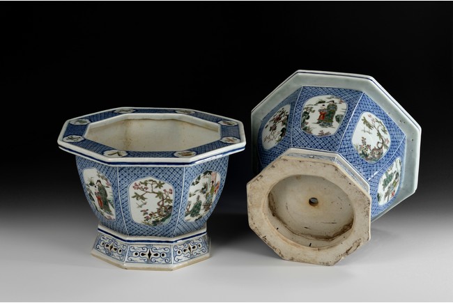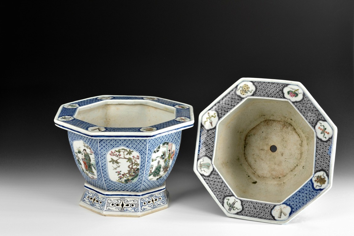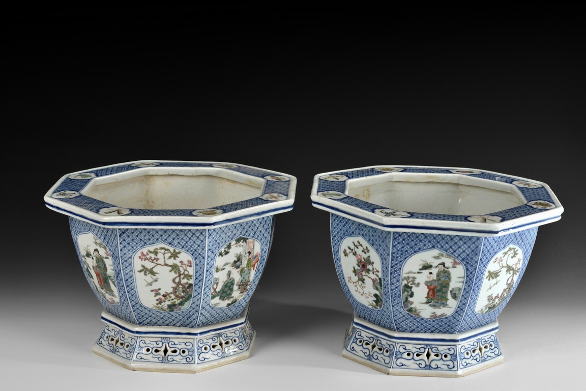 A pair of blue and white planters accentuated with famille rose design of figure and blooming flowers in a garden setting. The pot has a wide rim, decorated with the Buddha's eight treasures. Qing Dynasty period.
