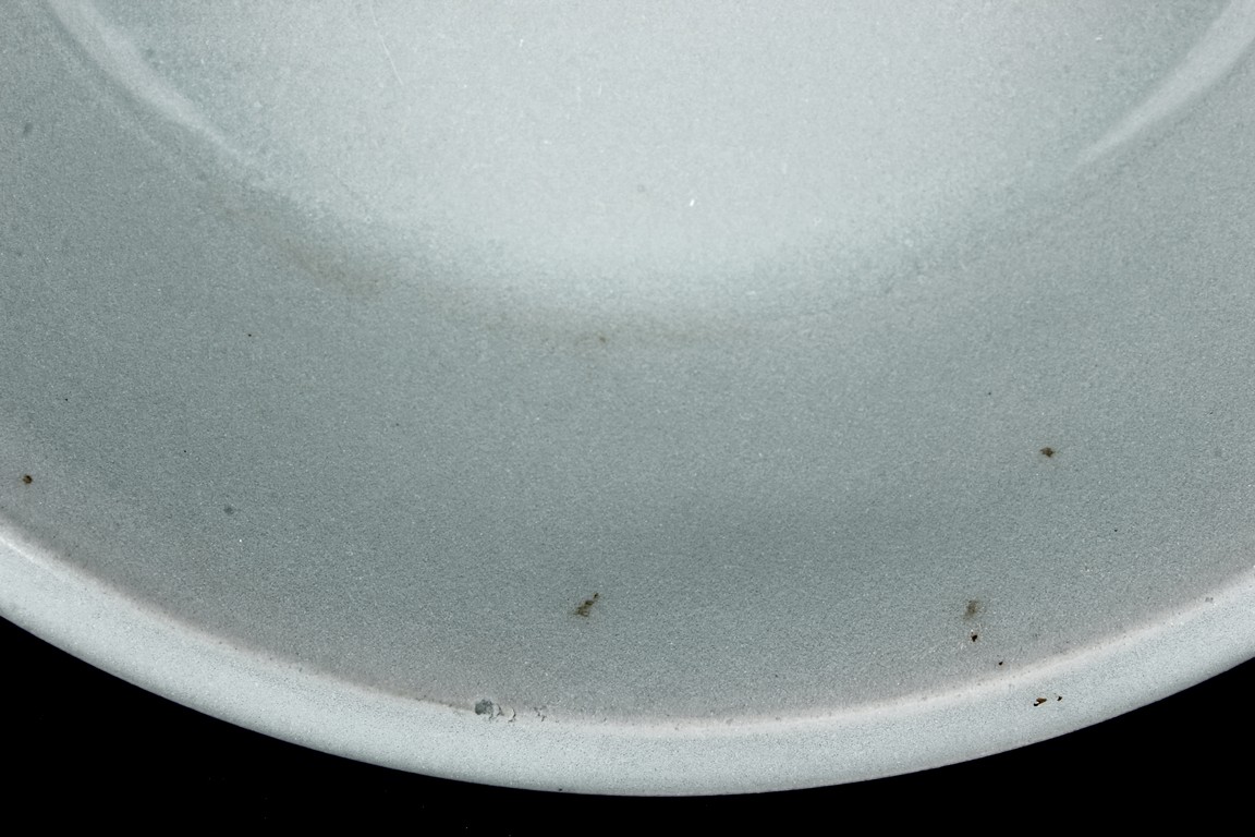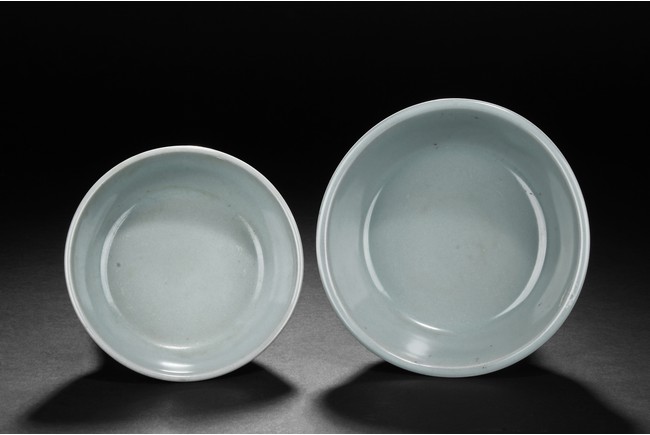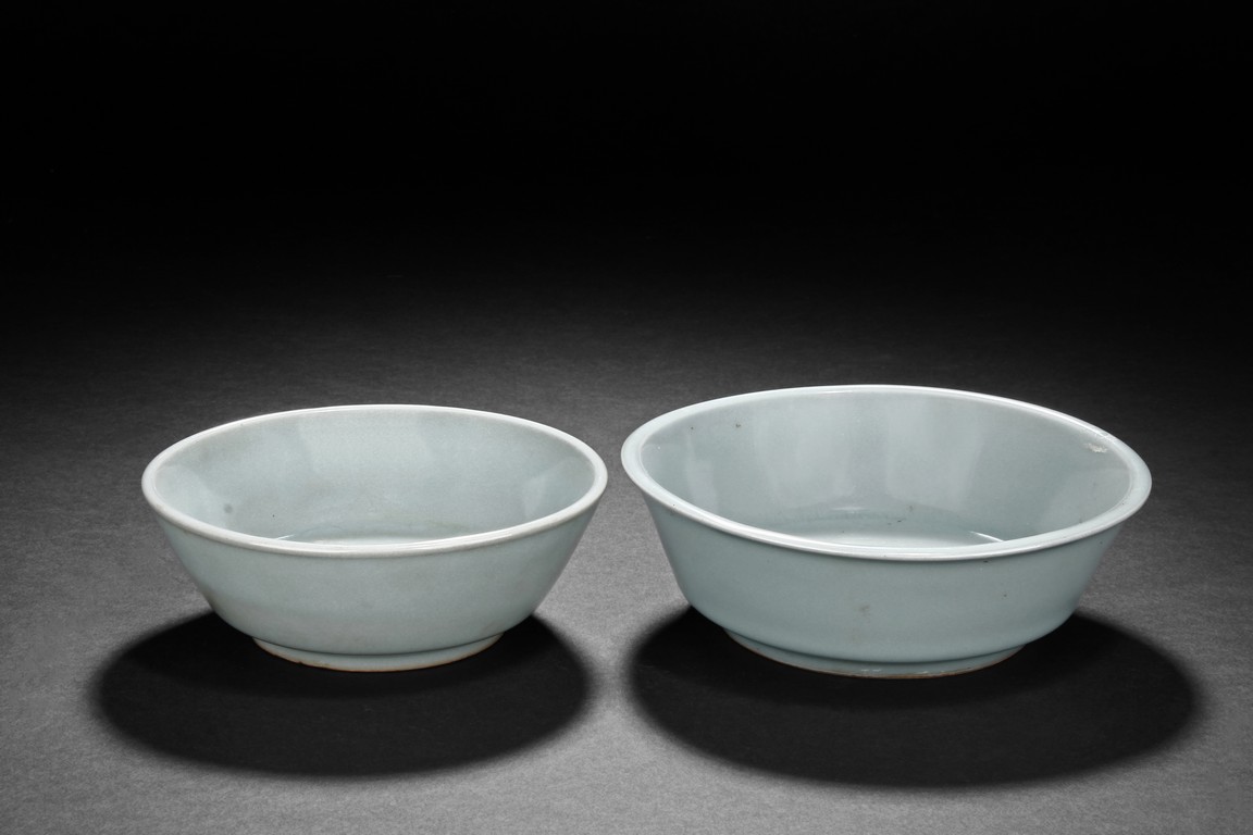 Each bowl is supported on a circular foot ring, with gentle sides rising to a flared rim, the exterior covered overall in a glaze of sky-blue tone.