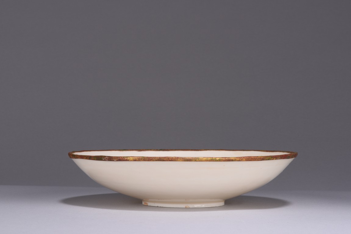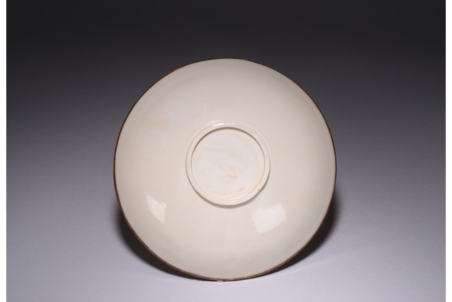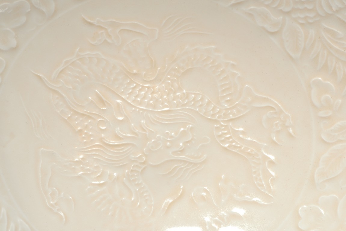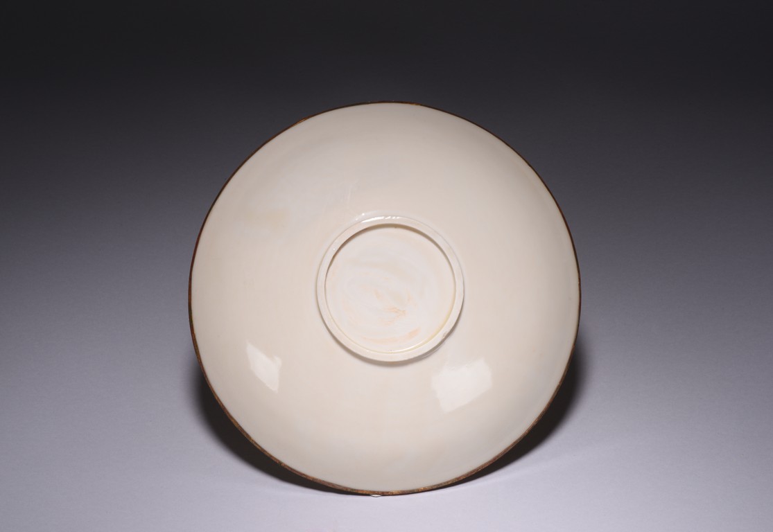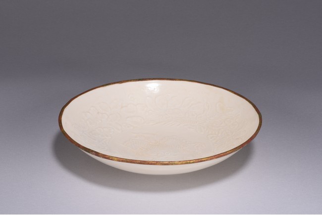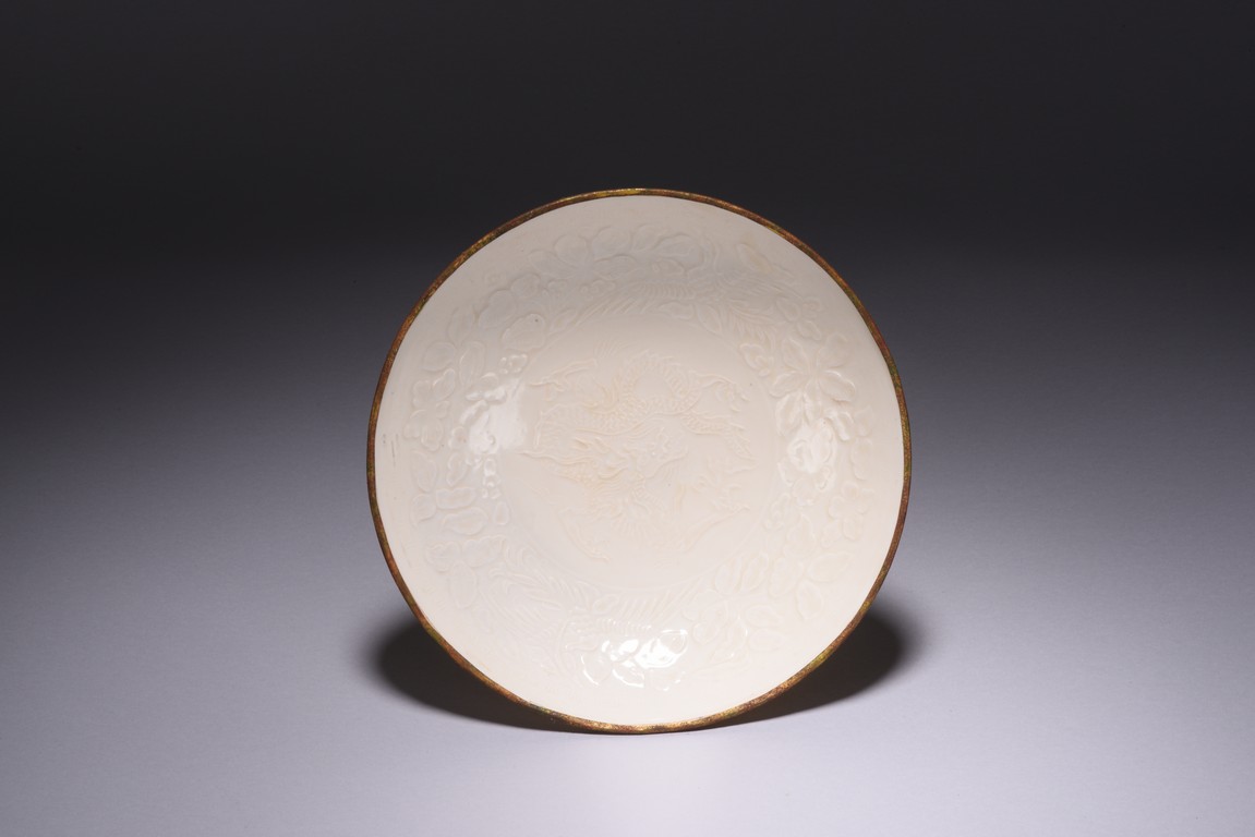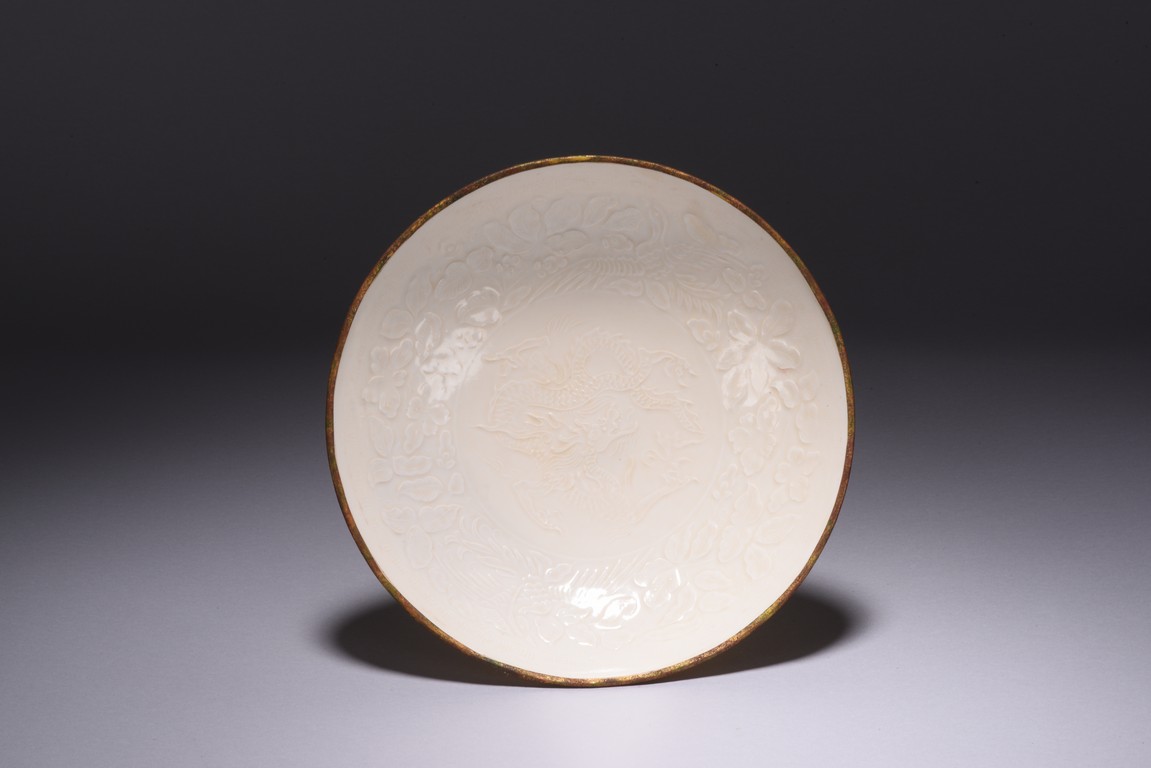 Song Dynasty period. The rounded sides rising from a short straight foot to a copper-bound rim, finely moulded to the interior with a dragon medallion encircled by lotus bands in the well, covered overall with a creamy-white glaze.