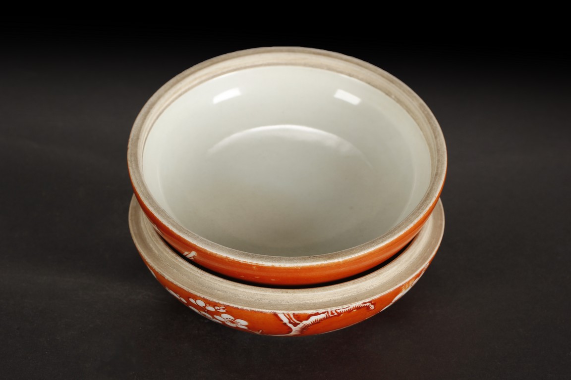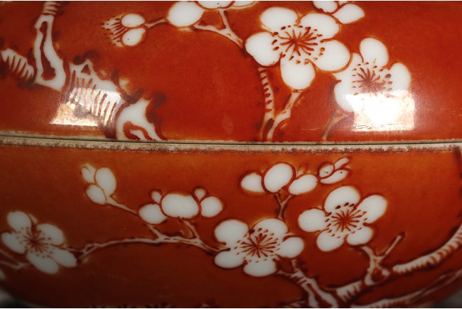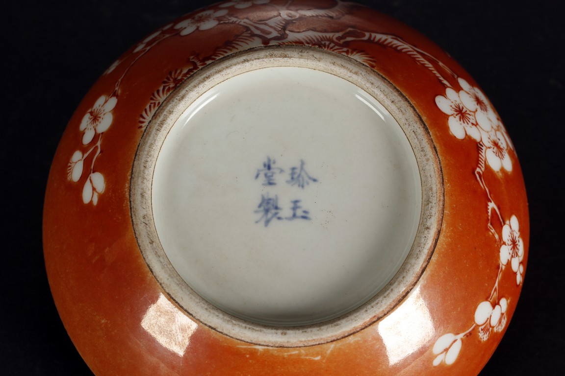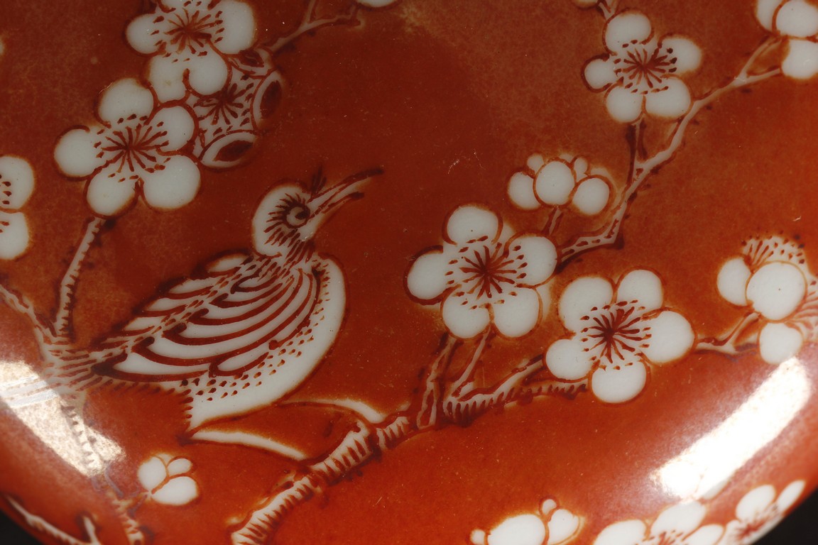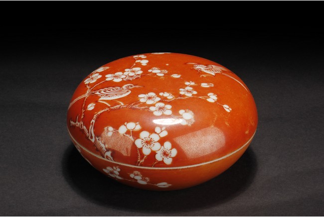 Qing Dynasty period. Of flattened ovoid form, the ink cover box covered in coral red glaze, with a magpie perched on blooming plum tree, and another magpie flying towards it, bottom bears four character 'ZHENYUTANG' mark.