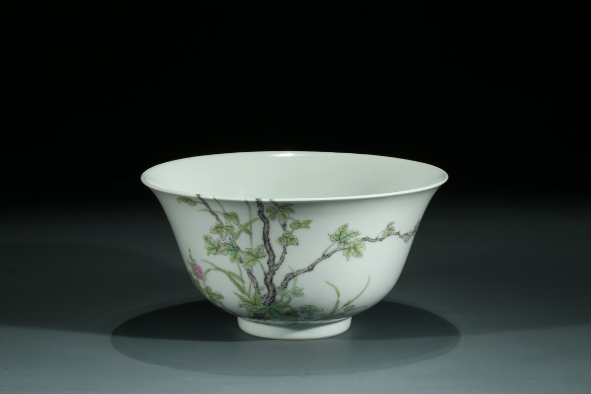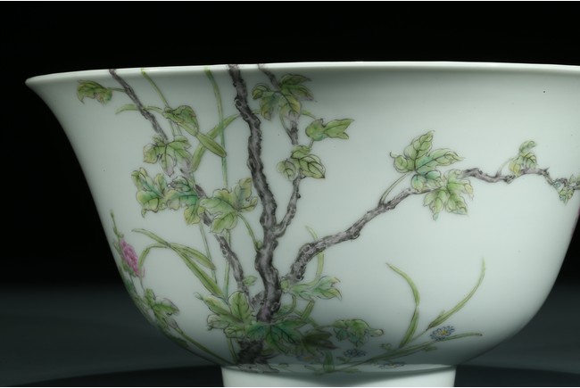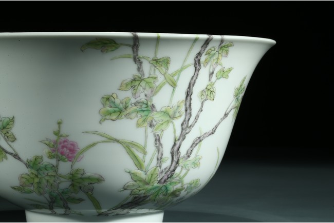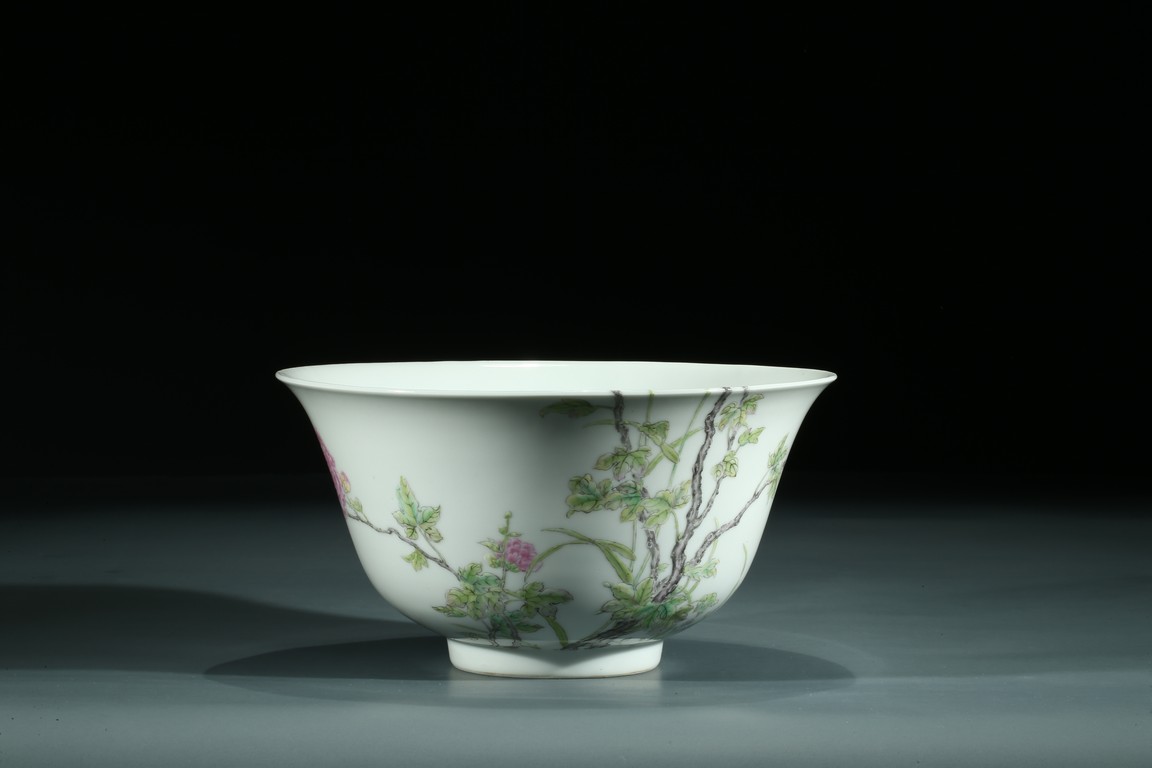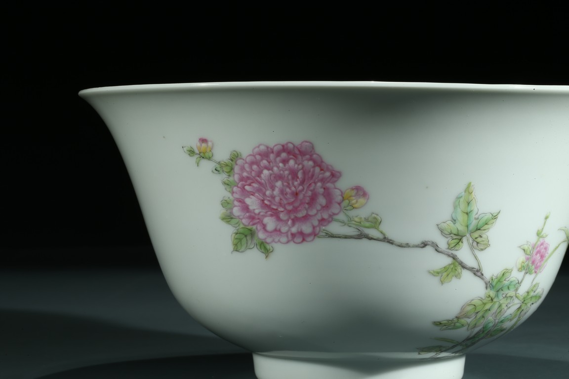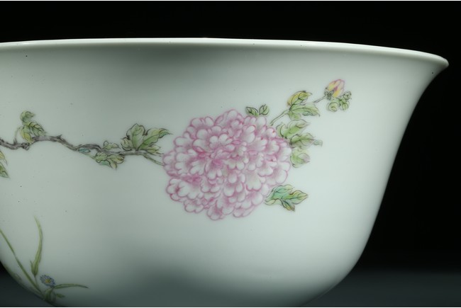 此碗口沿外撇、弧腹、圈足。通體施白釉,以彩繪製折枝花卉紋飾,花卉從外壁一直延伸至內壁,俗稱過牆花。施彩清新淡雅,繪製工藝精湛,構圖設計巧妙,器型規整端莊,體量大,時代特徵明顯,應為皇家御用之器,雍正乾隆兩帝大愛之品種。