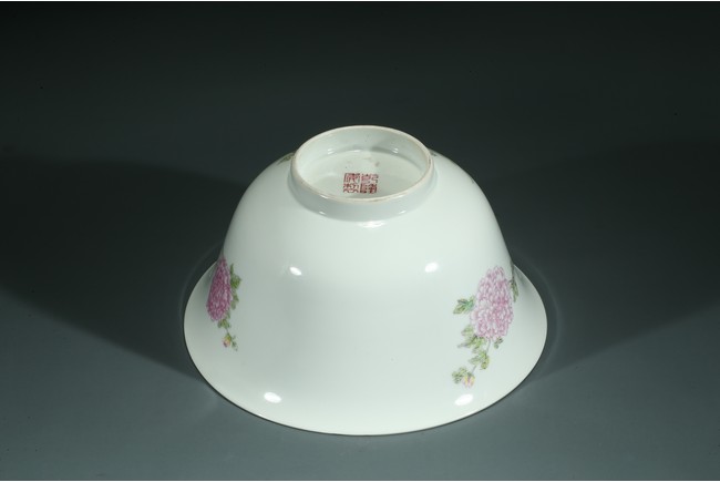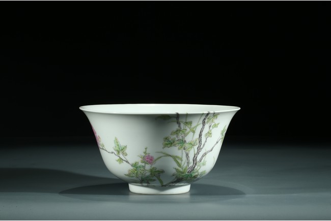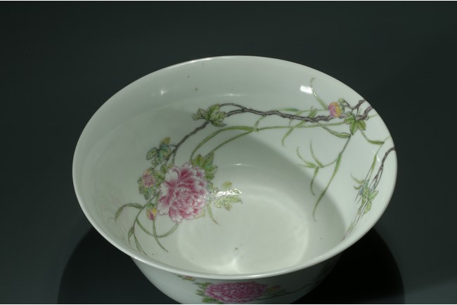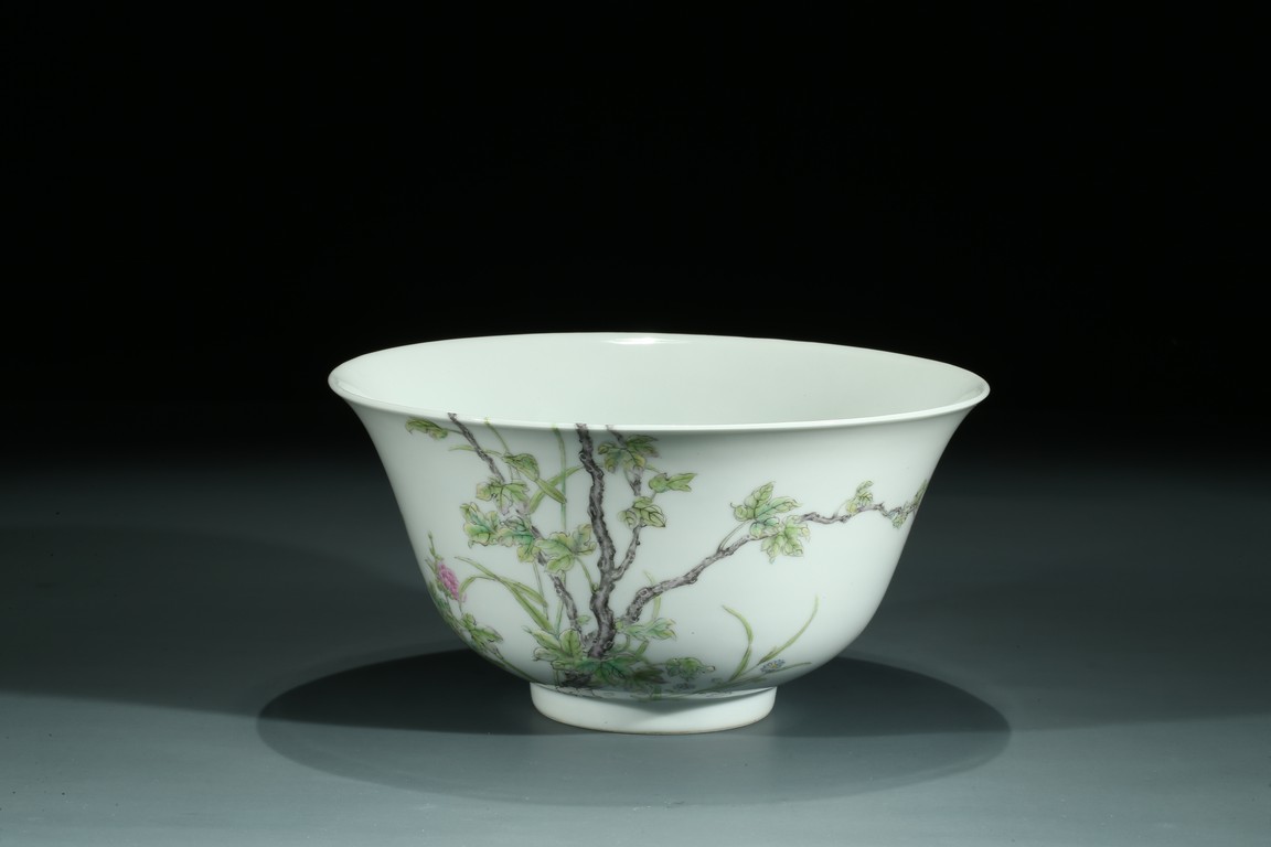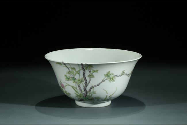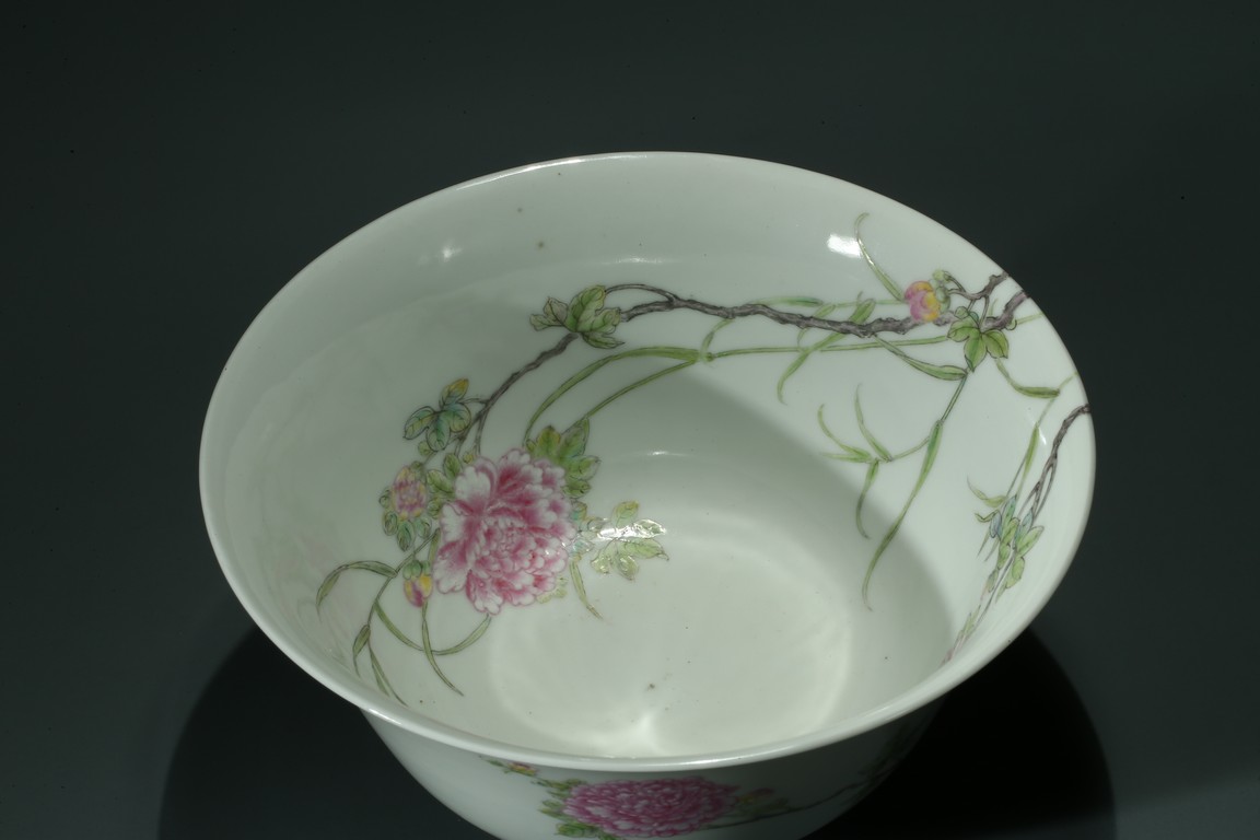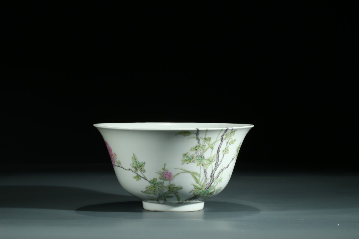 此碗口沿外撇、弧腹、圈足。通體施白釉,以彩繪製折枝花卉紋飾,花卉從外壁一直延伸至內壁,俗稱過牆花。施彩清新淡雅,繪製工藝精湛,構圖設計巧妙,器型規整端莊,體量大,時代特徵明顯,應為皇家御用之器,雍正乾隆兩帝大愛之品種。