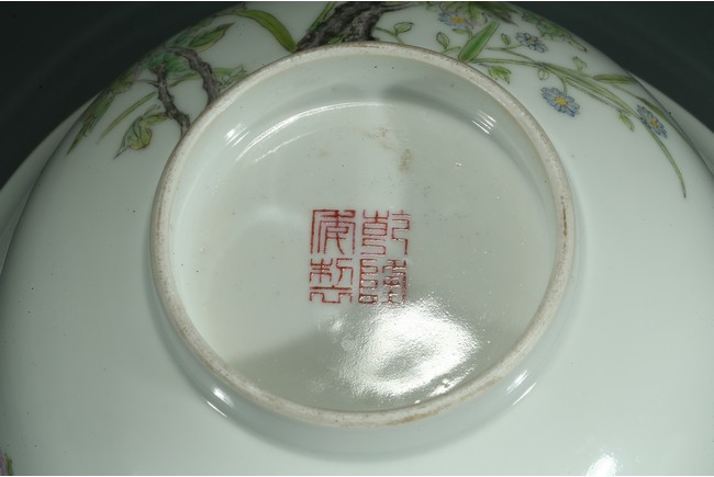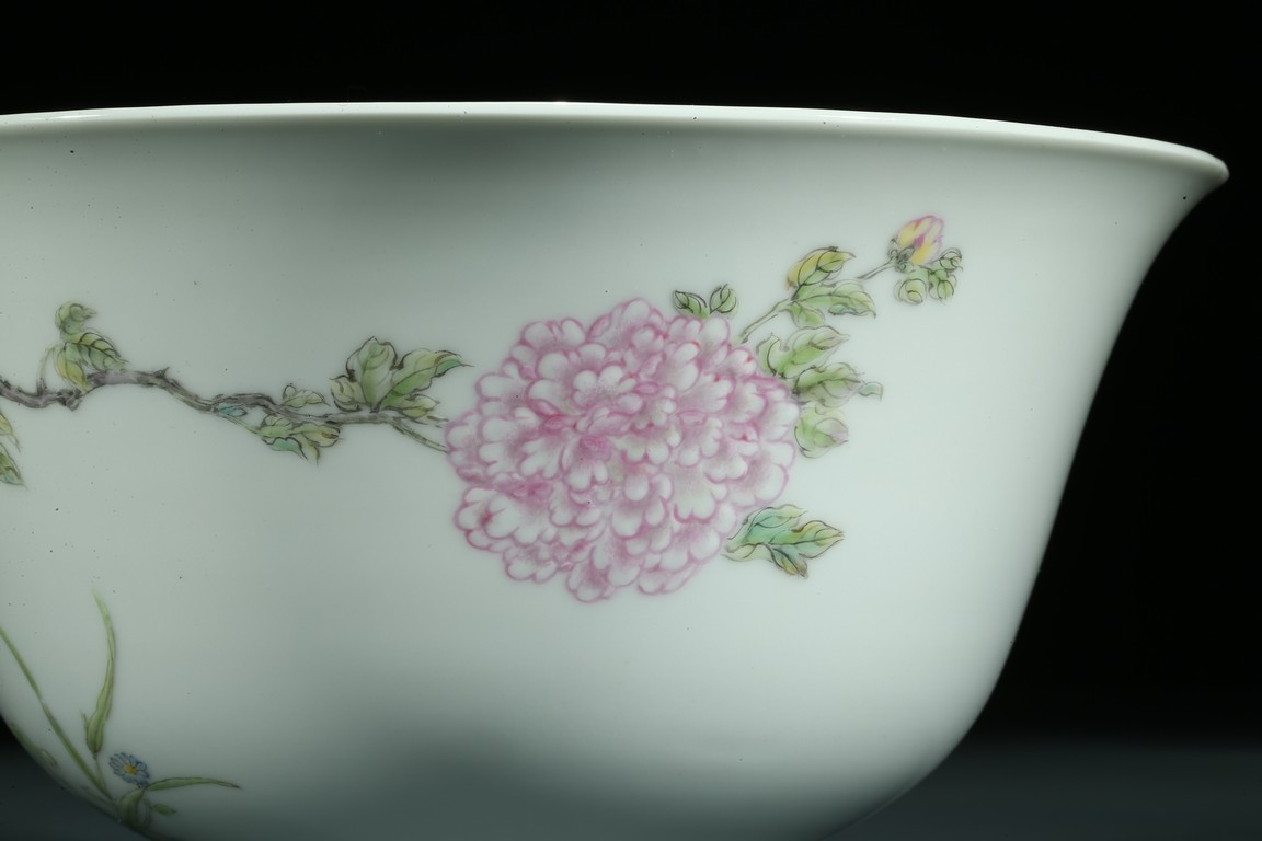 The deep rounded sides rising to gently flared rim, the exterior finely painted with flowering branches of chrysanthemum, peonies, and orchids extending to the interior, the base inscribed with four character Qianlong mark.