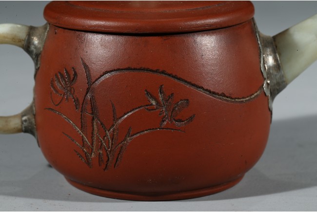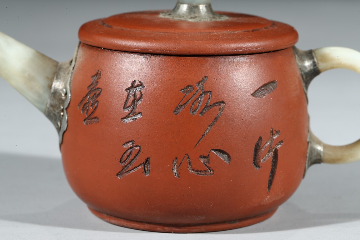 The teapot with finial, spout, and handle in jade, body and base inscribed.