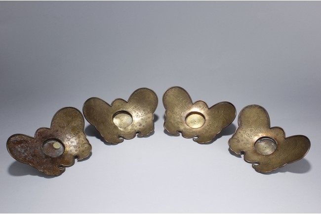 Each is identical in design and all possess a maroon-violet hue. It rests on a short foot that gradually curves out to form the body and mouth. The cups are perfectly smooth all around an sit on top of the silver butterfly shaped cup stands.Republic period.