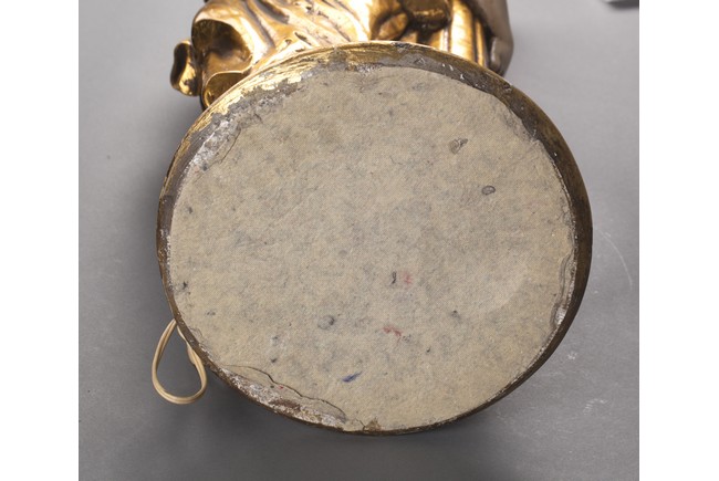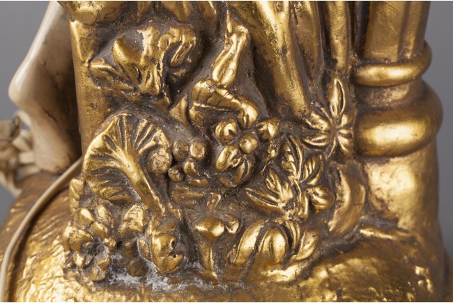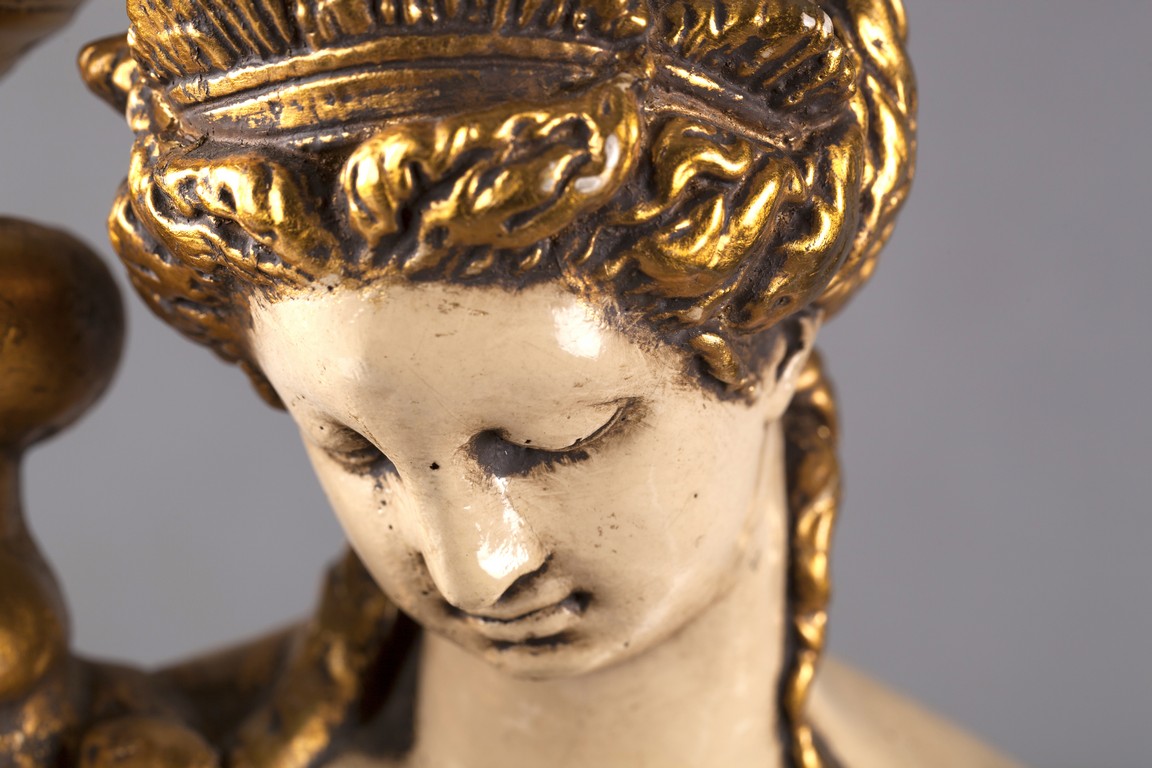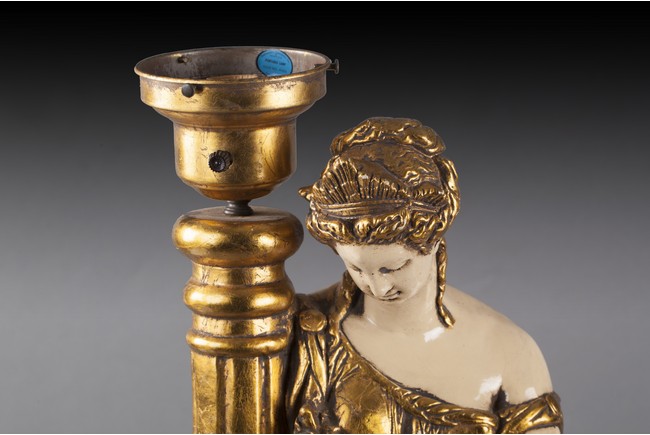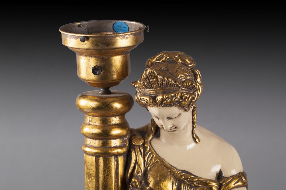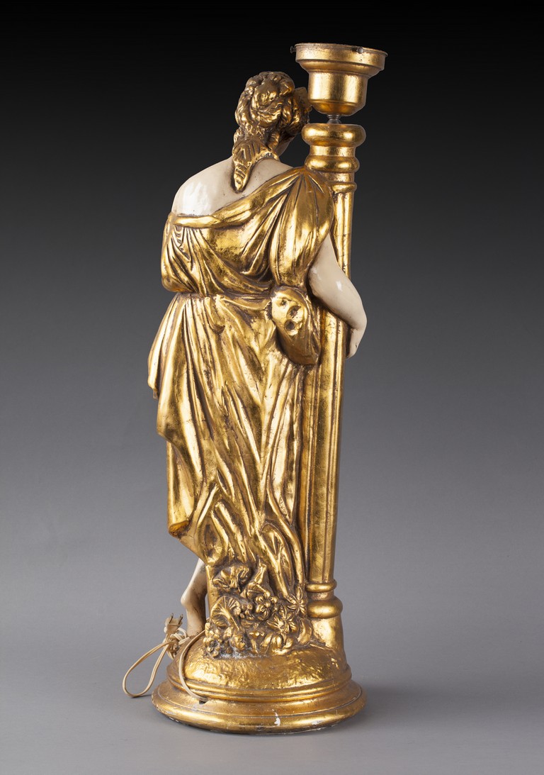 Depicting a beautiful maiden in dress showing slight skin, with one arm carrying flowers and the other hand holding the lamp. The color mostly in gold, with skins in cream color.