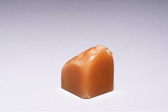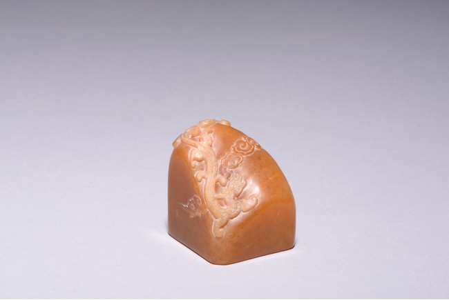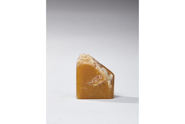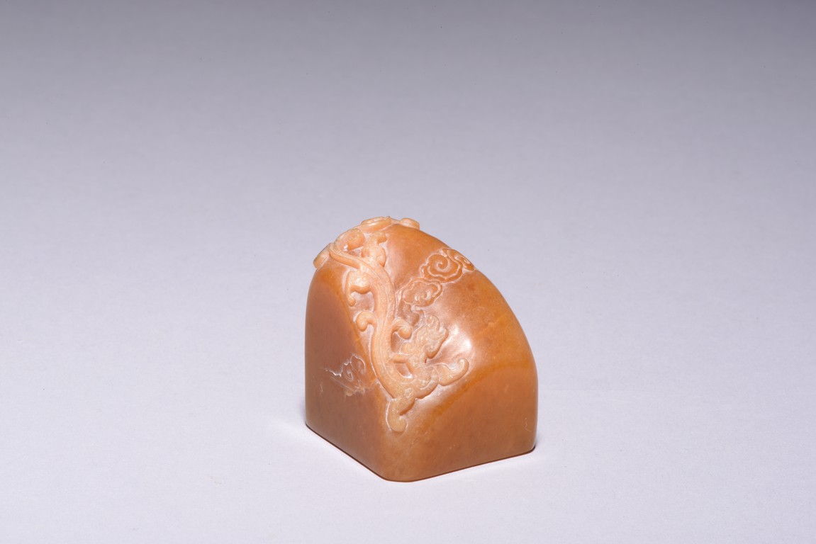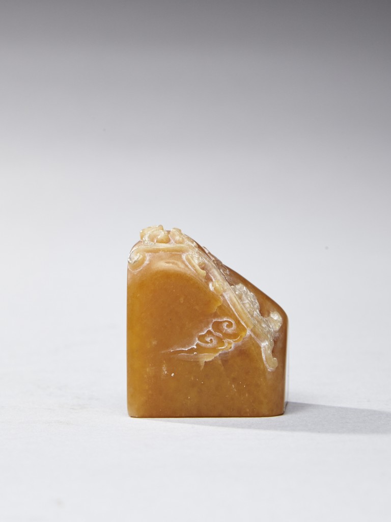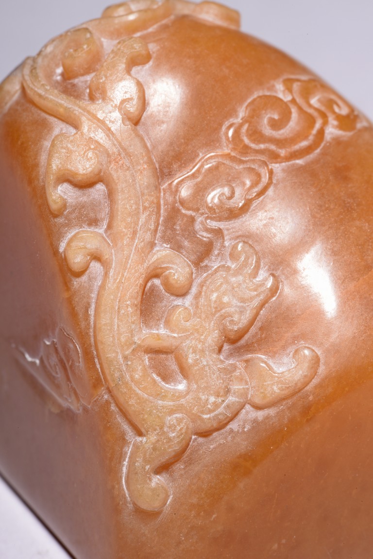 Of square section with irregular top, the top skillfully carved in relief with twisting chilong emerging from scrolling clouds.
