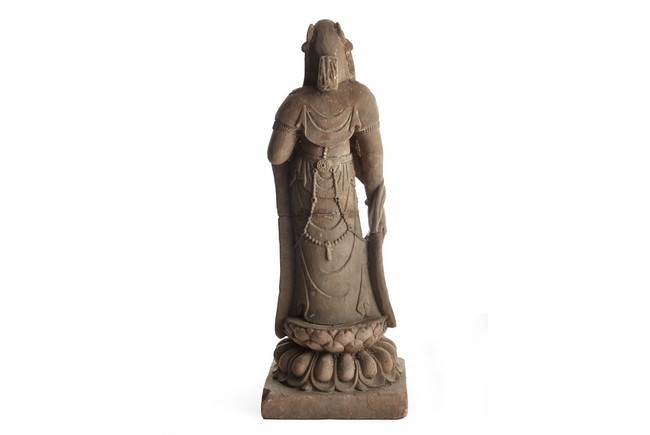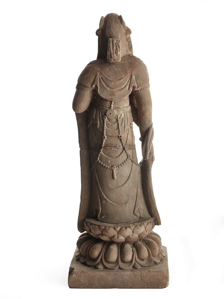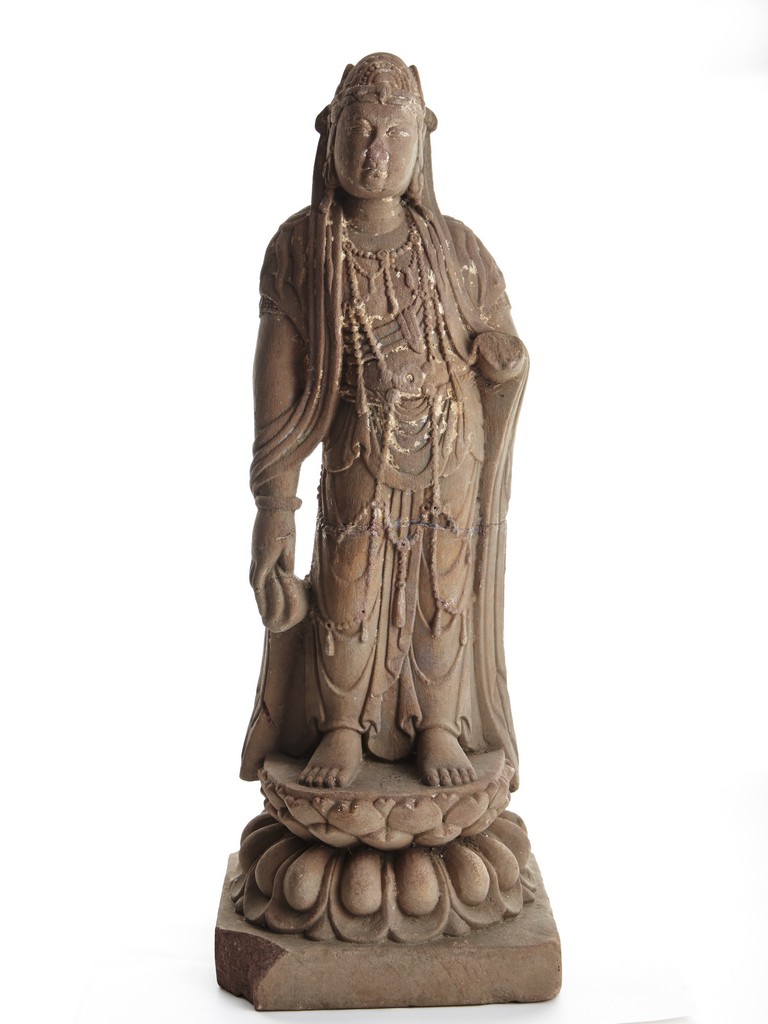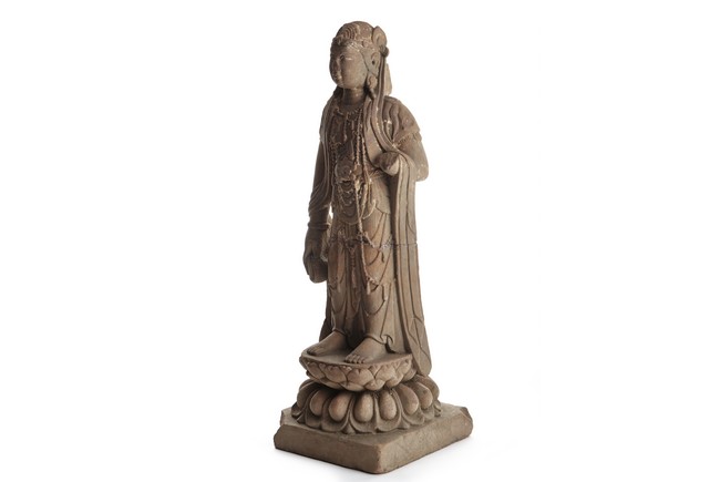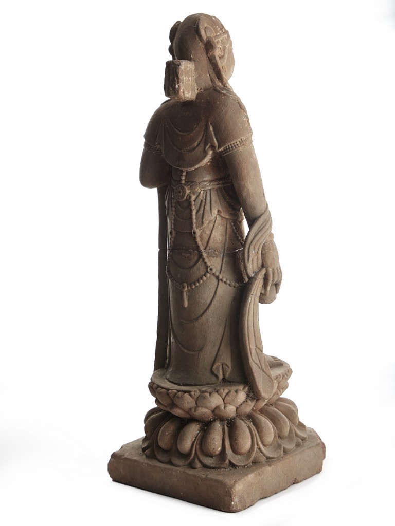 The elegant figure very finely carved from stone, depicting standing on a double lotus throne, dressed in shawl and overskirt pleated in front and falling in graceful folds, adorned with various beaded jewelry, the head slightly tilted.