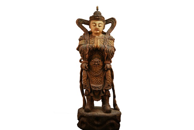Qing Dynasty period. Shown standing upon a wooden base, wearing heavy armour, hands clasped in one, with ribbon across shoulder, the face with serene expression.