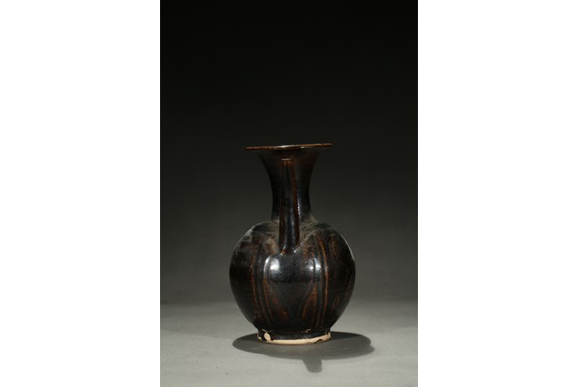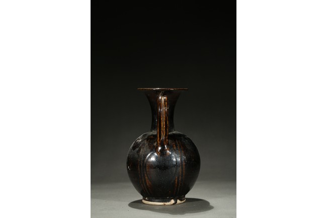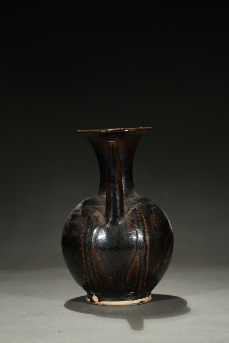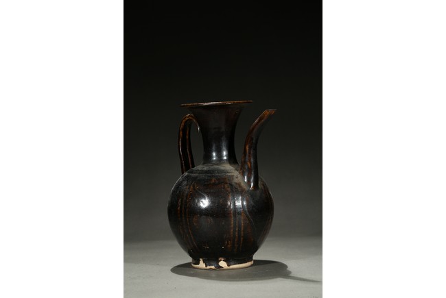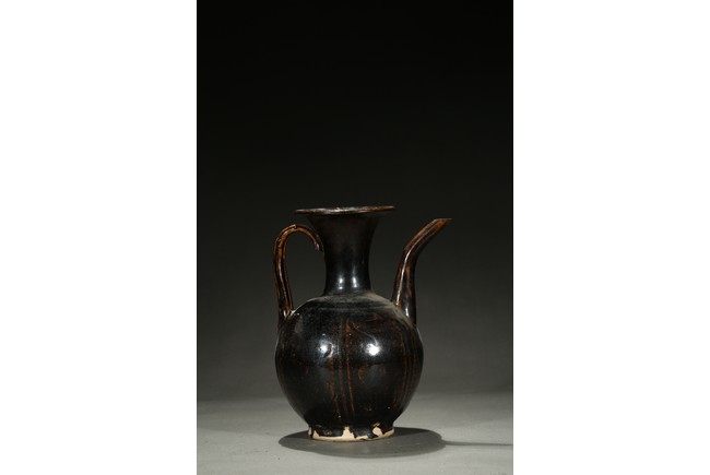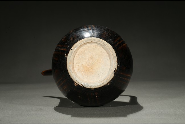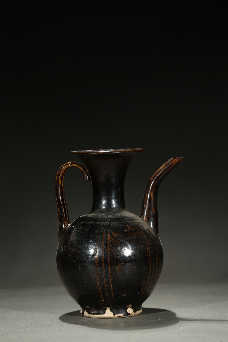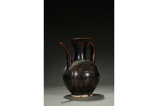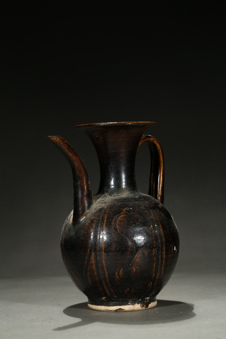 The globular-shaped body applied with a loop handle and serpentine spout, overall painted in dark brown glaze with pattern. Ming Dynasty period.