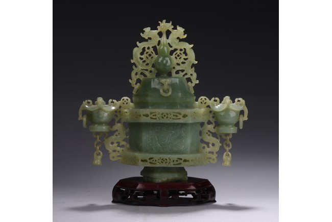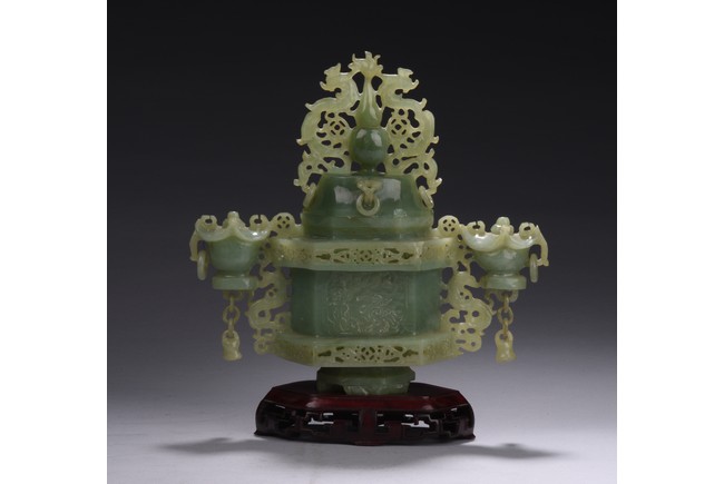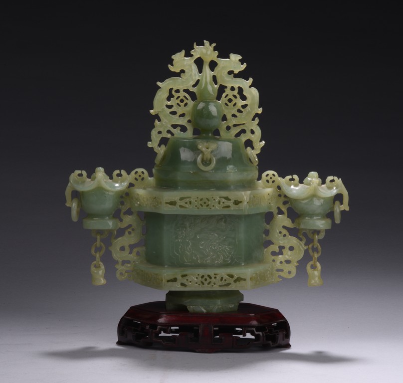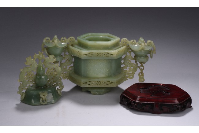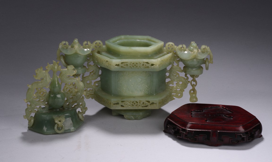 Of hexagonal form, the censer flanked by two carved and pierced archaistic vessel-like handles with openwork design, the cover topped with a double gourd finial flanked by archaistic mythical beasts.