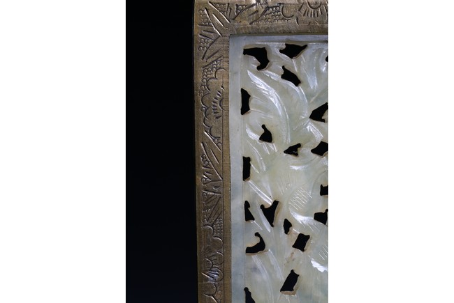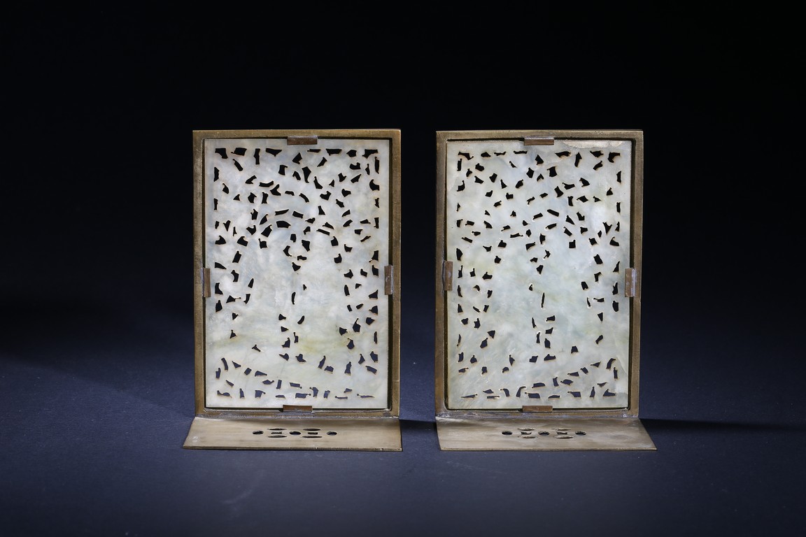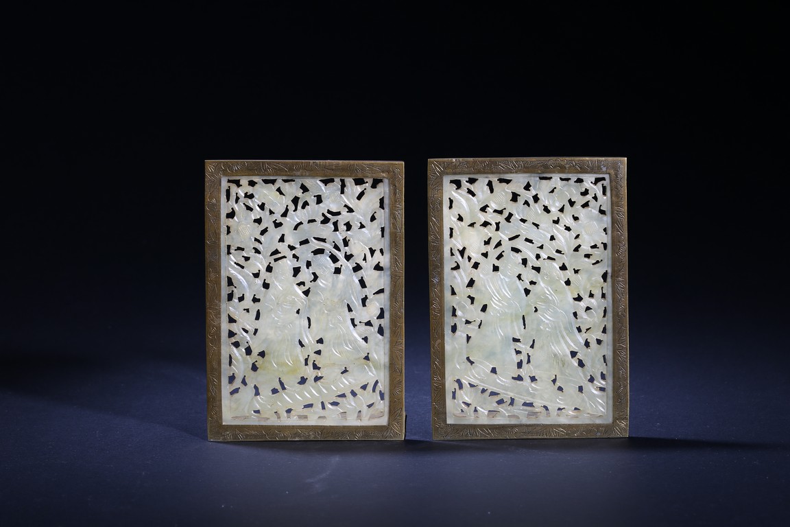 Rectangular shape,each carved an pierced to depict the two immortals hehe erxian,the jade is of smooth translucent white tone,all framed by copper with floral design. Qing Dynasty period.
