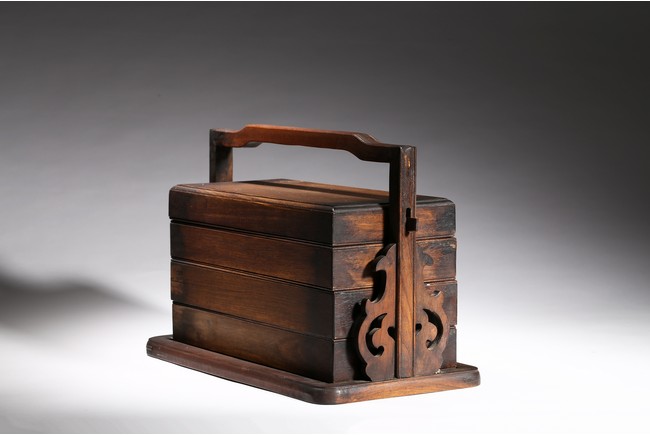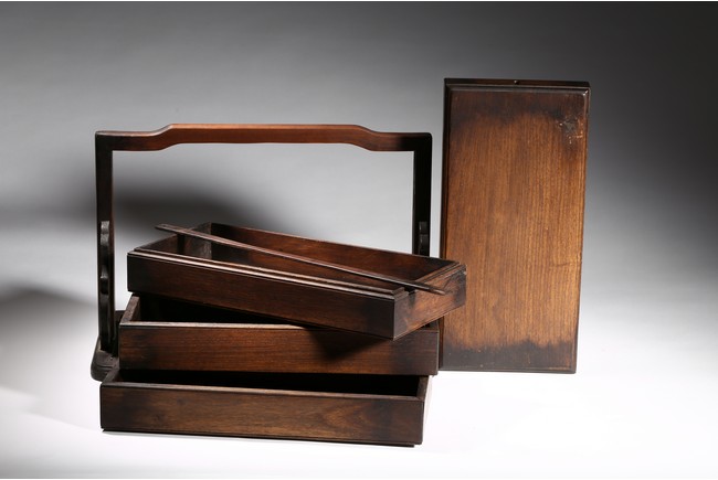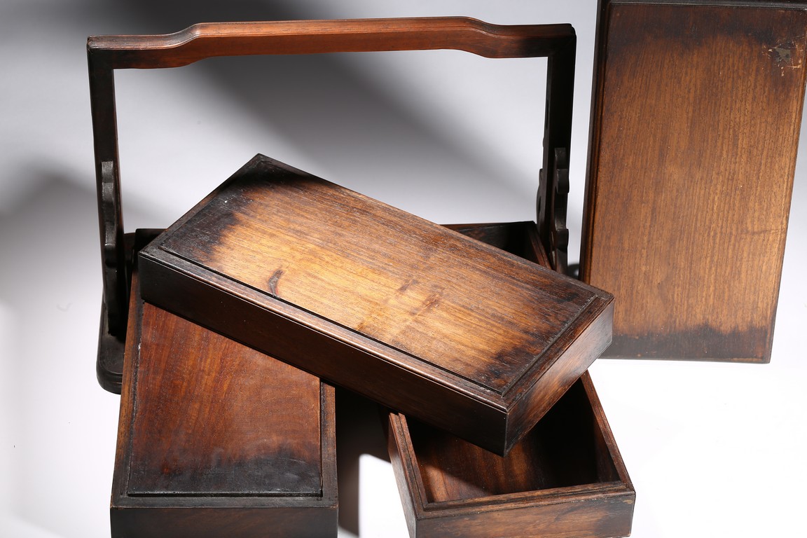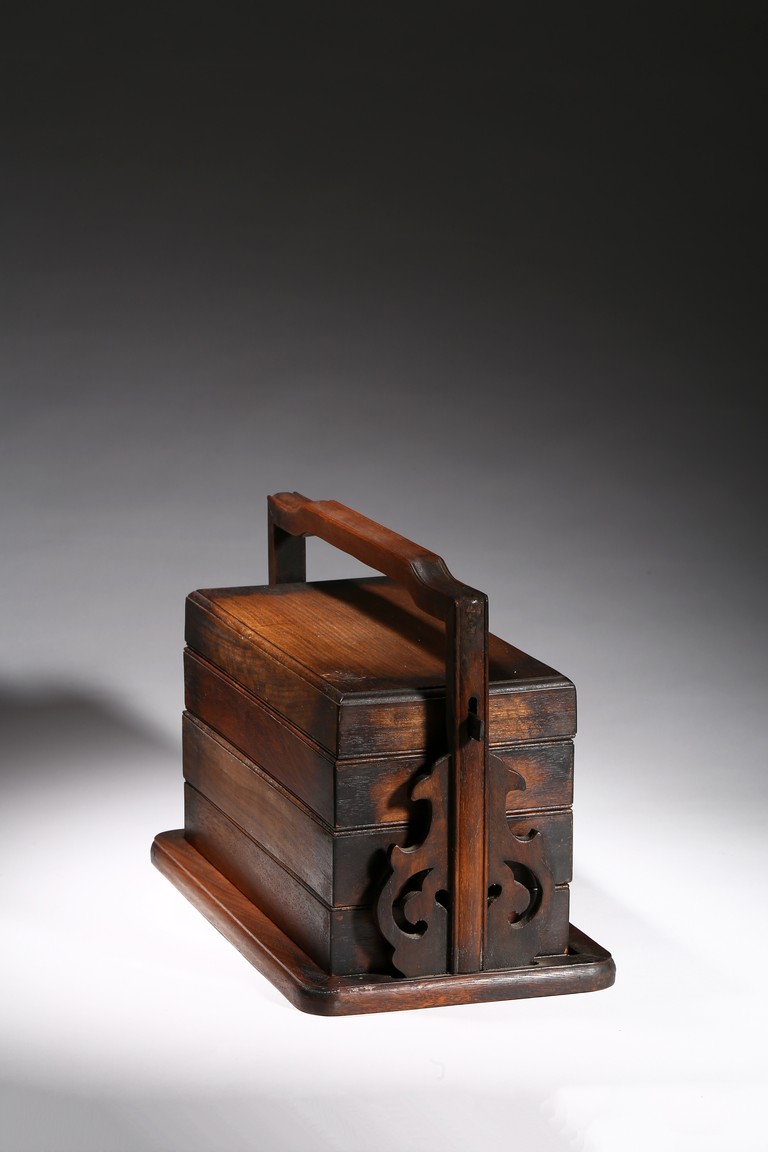 Of rectangular form, comprising a cover and three trays, each conforming to the tray above, set on a base frame of square-section posts and side posts.