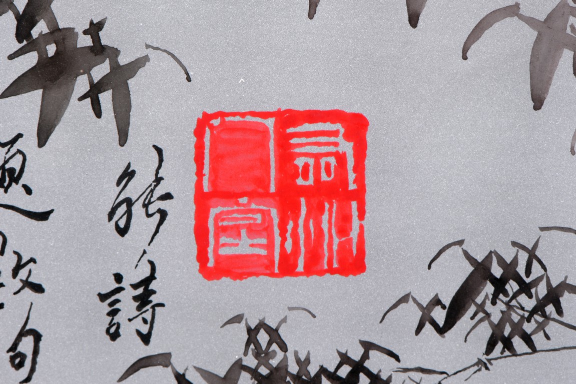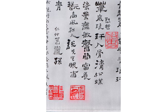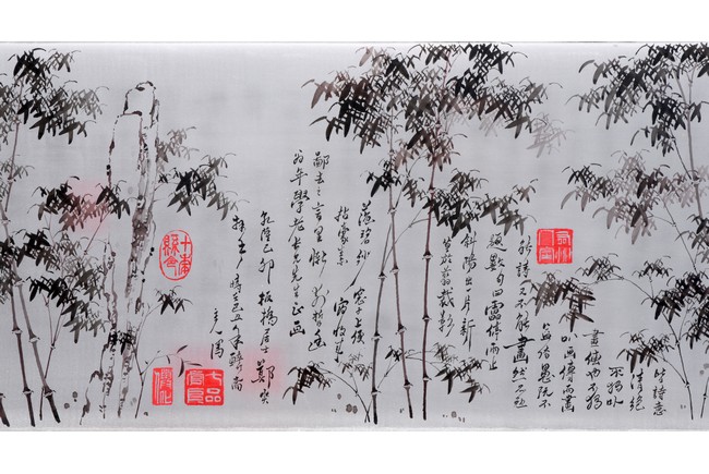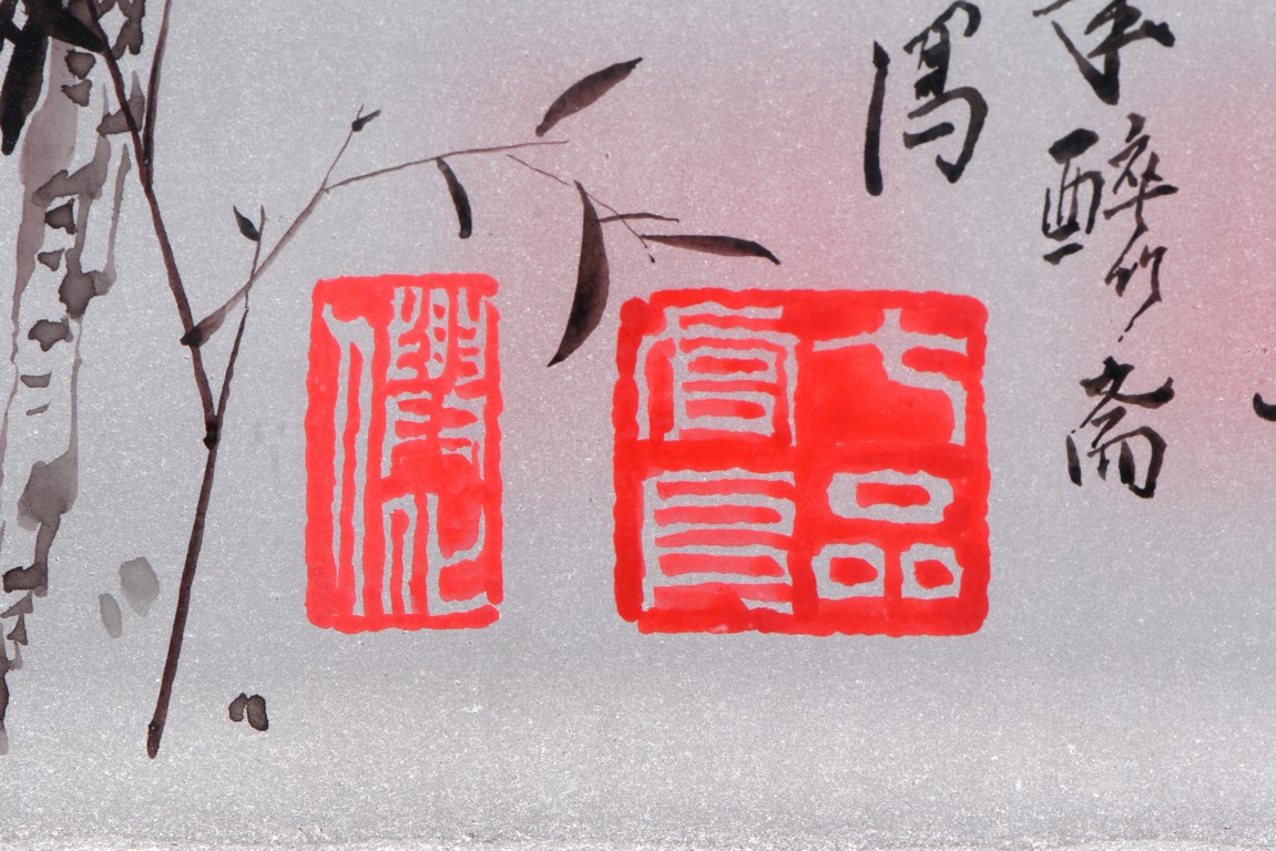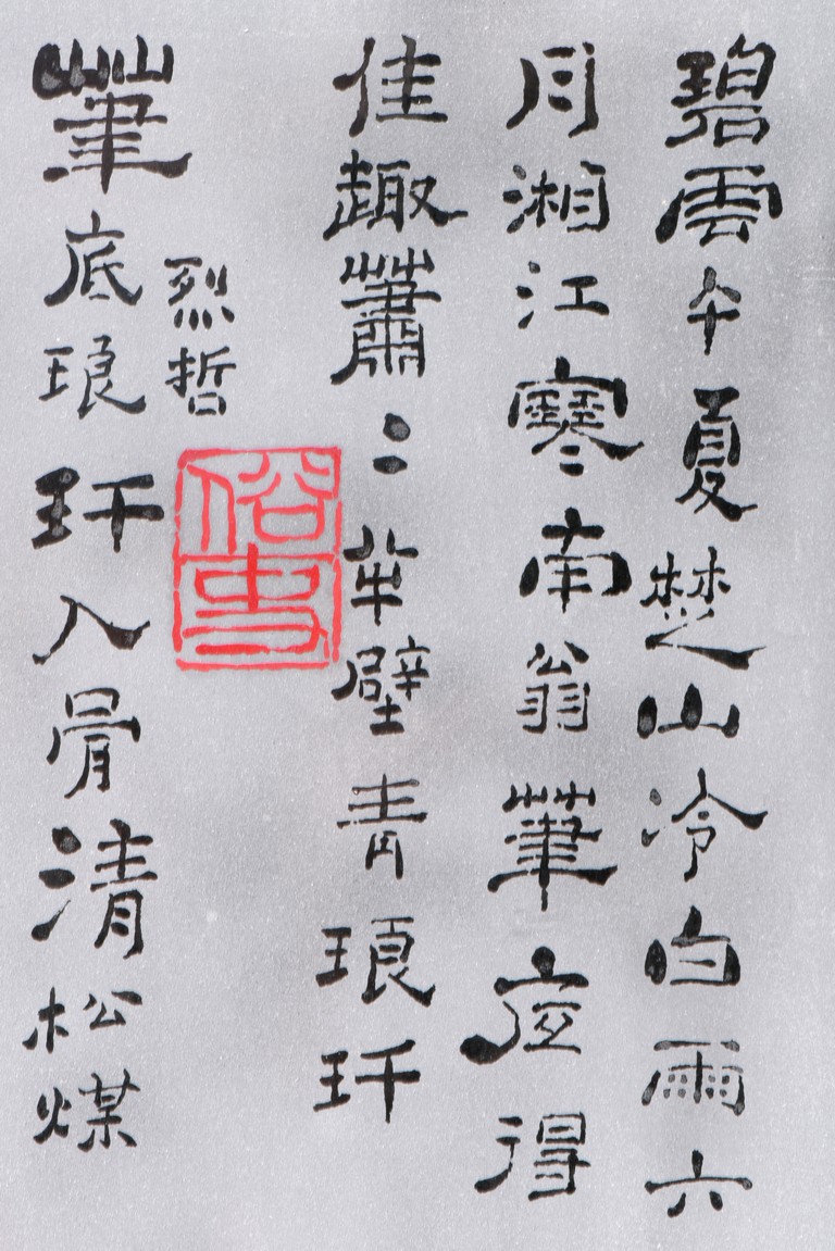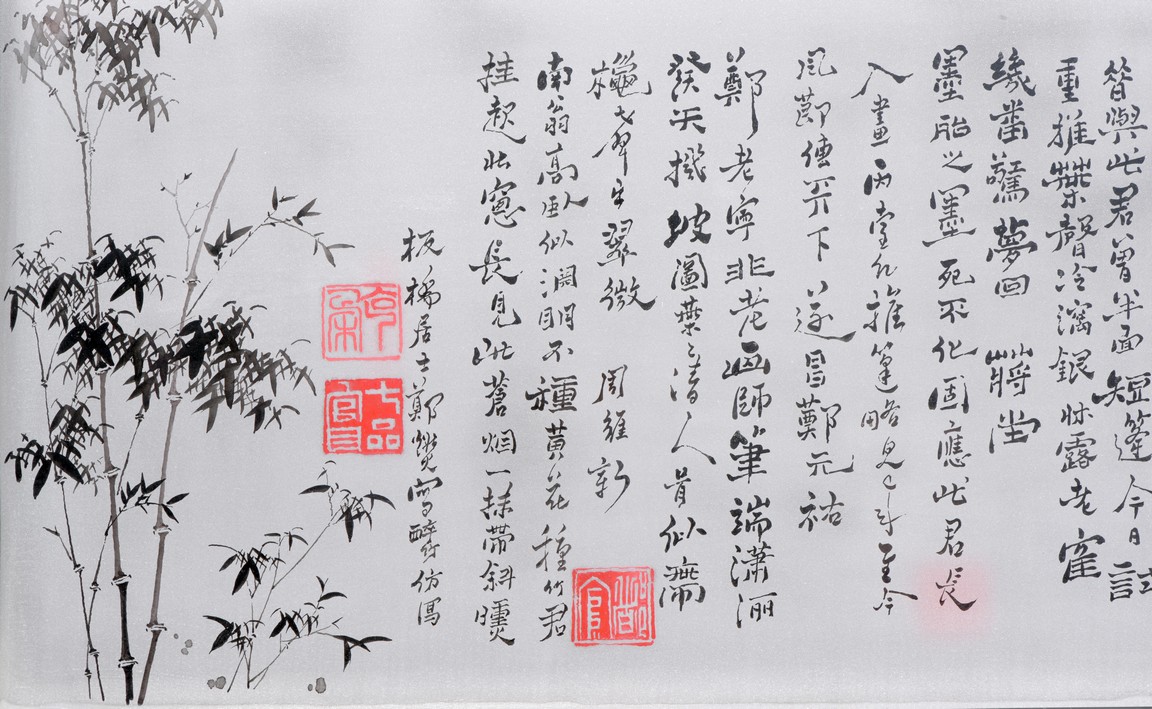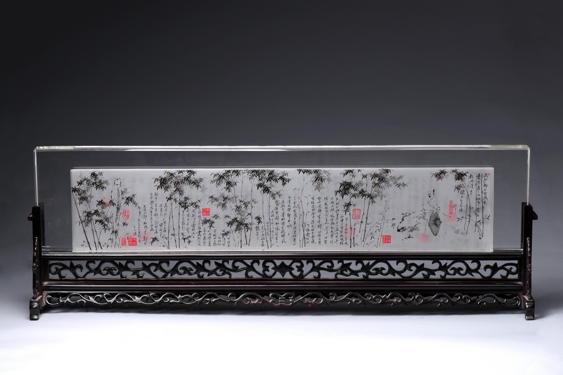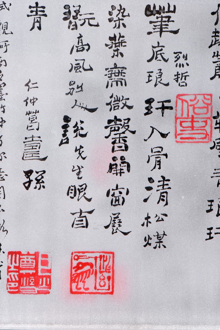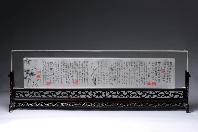 Rectangular modelled, the transparent glass table screen is finely inside-painted with poems, bamboos, and orchids in the manner of Zheng Banqiao.