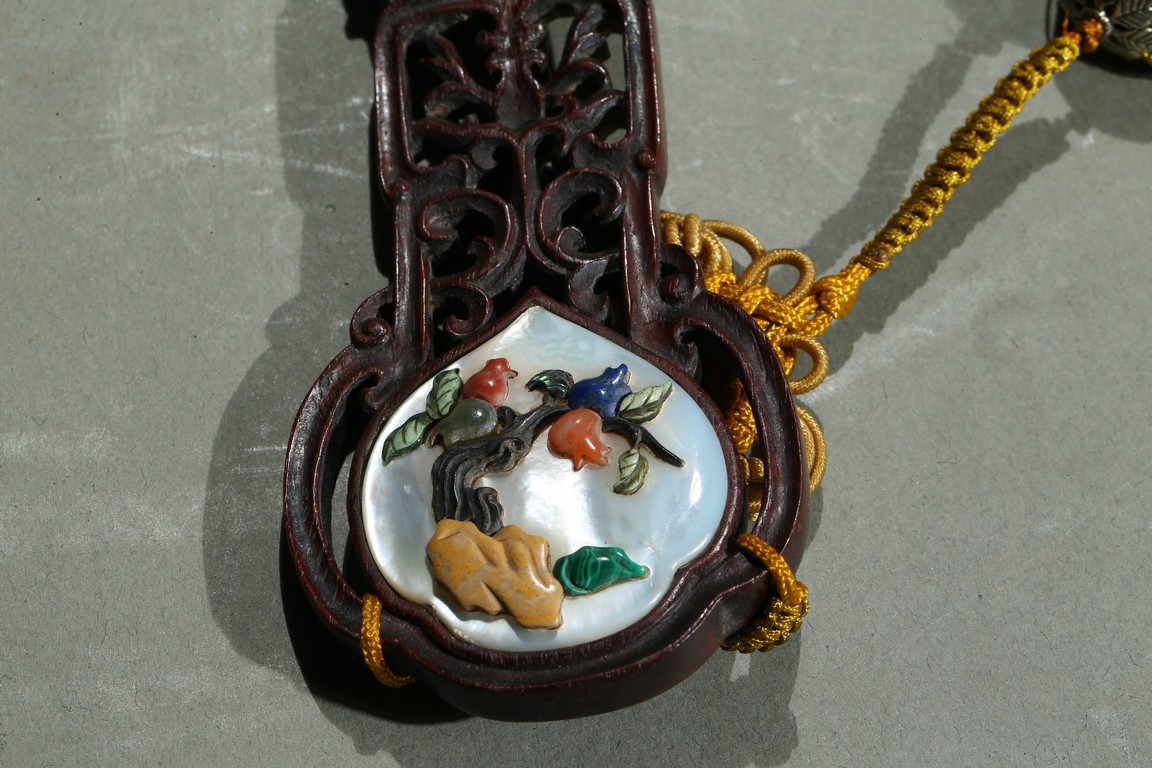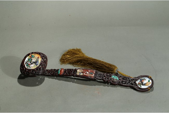 The ruyi scepter finely embellished with mother of pearl to the head, middle section, and the end, all further inlaid with various semi-precious gems to depict peach tree and longevity god.