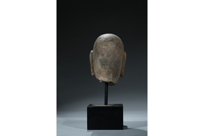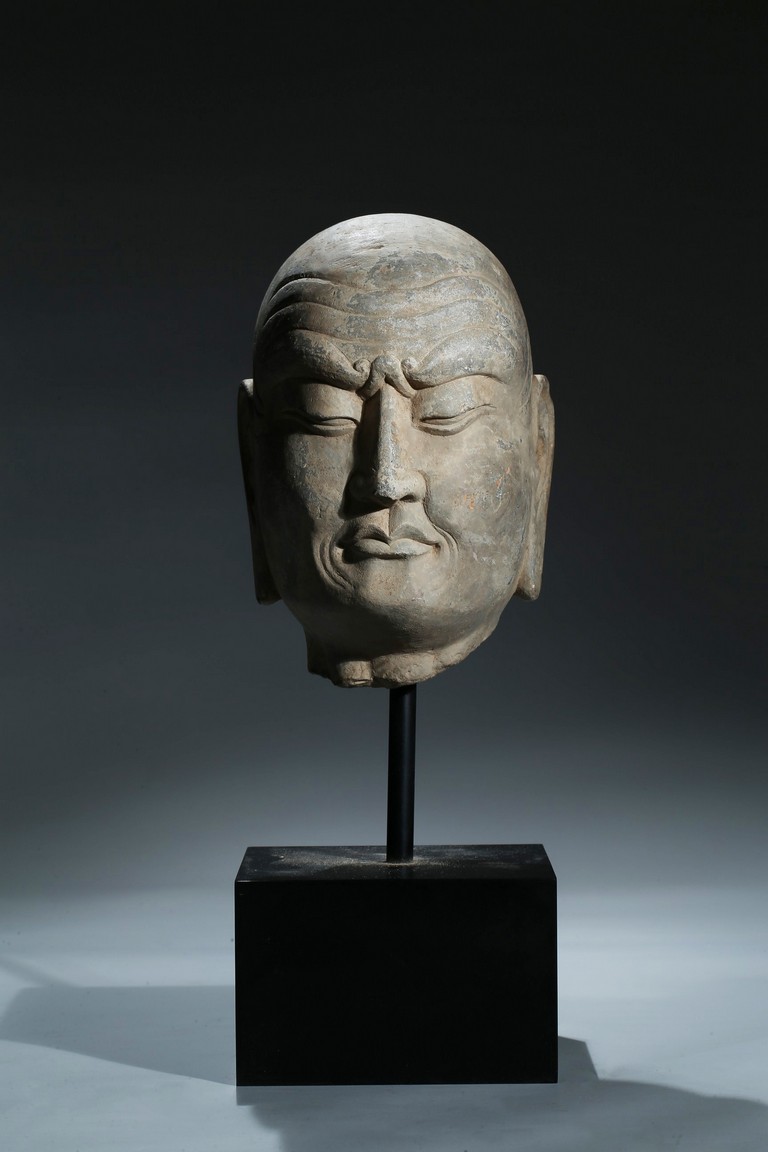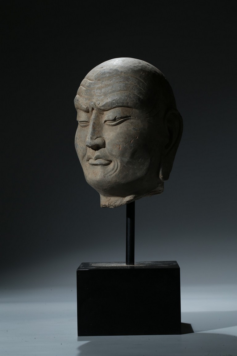 Northern Qi Dynasty period. Delicately carved as the head of a luohan, the figure depicted with a stern expression, the face framed by a deeply lined forehead and prominently rendered arched brows above downcast eyes, with rounded cheeks above a pursed mouth flanked by deep wrinkles, all between two long pendulous earlobes.