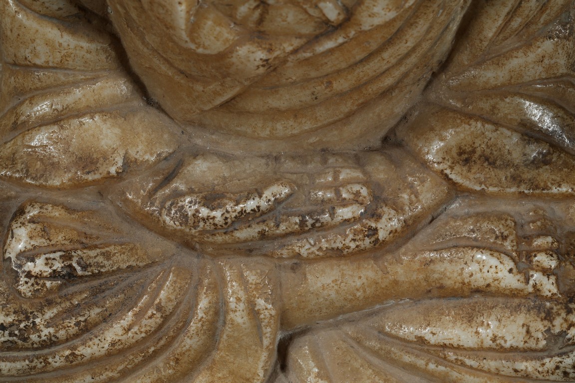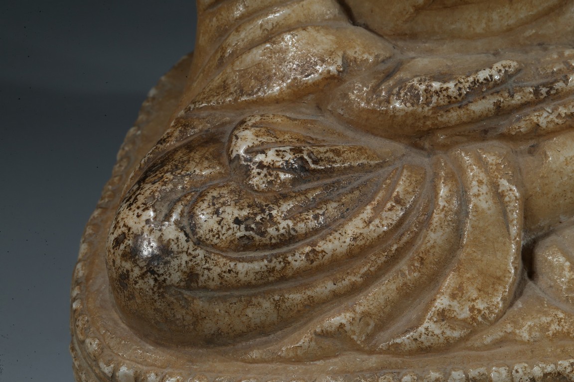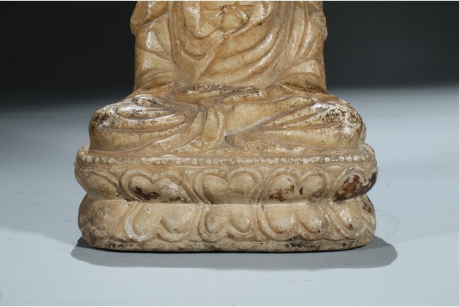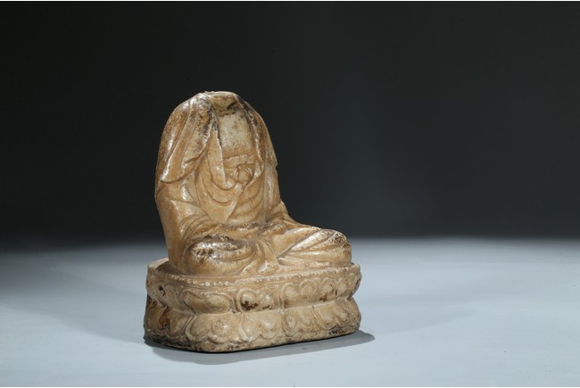 Seated in dhyanasana upon a double lotus throne, the hands joined in dhyana mudra on the lap, the sanghati open at the chest, the head missing. Northern Wei Dynasty period.
