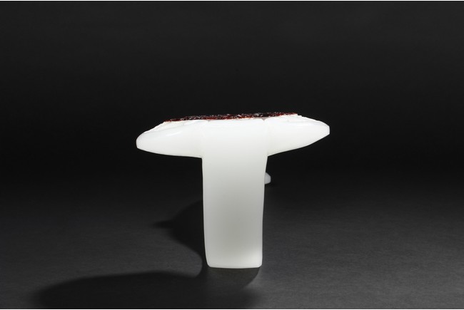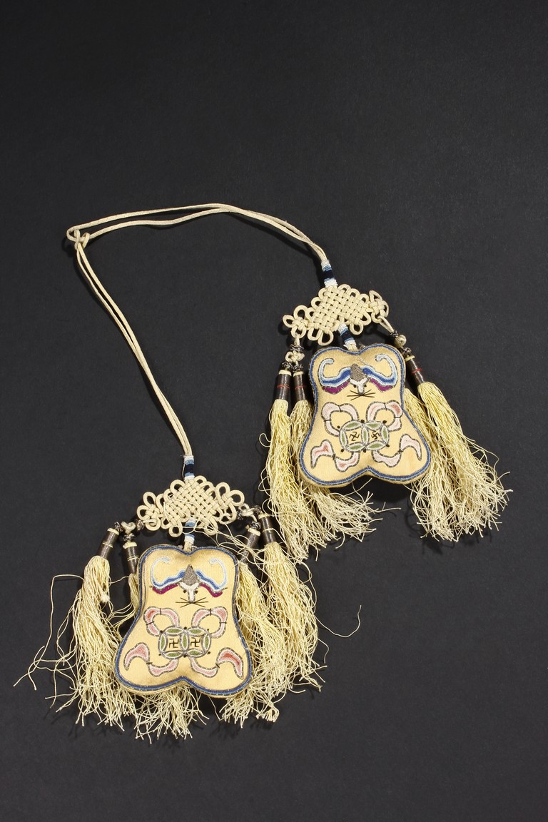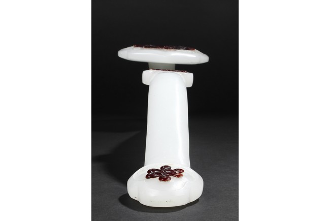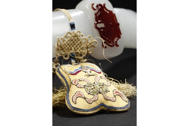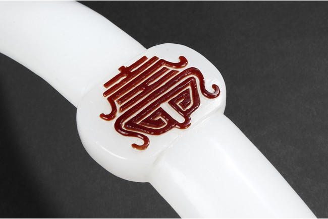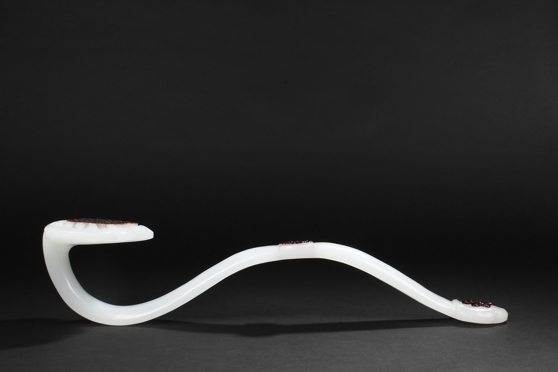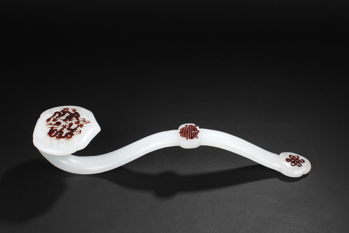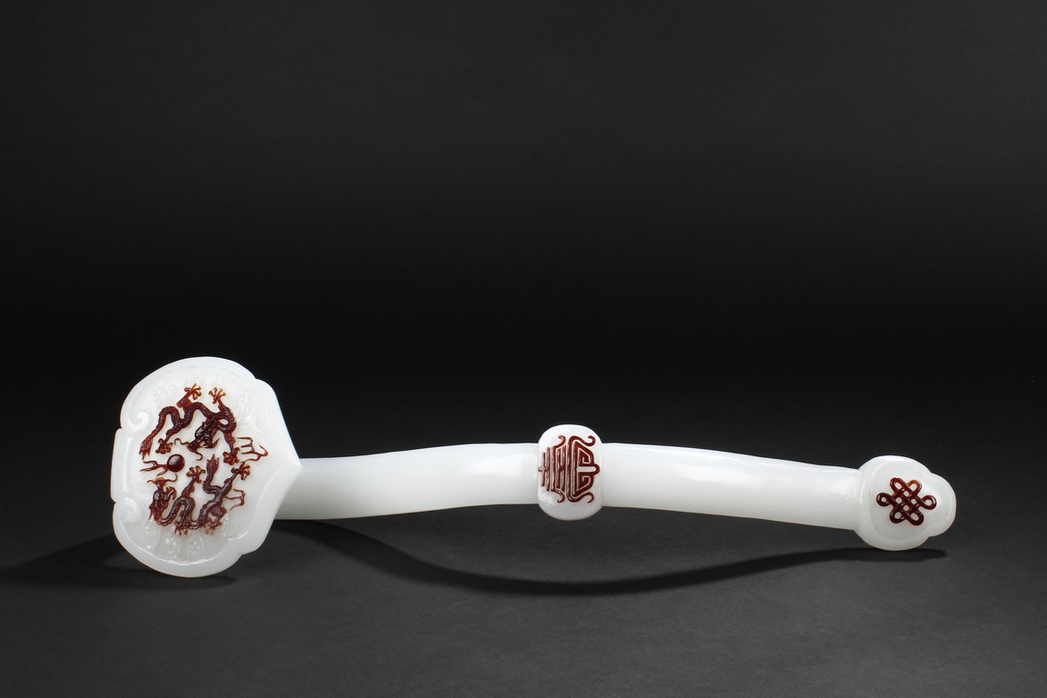 Of elegant S-shape, this ruyi scepter is elaborately carved through the red overlay to the opaque white glass with a flaming pearl flanked by two flying dragons in the head. The mid section is carved with a stylised character 'Shou', or longevity. It ends with a carved auspicious symbol of knot terminal and includes a yellow silk cord. Qing Dynasty period.