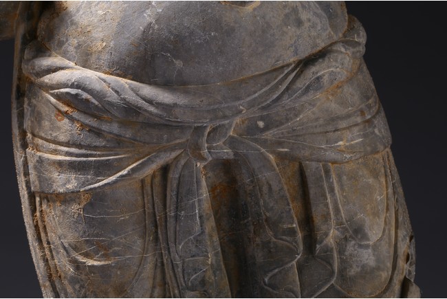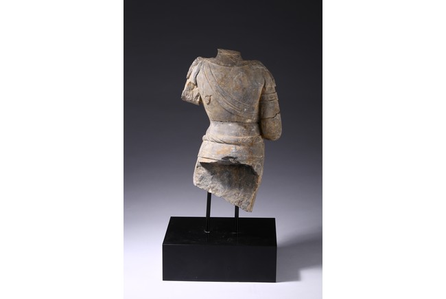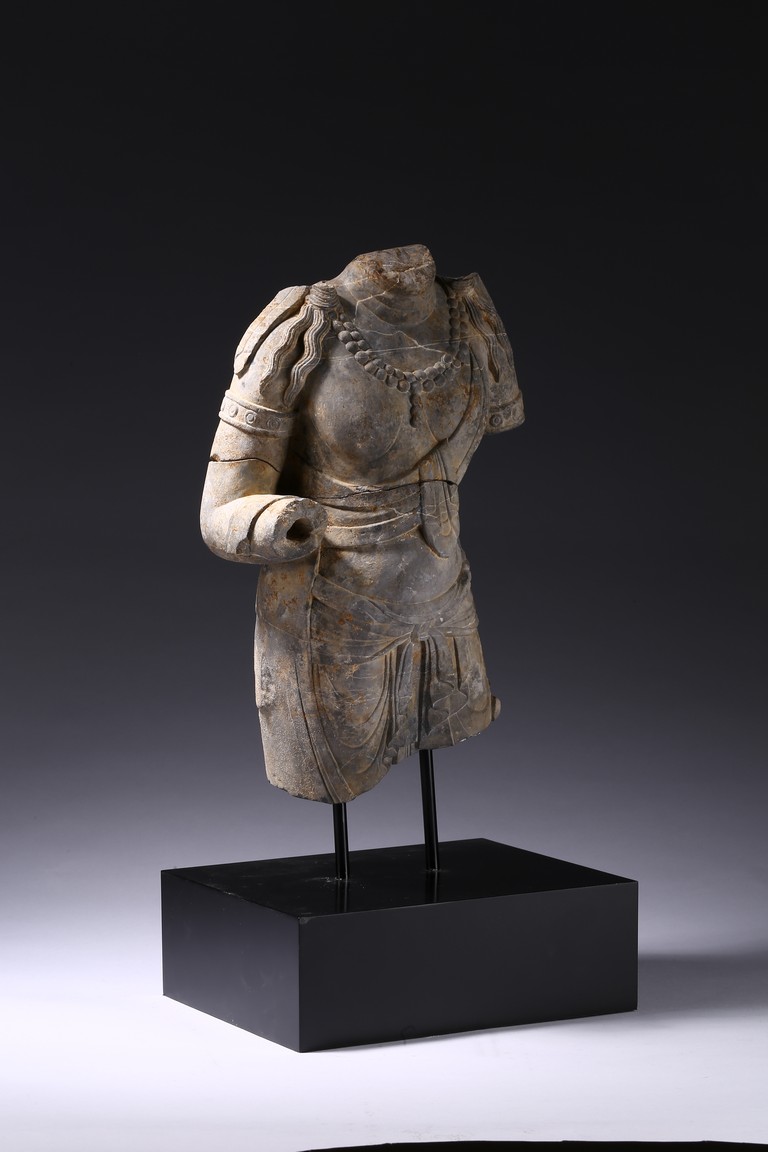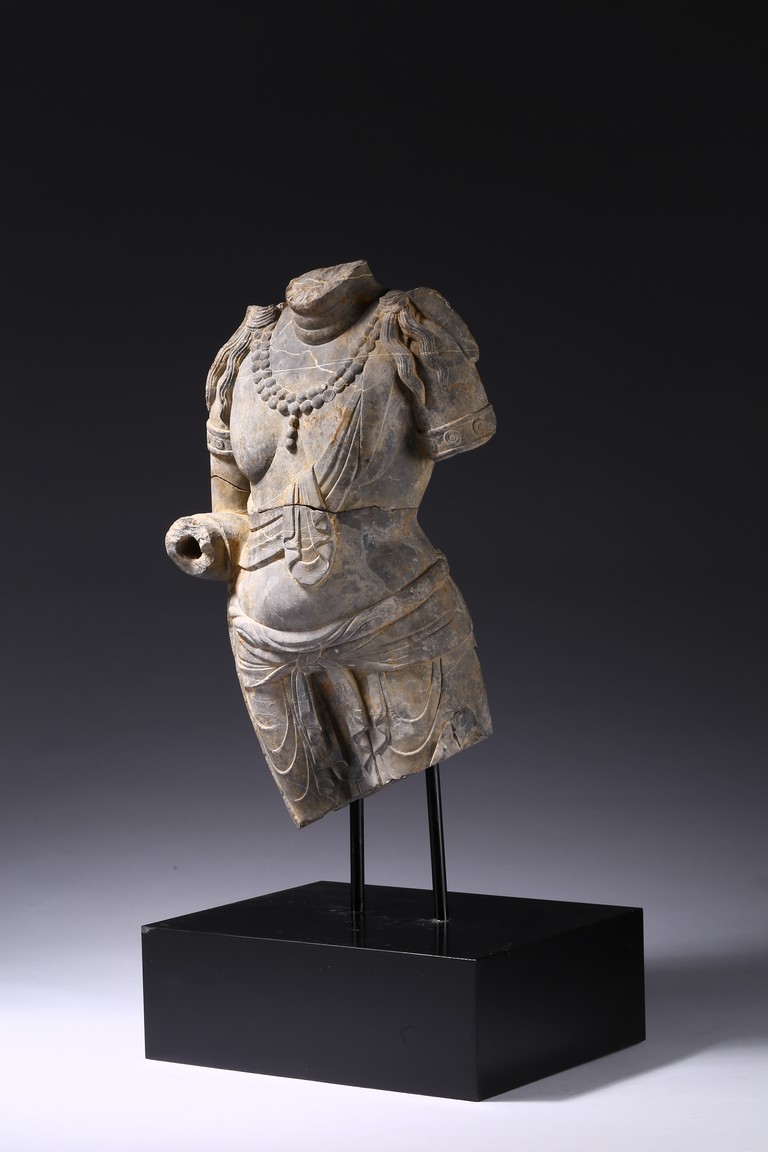 The grey stone finely carved as a standing figure draped in long skirts with stylized folds flattened down both legs and tied across the waist with an apron,the bare torso depicted with a dhoti wrapped around left shoulder and draped with long beaded necklace,the missing right arm bent up,with the trailing ends of the bodhisattva's hair falling elegantly across the shoulders,all supported on a rectangular stand. Tang Dynasty period.