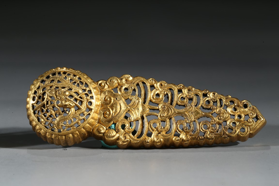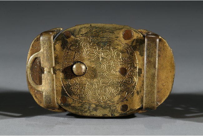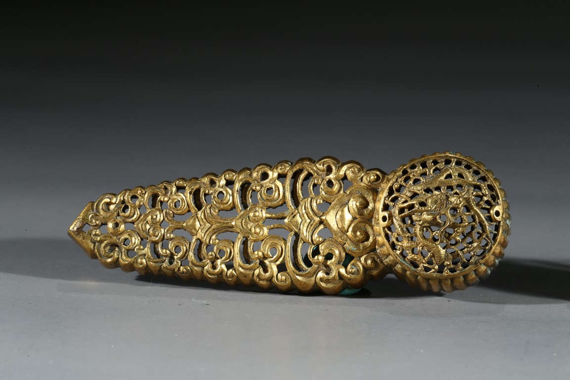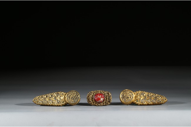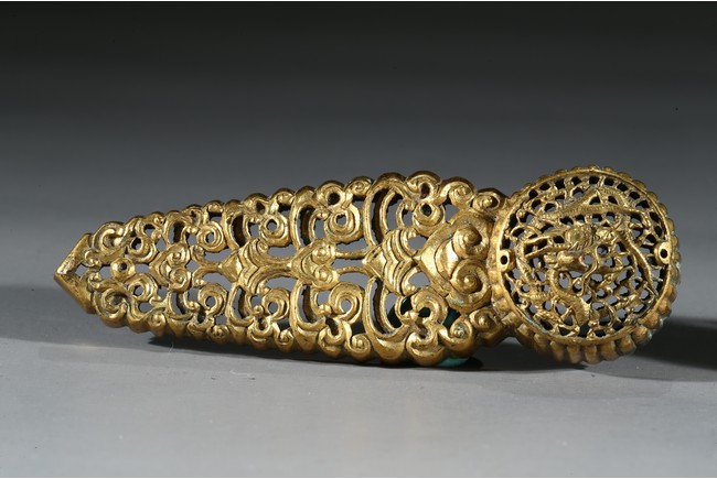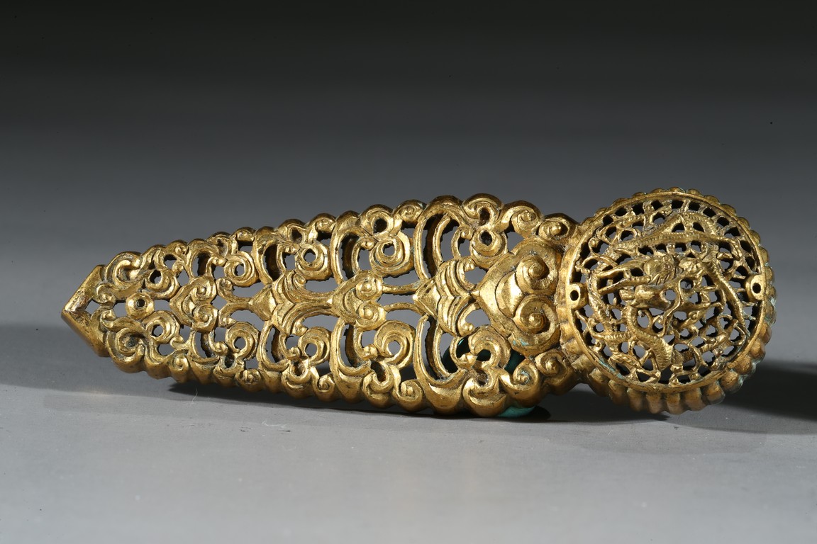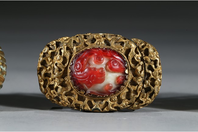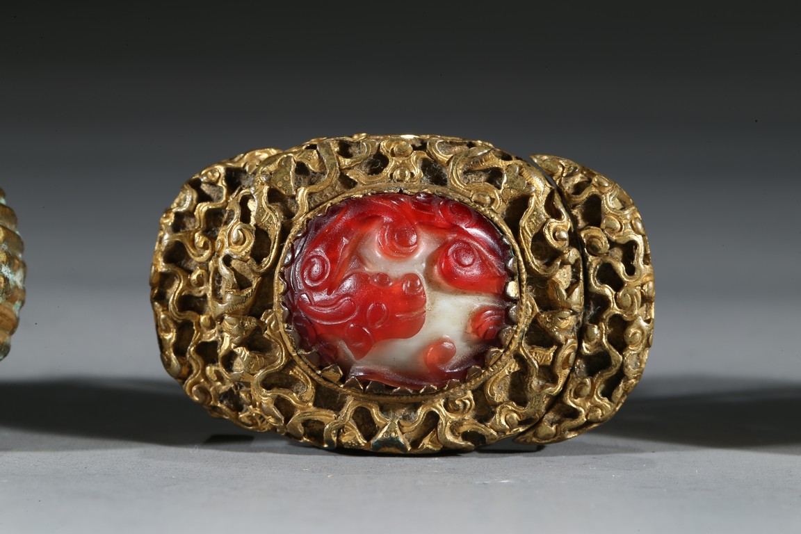 Consisting of two gilt-bronze openwork buckles and one buckle embellished with carnelian agate.