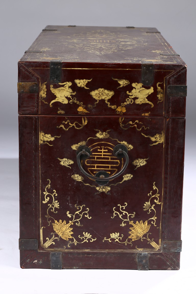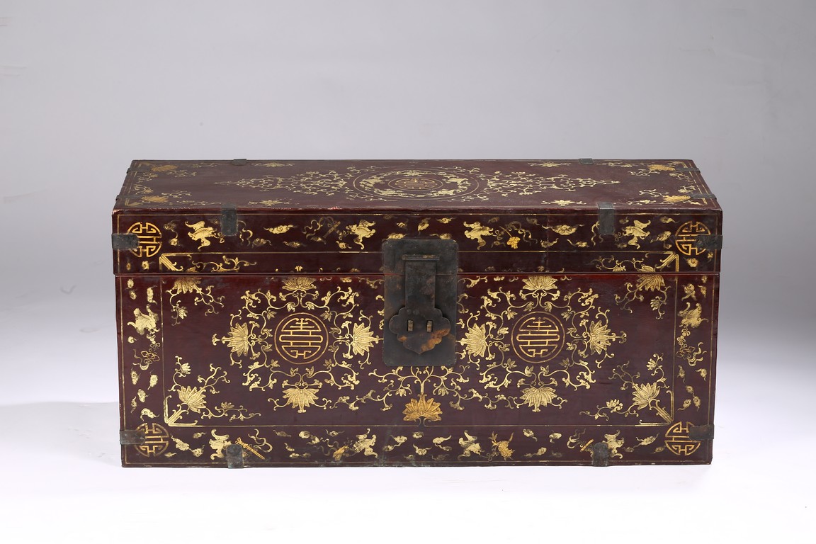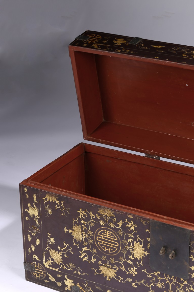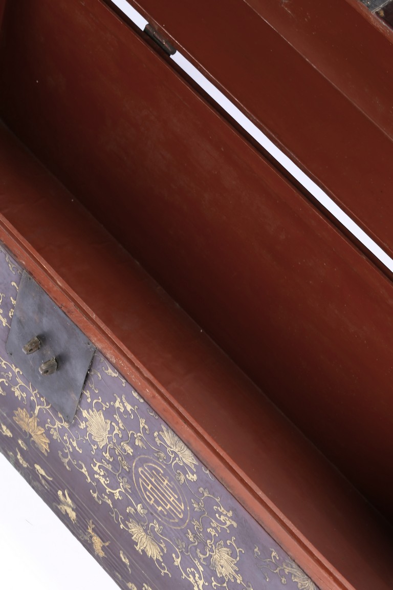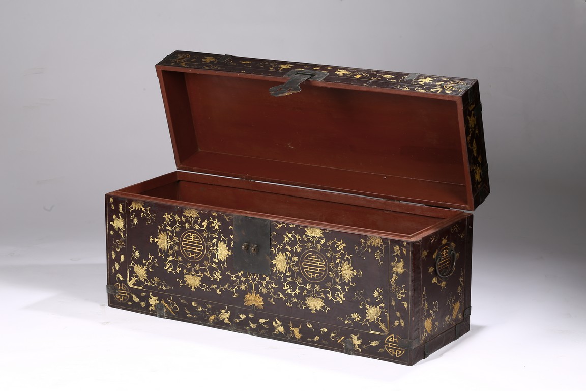 Qing Dynasty period. Each of rectangular form with hinged cover, decorated overall in gilt with floral motifs, shou character, and scrolling lotus, the interior painted a red color, bronze bail handles set to either sides.