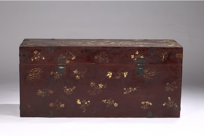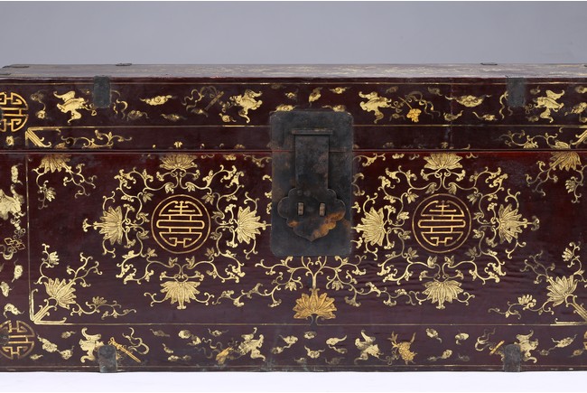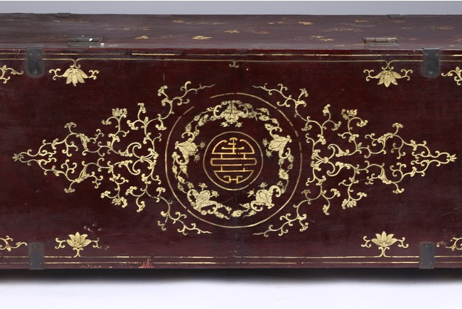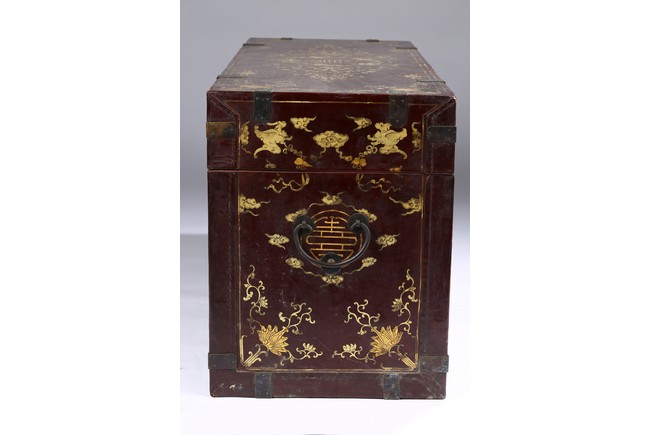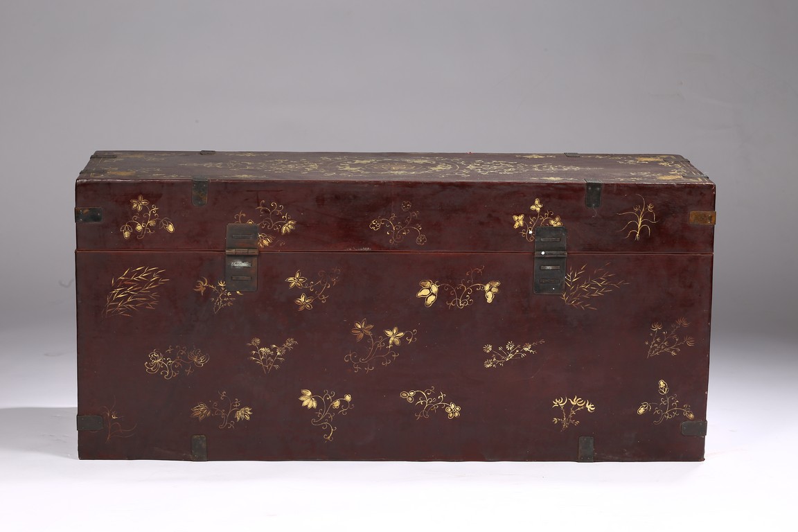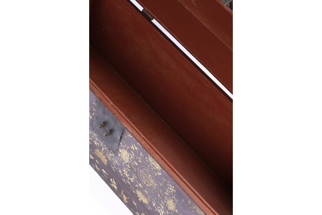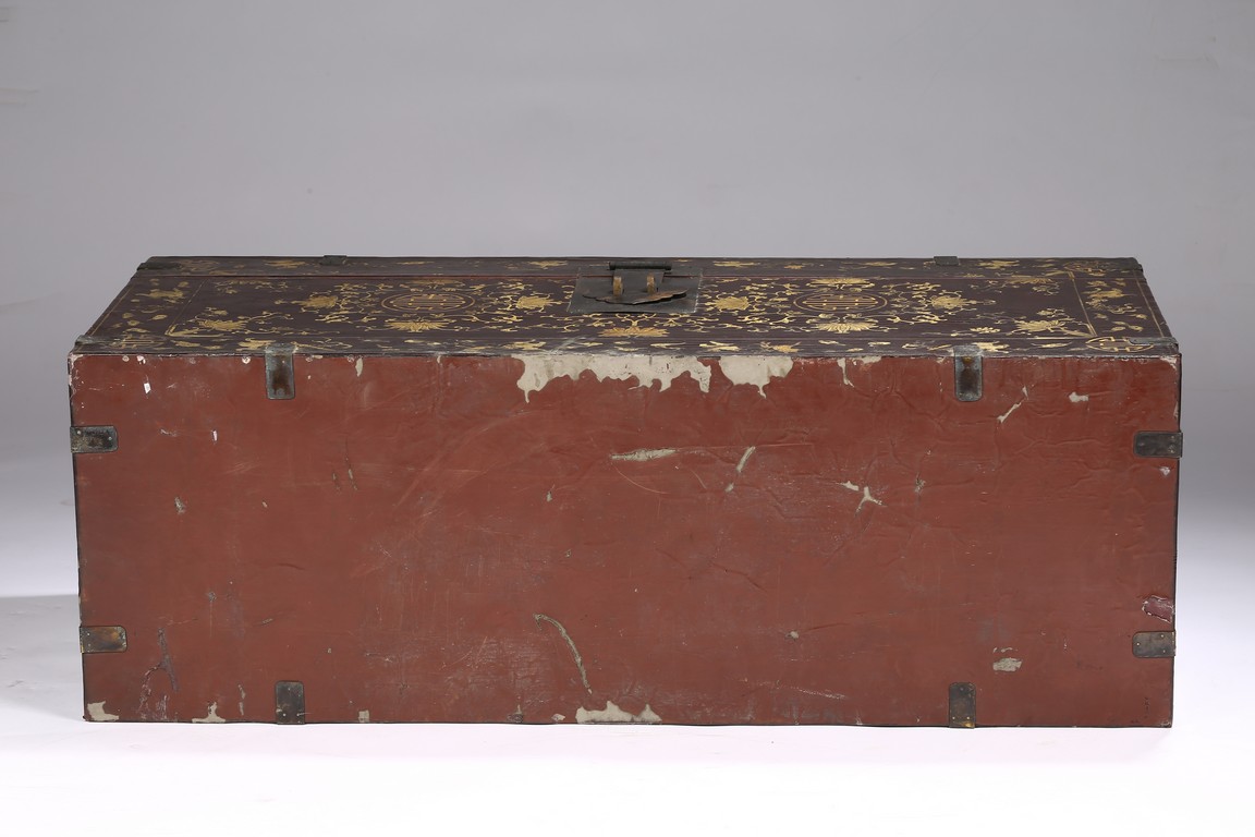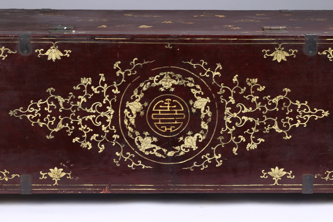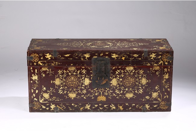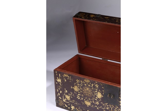 Qing Dynasty period. Each of rectangular form with hinged cover, decorated overall in gilt with floral motifs, shou character, and scrolling lotus, the interior painted a red color, bronze bail handles set to either sides.