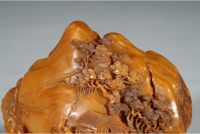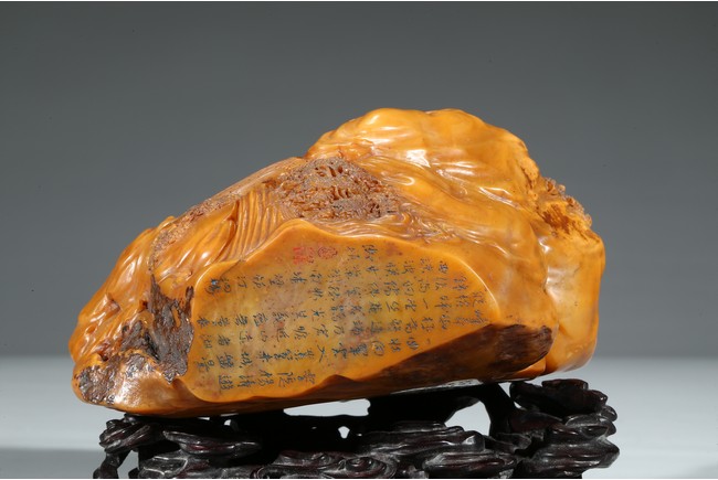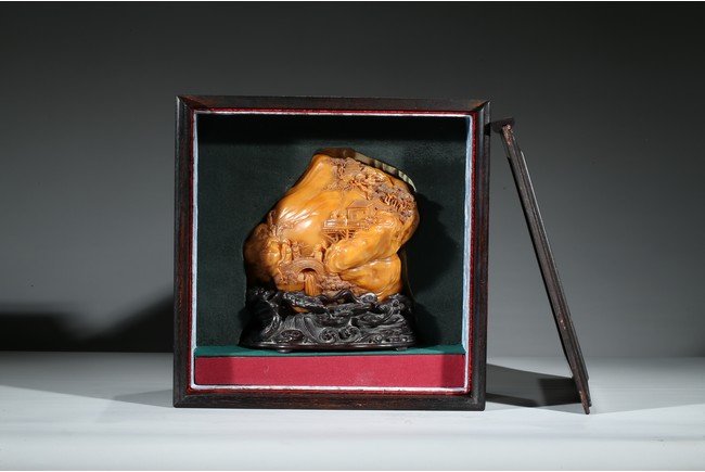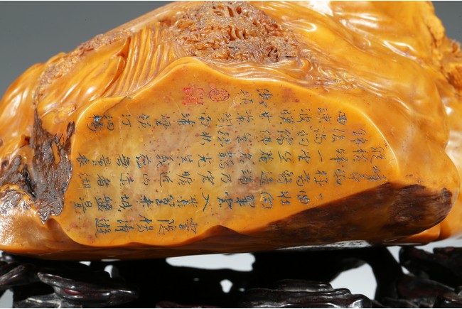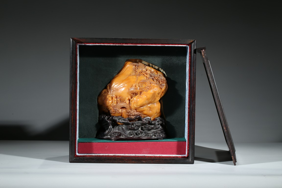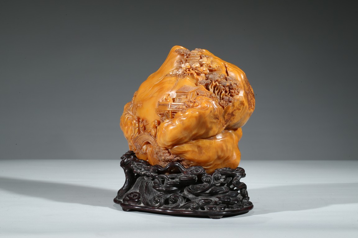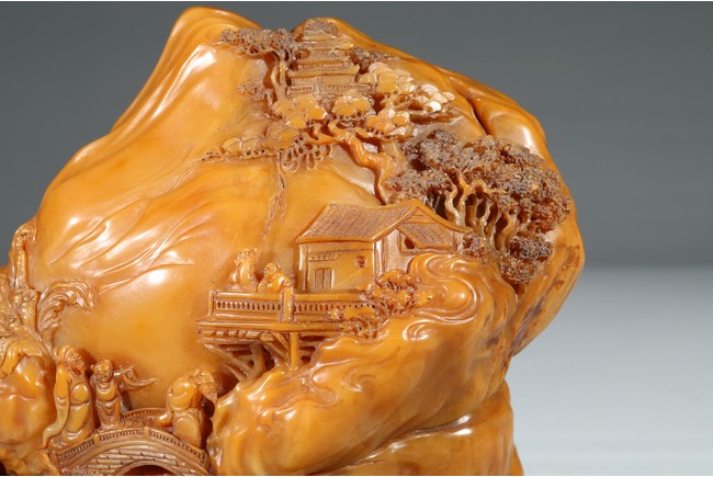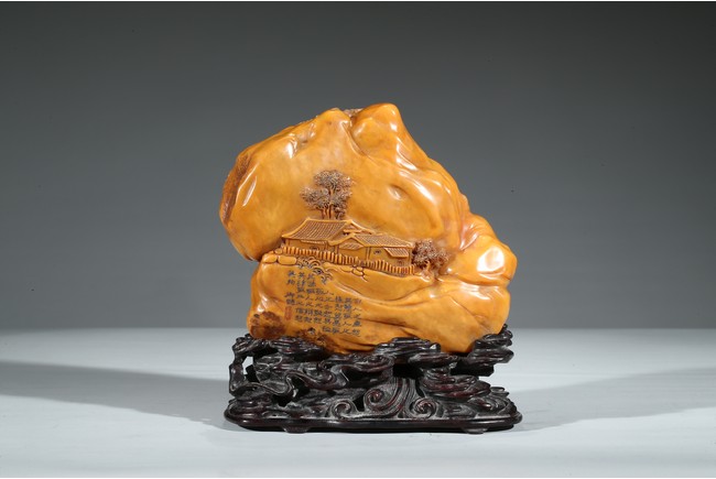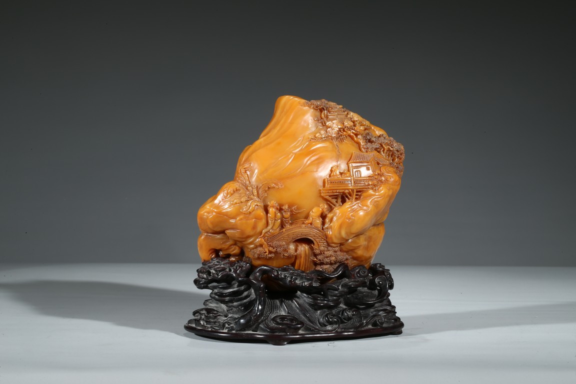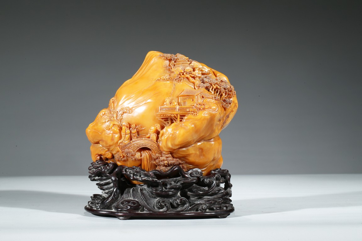 The boulder finely carved to depict various figures standing upon an arched bridge over a falling stream, with huts and trees above, all set in a mountain landscape, the reverse further carved with two huts and an imperial inscription. Qing Dynasty period.