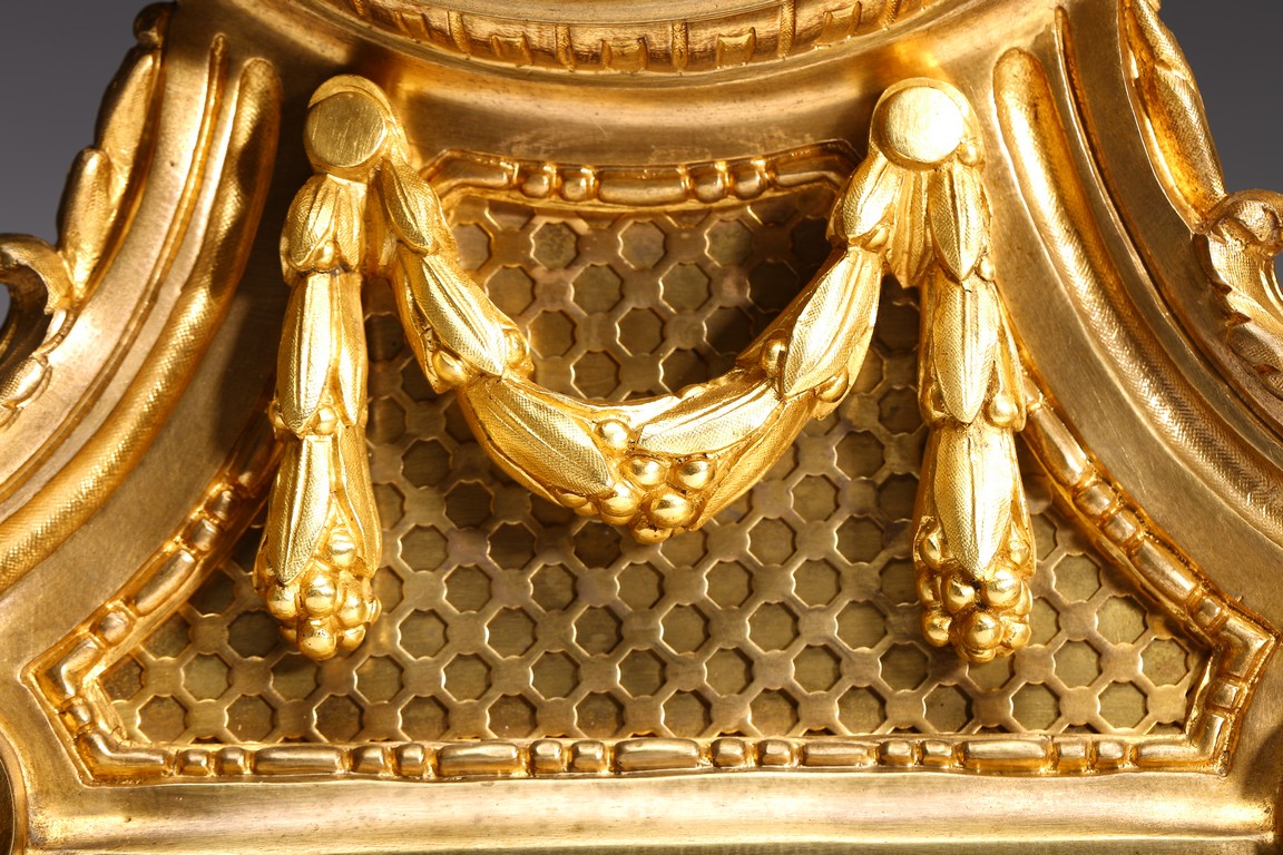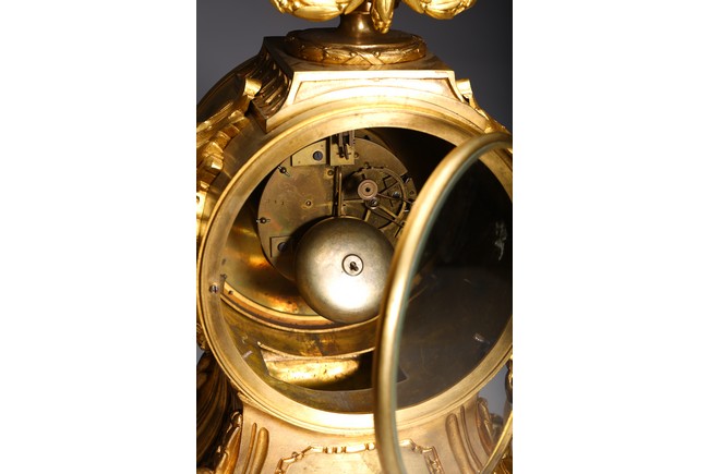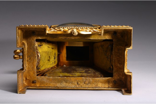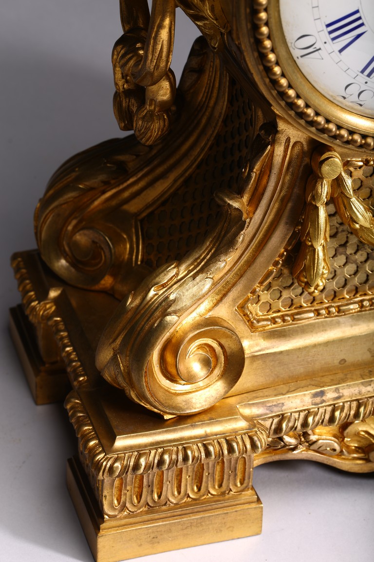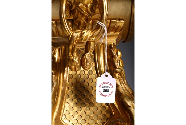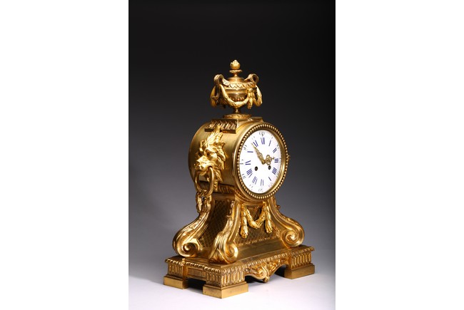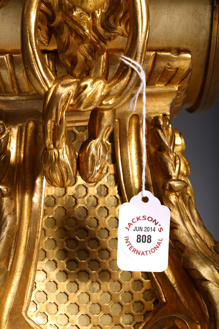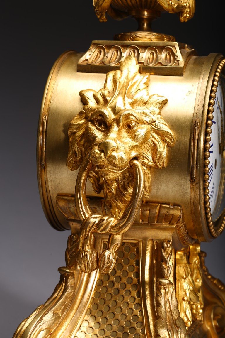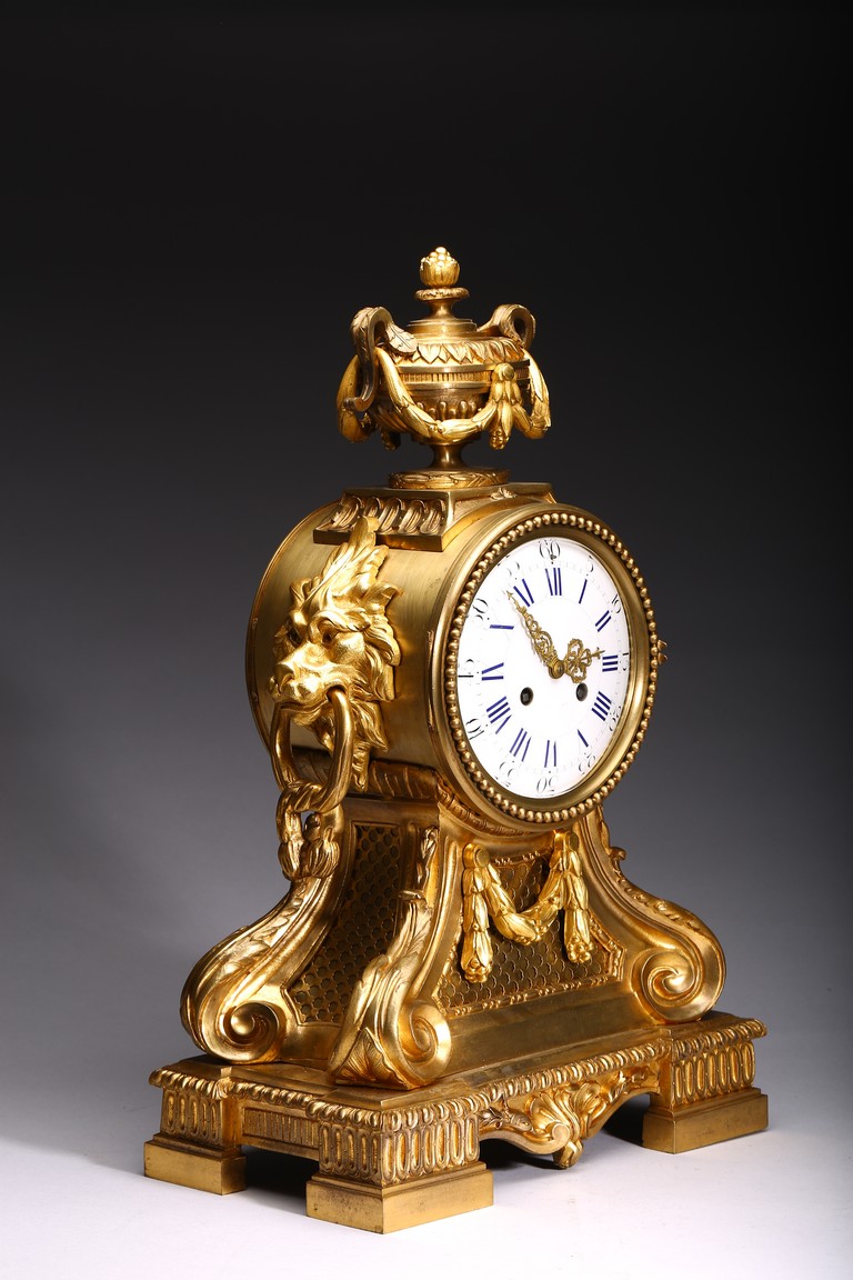 The circular case with enamel dial, flanked by large lion's masks with suspended swag handles, raised on a scroll base and surmounted with a classical urn form finial. Circa 1900.