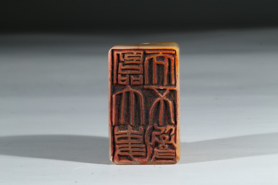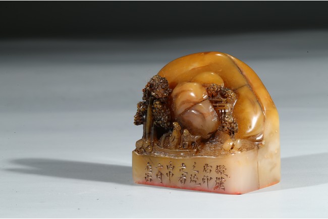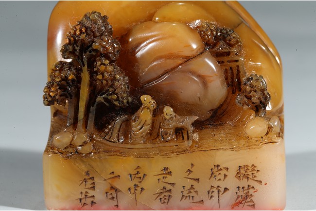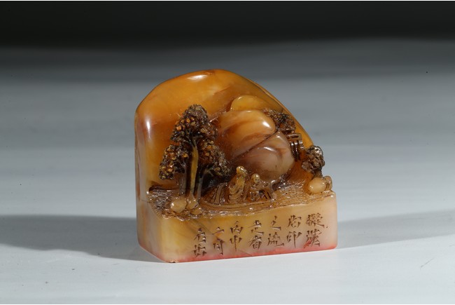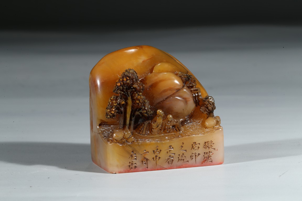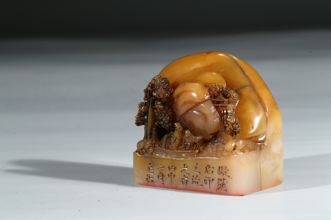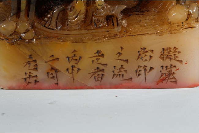 Carved to the top with high relief landscape, the side with inscription, base with six character mark.