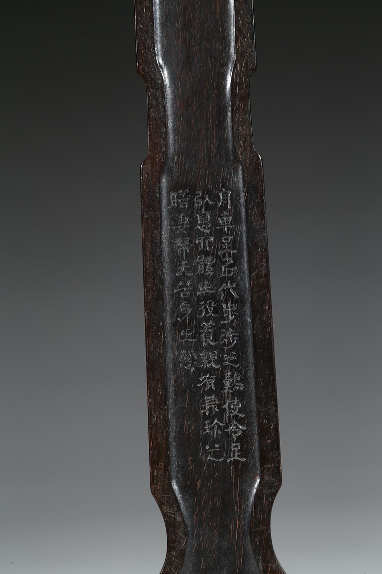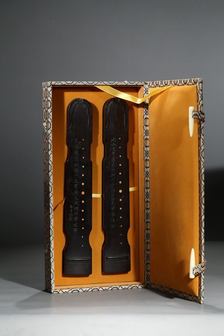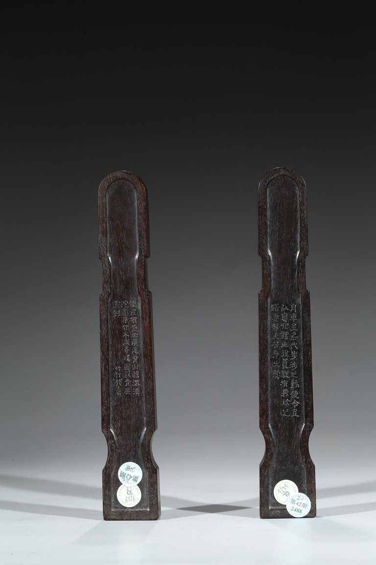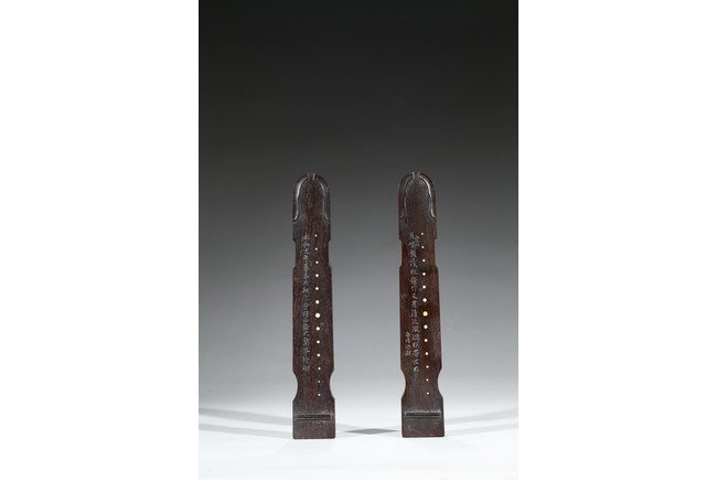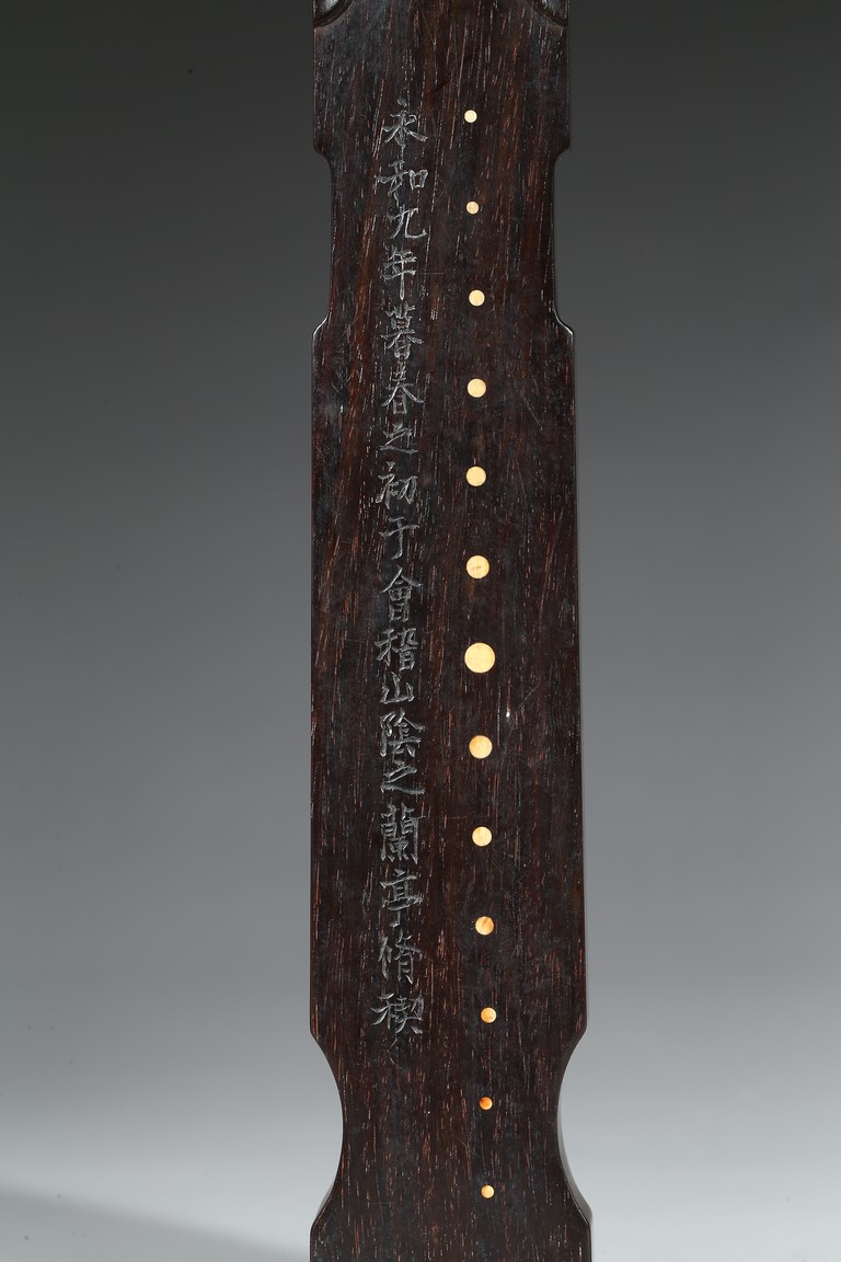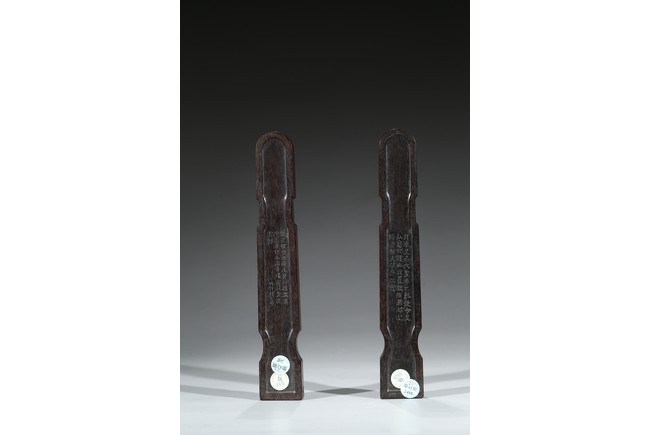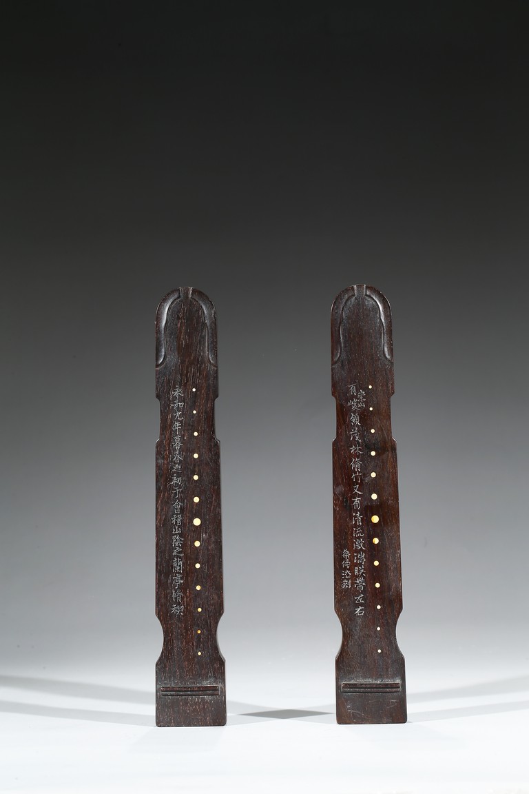 Modelled in the form of qin instrument, each top inscribed in running script with Wang Xizhi's essay Lantingji Xu, signed Xi Zhong; the reverse is finely inscribed in clerical script with excerpts from classical essay by Han Dynasty political theorist Zhong Changtong, the wood is patinated to an attractive dark brown tone. Qing Dynasty period.