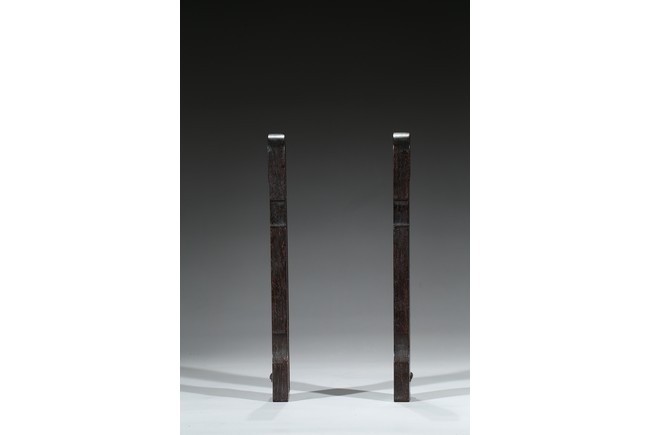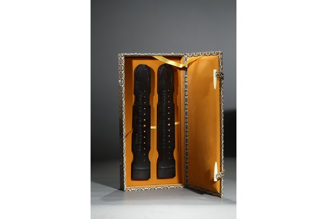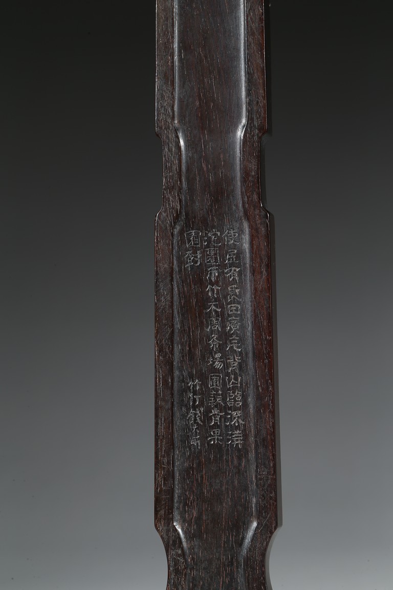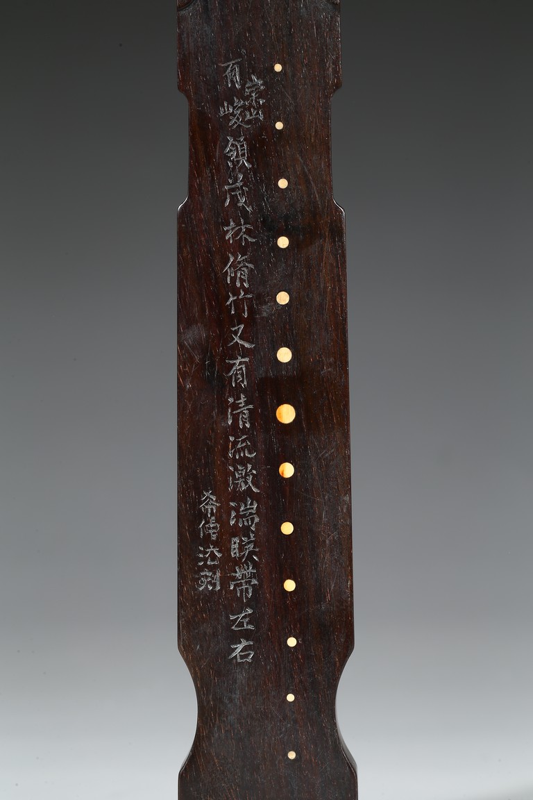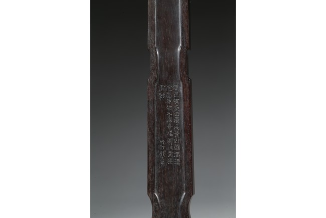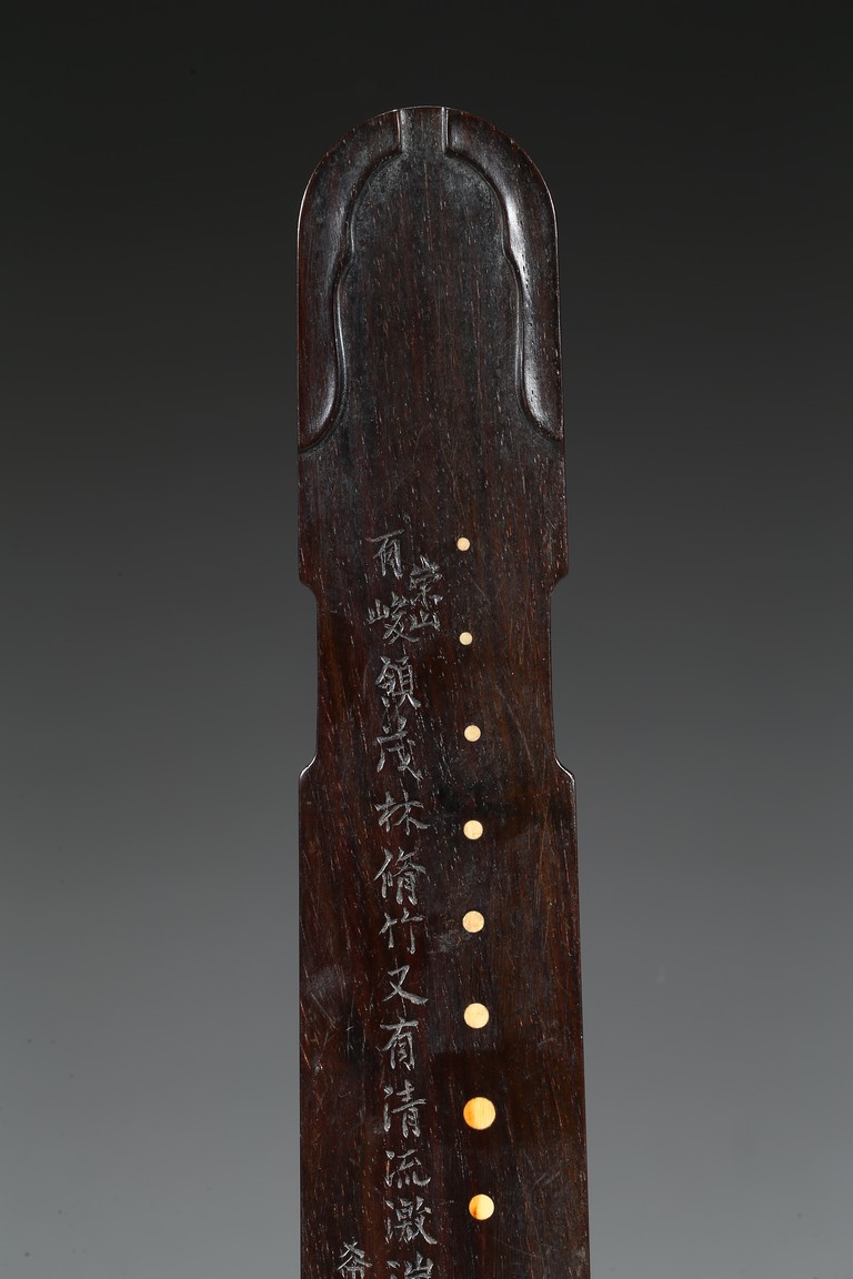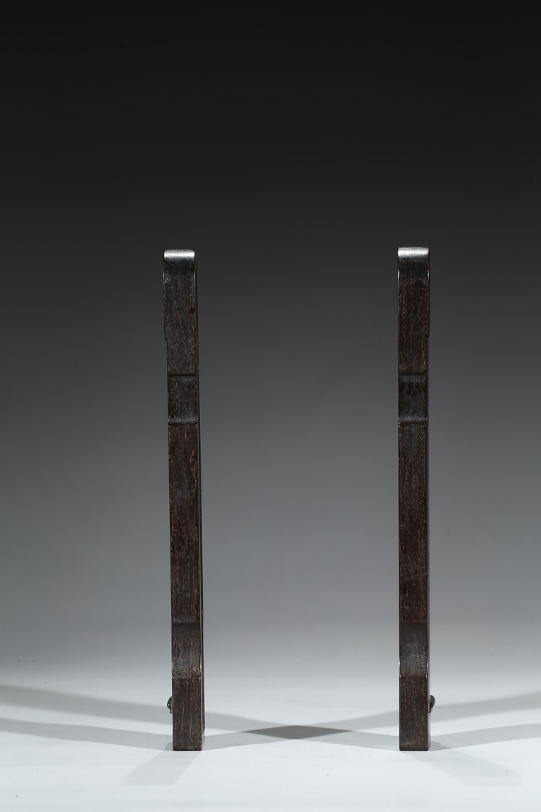 Modelled in the form of qin instrument, each top inscribed in running script with Wang Xizhi's essay Lantingji Xu, signed Xi Zhong; the reverse is finely inscribed in clerical script with excerpts from classical essay by Han Dynasty political theorist Zhong Changtong, the wood is patinated to an attractive dark brown tone. Qing Dynasty period.