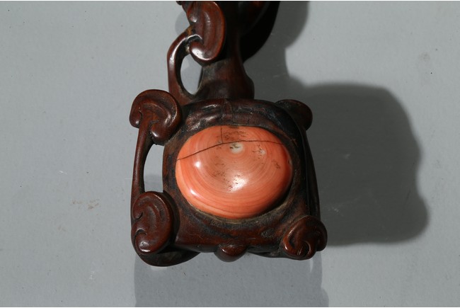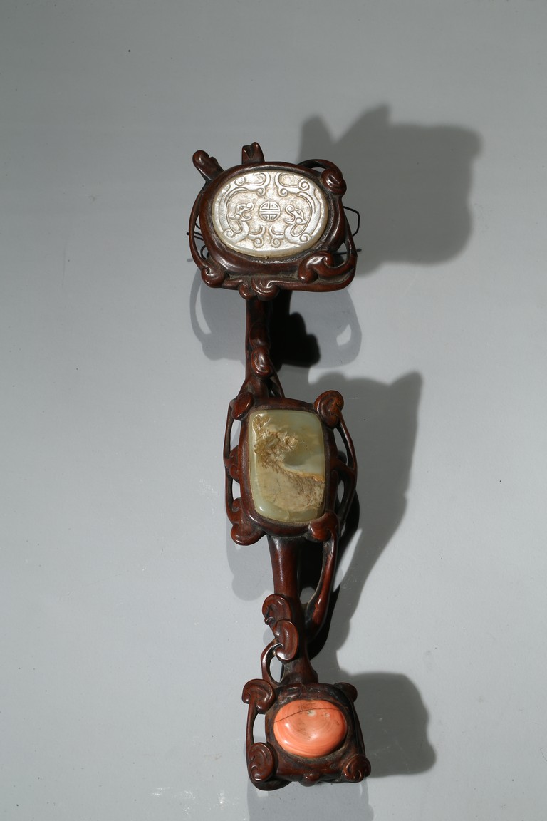 Inlaid with jade on the ruyi head, the body with green jade plaque, the end inlaid with coral.