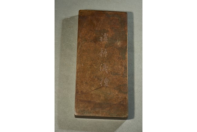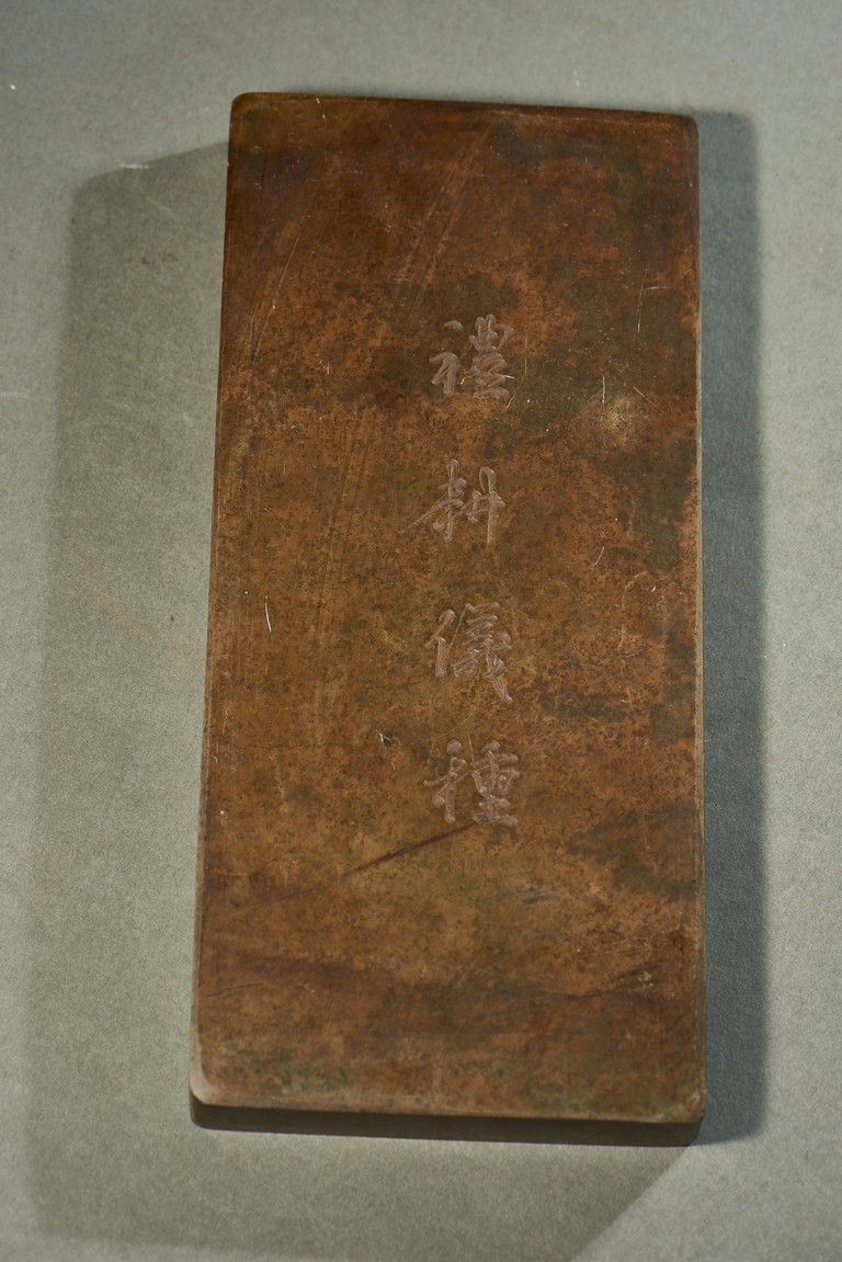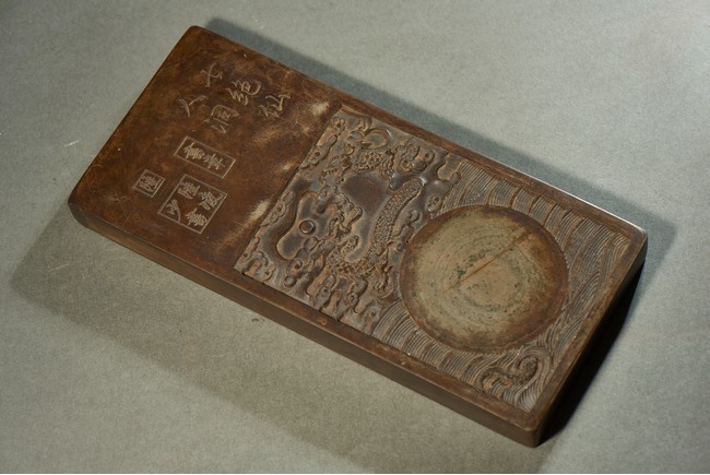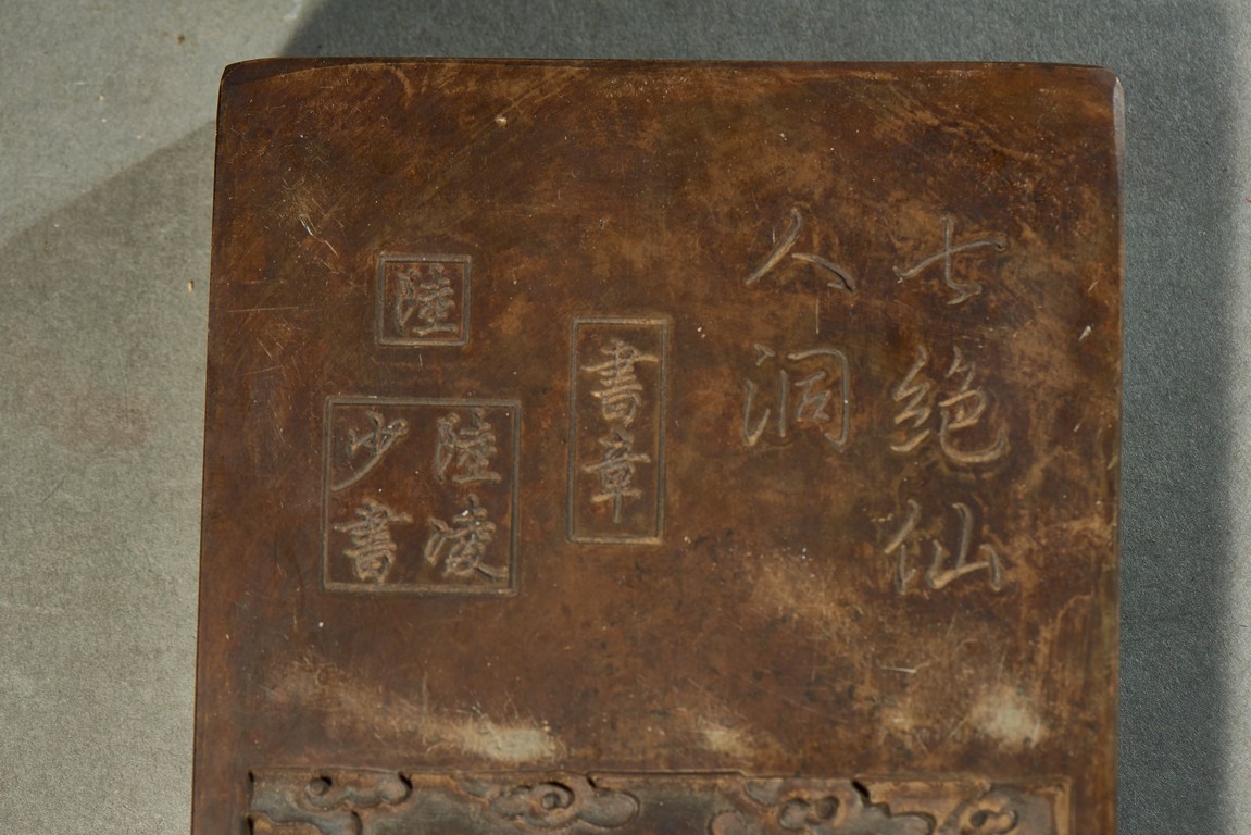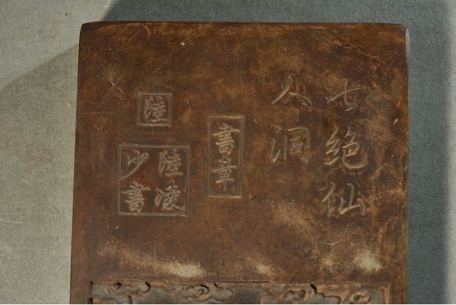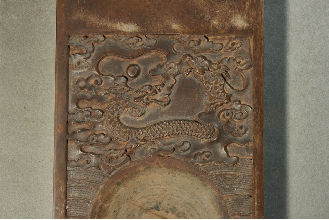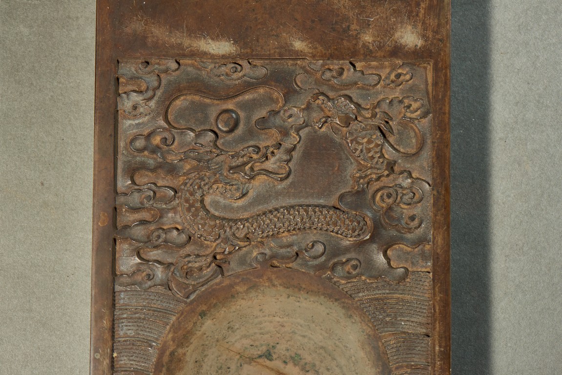 Of rectangular form, carved with dragon and clouds, with seal marks and inscriptions.