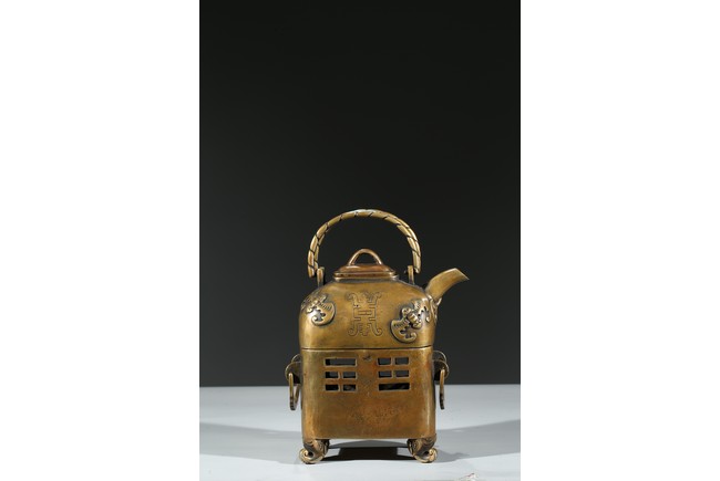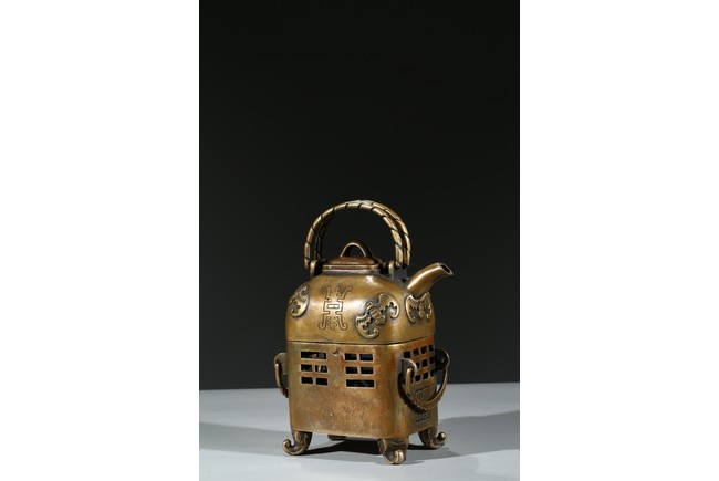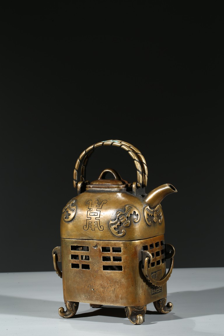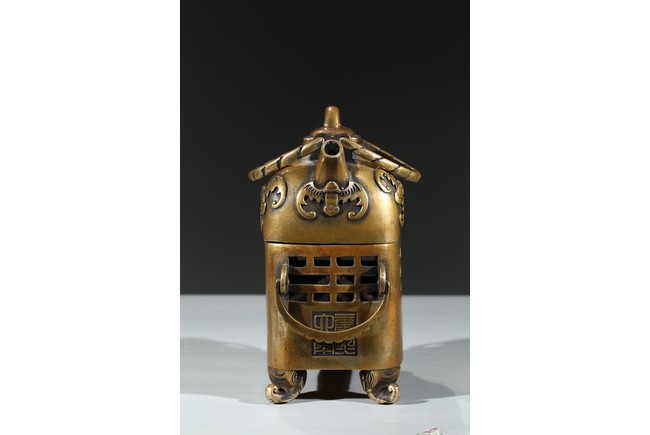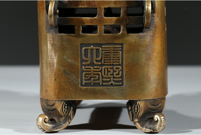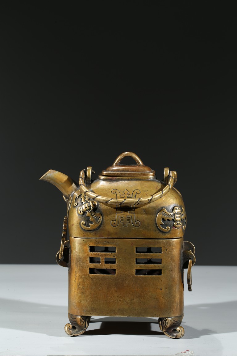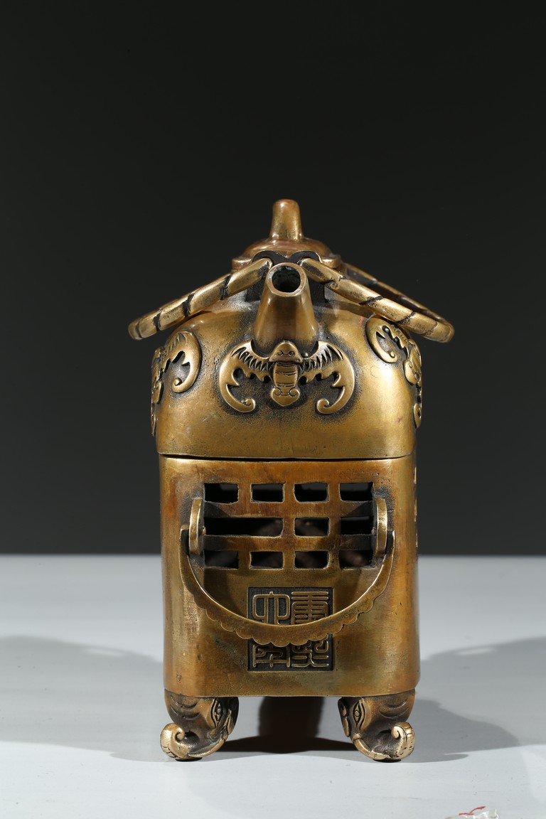 Supported on four elephant head feet, body with openwork bagua motif flanked by two ring handles, the upper section decorated with bat and shou, fitted with cover. Qing Dynasty period.