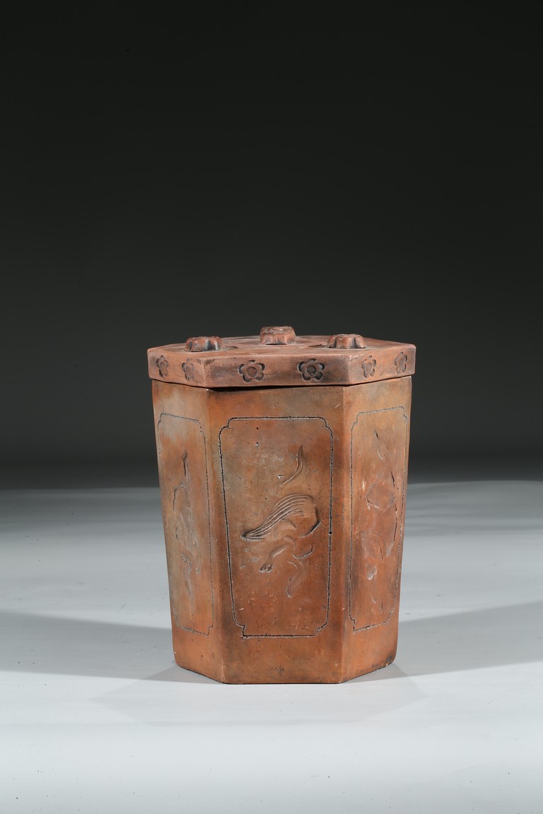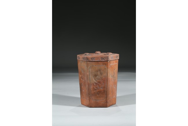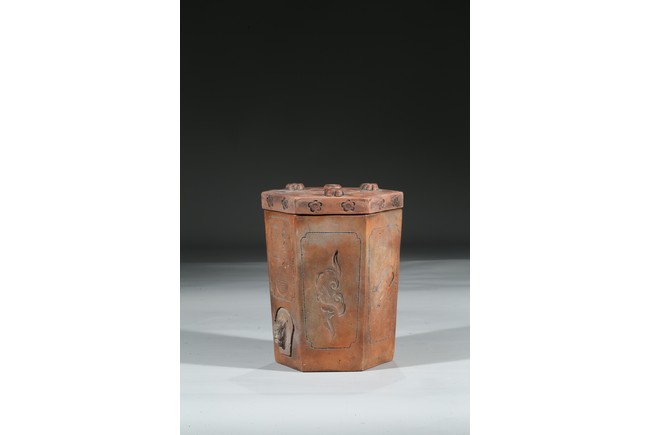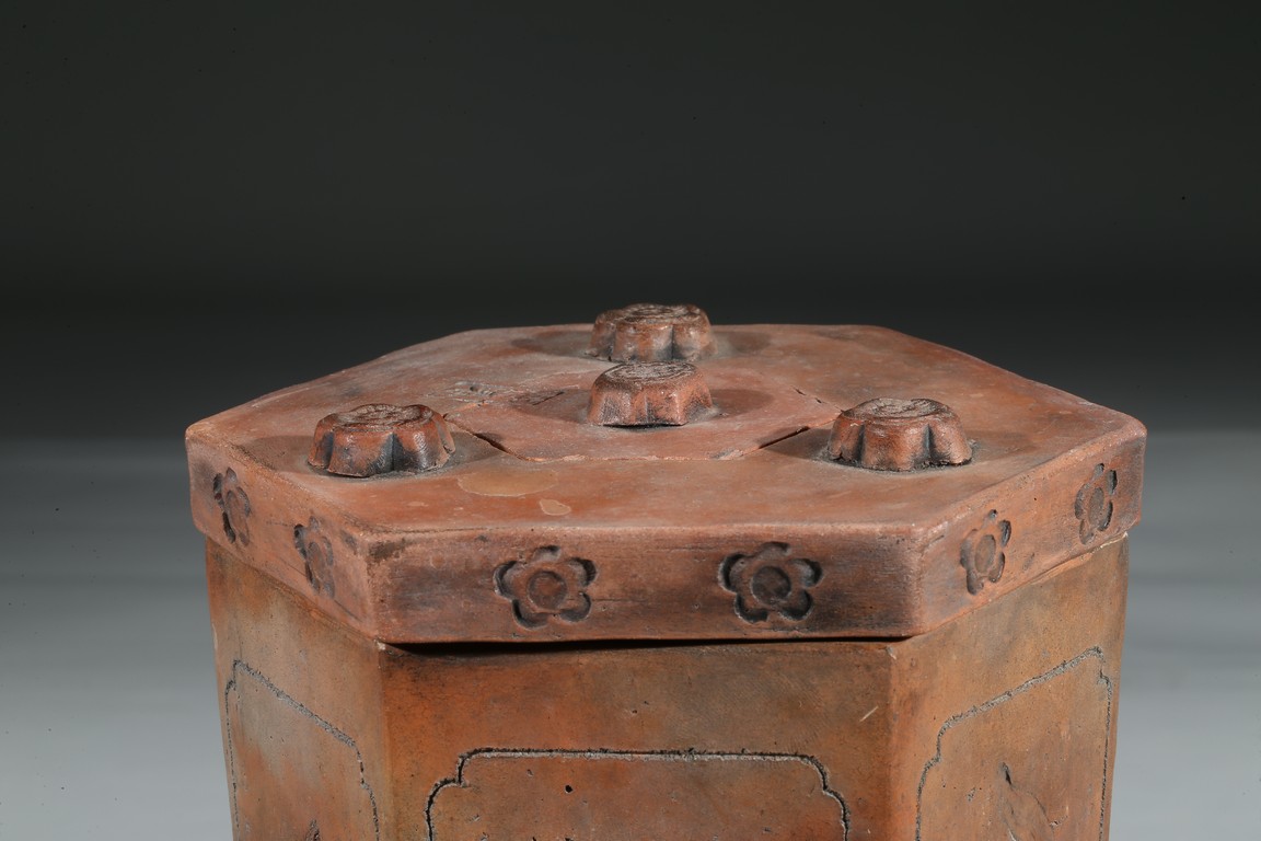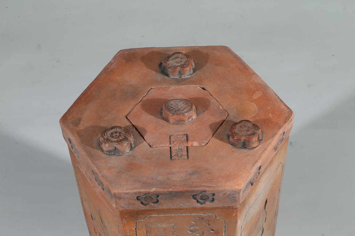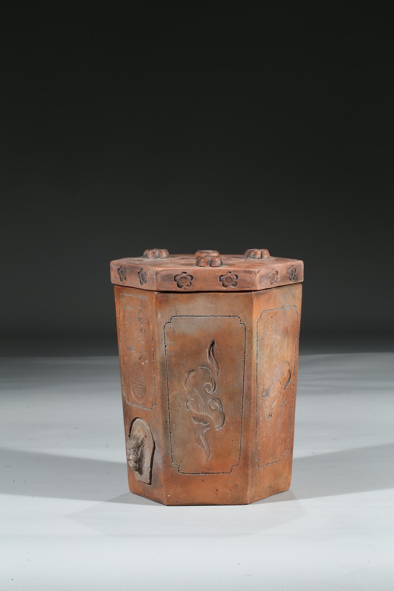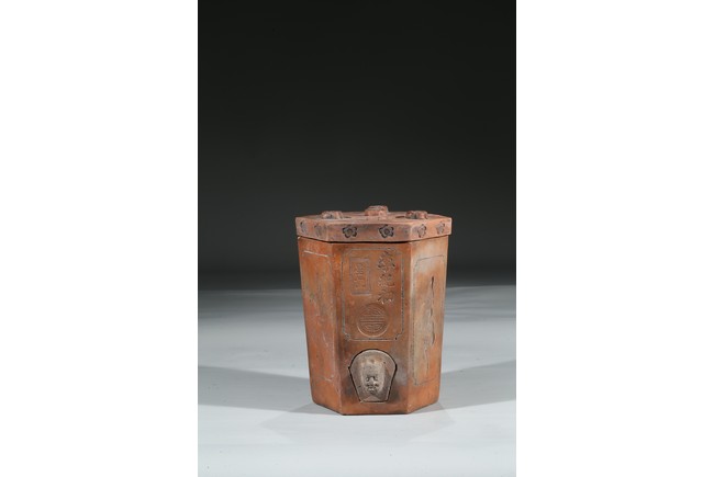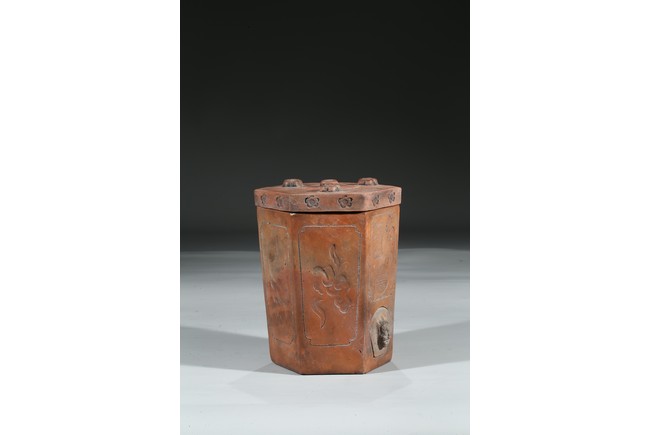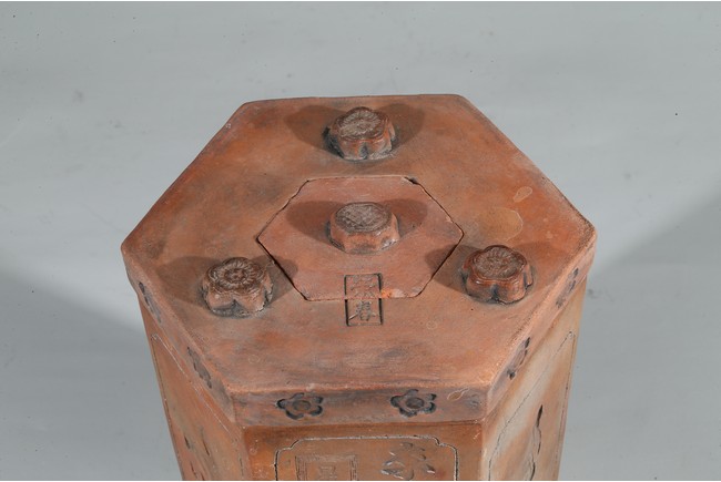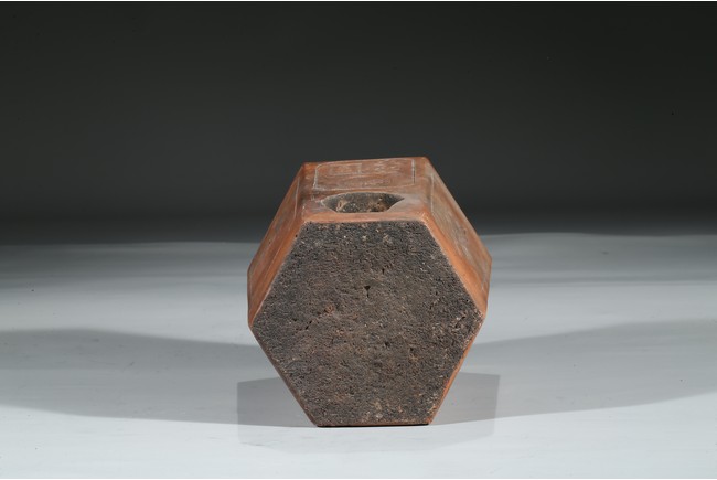 Of hexagonal form, with an opening to the base and a separable top cover, the body with inscription and moulded decorations.