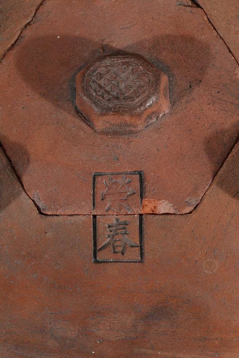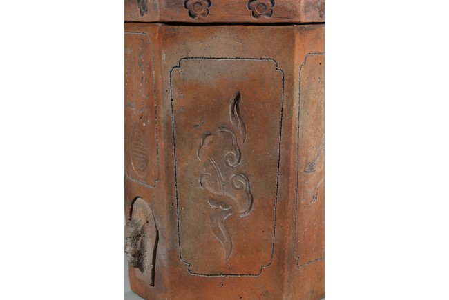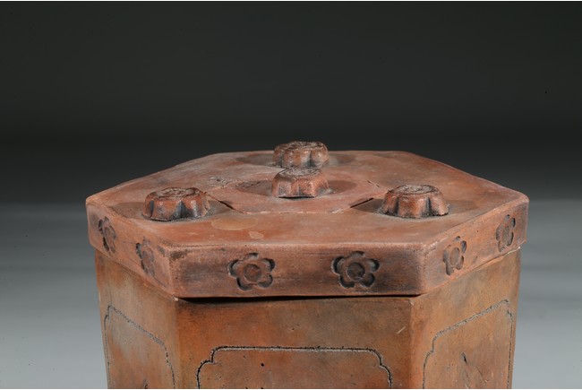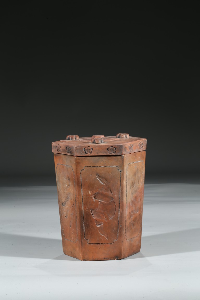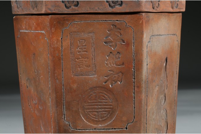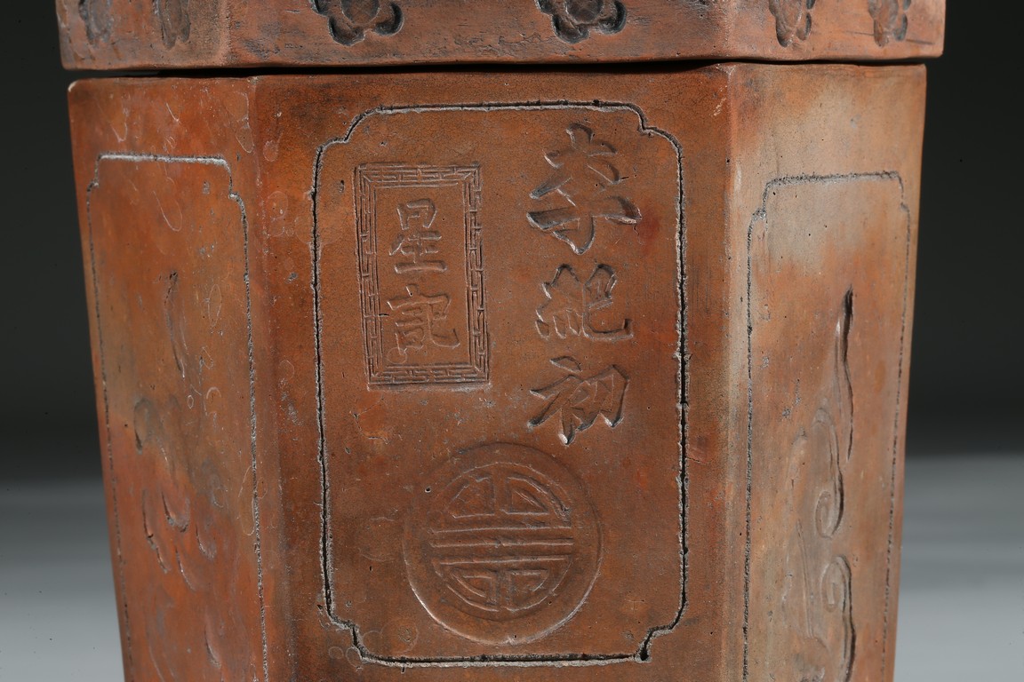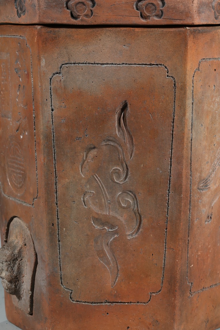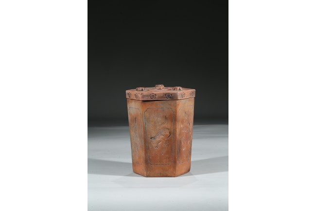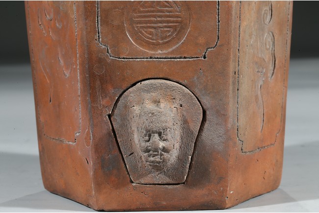 Of hexagonal form, with an opening to the base and a separable top cover, the body with inscription and moulded decorations.