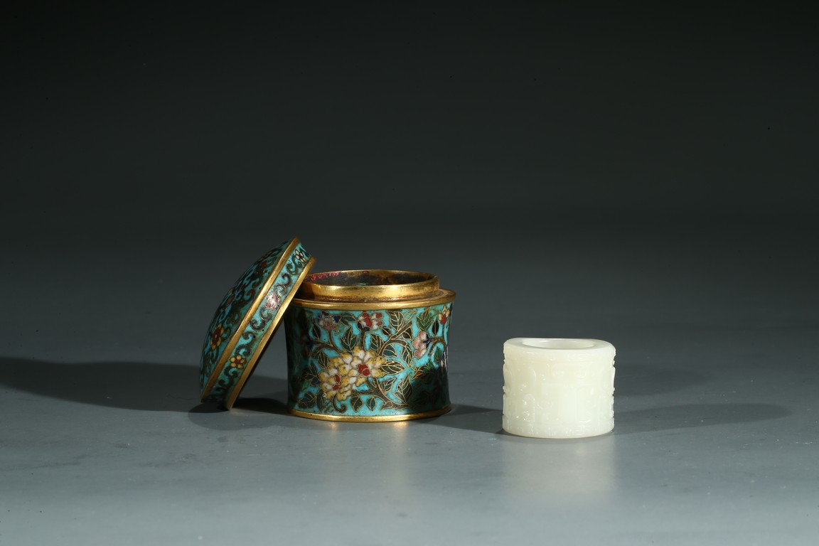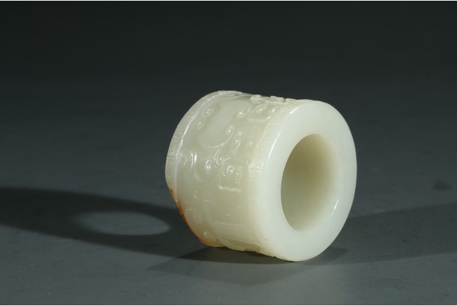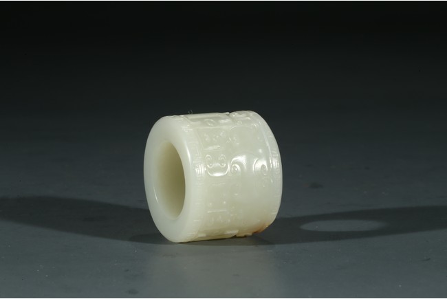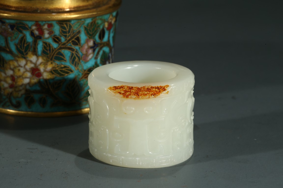 The white jade archer's ring carved with archaistic taotie mask, accompanied with a fitted cloisonne enamel case, the base with four character Qianlong mark.