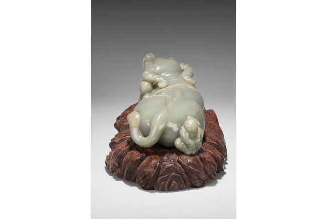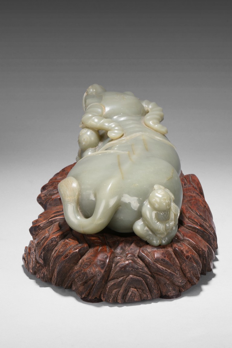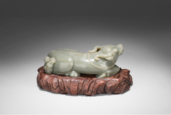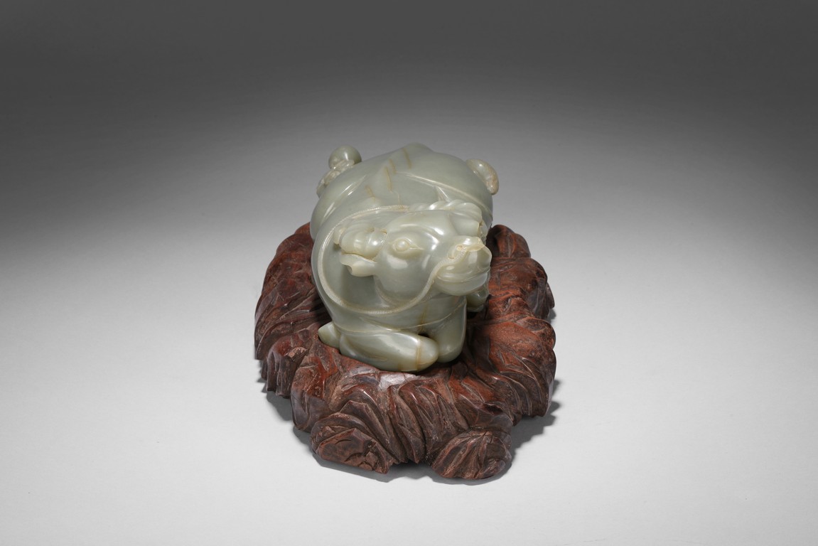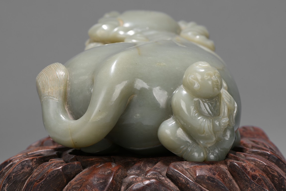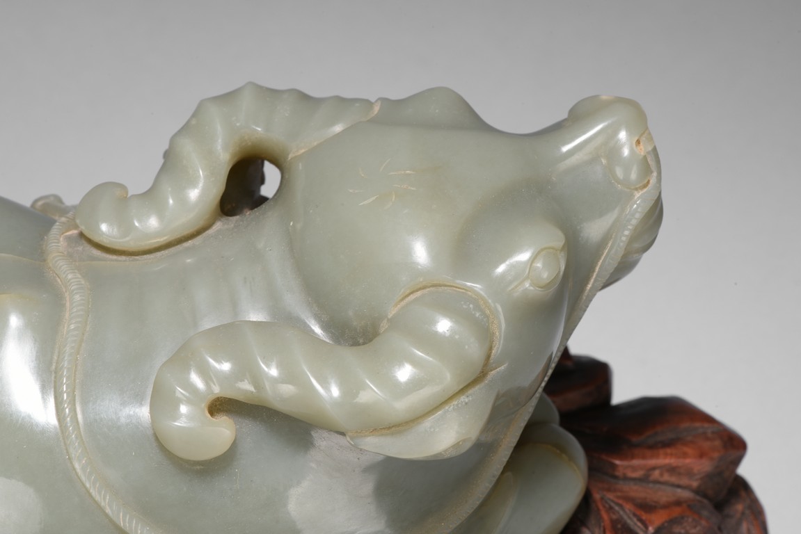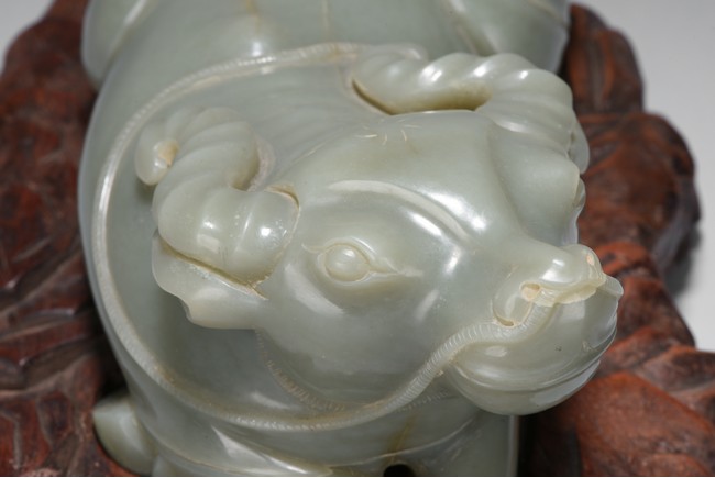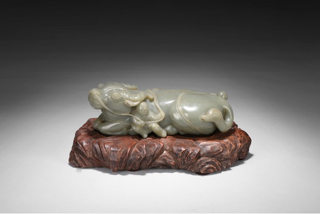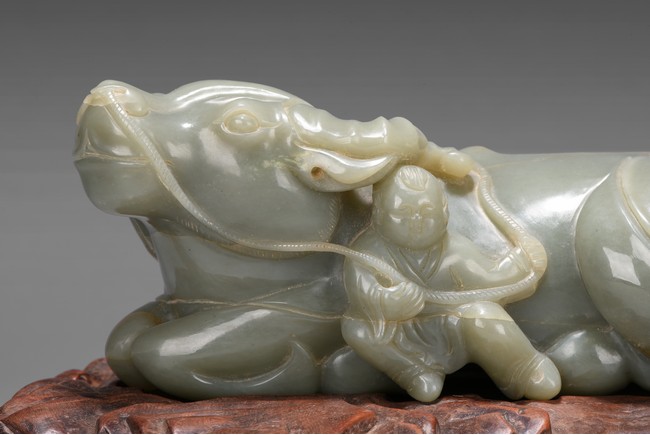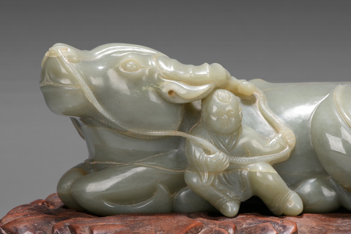 The recumbent buffalo is carved with four feet tucked underneath body, the head slightly raised and tail swept to the left, with a boy sitting beside holding a rope tied through its nostril and over its back, and the other side with a boy holding a large lingzhi. The stone is of even celadon tone with minor russet veins. Accompanied with hardwood carved base imitating the rocky ground. Qing Dynasty period.