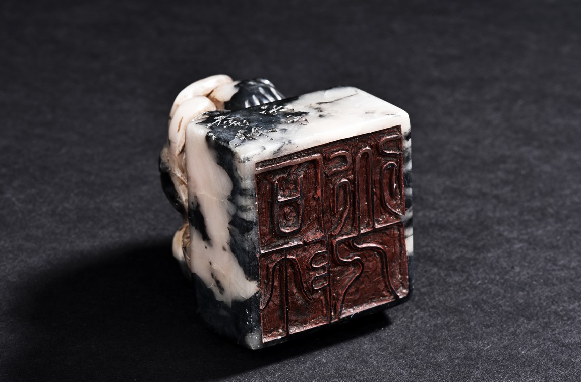 Qing Dynasty period. The seal is surmounted with a buddhist lion, shown with ferocious expression and its head turning back; one side of the seal carved with four characters; the stone is of mottled black and russet tone.